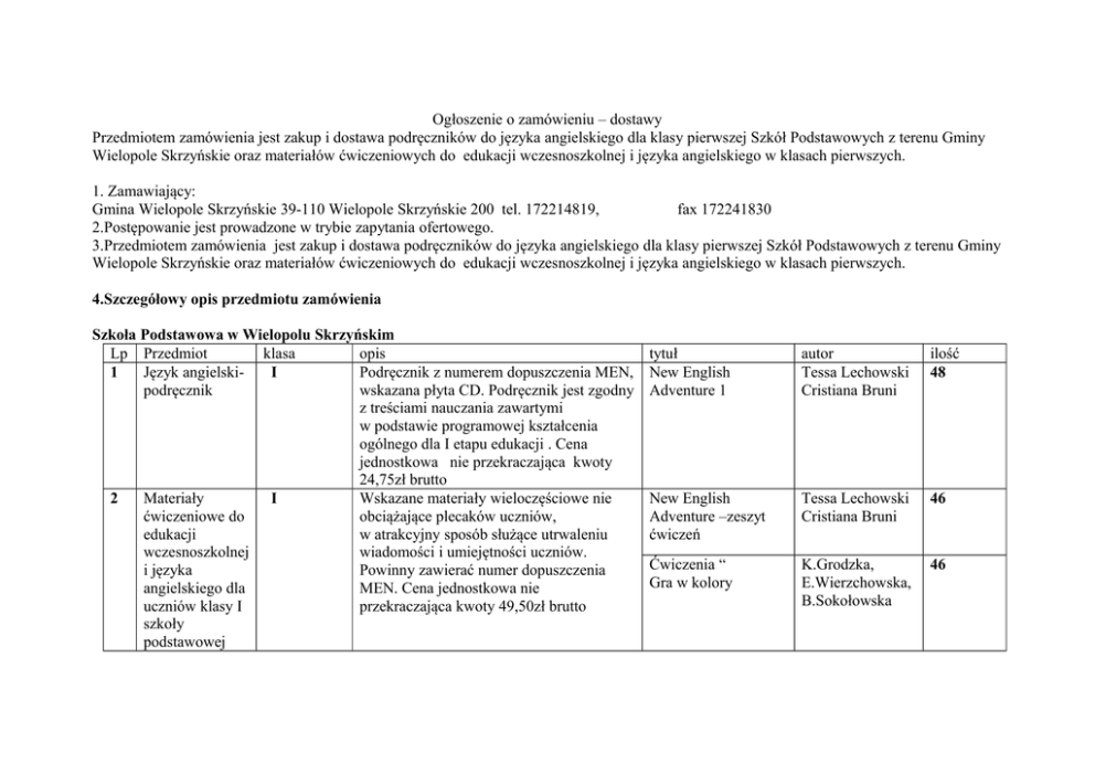 Ogłoszenie o zamówieniu – dostawy Przedmiotem zamówienia jest zakup i dostawa podręczników do języka angielskiego dla klasy pierwszej Szkół Podstawowych z terenu Gminy Wielopole Skrzyńskie oraz materiałów ćwiczeniowych do edukacji wczesnoszkolnej i języka angielskiego w klasach pierwszych. 1. Zamawiający: Gmina Wielopole Skrzyńskie 39-110 Wielopole Skrzyńskie 200 tel. 172214819, fax 172241830 2.Postępowanie jest prowadzone w trybie zapytania ofertowego. 3.Przedmiotem zamówienia jest zakup i dostawa podręczników do języka angielskiego dla klasy pierwszej Szkół Podstawowych z terenu Gminy Wielopole Skrzyńskie oraz materiałów ćwiczeniowych do edukacji wczesnoszkolnej i języka angielskiego w klasach pierwszych. 4.Szczegółowy opis przedmiotu zamówienia Szkoła Podstawowa w Wielopolu Skrzyńskim Lp Przedmiot klasa opis 1 Język angielskiI Podręcznik z numerem dopuszczenia MEN, podręcznik wskazana płyta CD. Podręcznik jest zgodny z treściami nauczania zawartymi w podstawie programowej kształcenia ogólnego dla I etapu edukacji . Cena jednostkowa nie przekraczająca kwoty 24,75zł brutto 2 Materiały I Wskazane materiały wieloczęściowe nie ćwiczeniowe do obciążające plecaków uczniów, edukacji w atrakcyjny sposób służące utrwaleniu wczesnoszkolnej wiadomości i umiejętności uczniów. i języka Powinny zawierać numer dopuszczenia angielskiego dla MEN. Cena jednostkowa nie uczniów klasy I przekraczająca kwoty 49,50zł brutto szkoły podstawowej tytuł New English Adventure 1 autor Tessa Lechowski Cristiana Bruni ilość 48 New English Adventure –zeszyt ćwiczeń Tessa Lechowski Cristiana Bruni 46 Ćwiczenia “ Gra w kolory K.Grodzka, E.Wierzchowska, B.Sokołowska 46 Szkoła Podstawowa w Nawisu Lp 1 Przedmiot Język angielskipodręcznik 2 Materiały ćwiczeniowe do edukacji wczesnoszkolnej i języka angielskiego dla uczniów klasy I szkoły podstawowej klasa I I Szkoła Podstawowa Nr 1 w Brzezinach Lp Przedmiot klasa 1 Język angielskiI podręcznik opis Podręcznik z numerem dopuszczenia MEN, wskazana płyta CD. Podręcznik jest zgodny z treściami nauczania zawartymi w podstawie programowej kształcenia ogólnego dla I etapu edukacji . Cena jednostkowa nie przekraczająca kwoty 24,75zł brutto Wskazane materiały wieloczęściowe nie obciążające plecaków uczniów, w atrakcyjny sposób służące utrwaleniu wiadomości i umiejętności uczniów. Powinny zawierać numer dopuszczenia MEN. Cena jednostkowa nie przekraczająca kwoty 49,50zł brutto tytuł Tiger autor Carlo Read ilość 12 Tiger- zeszyt ćwiczeń Carlo Read 11 Odkrywamy siebie i świat -ćwiczenia Faliszewska, Żaba-Żabińska 11 autor Tessa Lechowski Cristiana Bruni ilość 21 opis tytuł Podręcznik z numerem dopuszczenia MEN, New English wskazana płyta CD. Podręcznik jest zgodny Adventure 1 z treściami nauczania zawartymi w podstawie programowej kształcenia ogólnego dla I etapu edukacji Cena jednostkowa nie przekraczająca kwoty 24,75zł brutto 2 Materiały ćwiczeniowe do edukacji wczesnoszkolnej i języka angielskiego dla uczniów klasy I szkoły podstawowej I Szkoła Podstawowa w Broniszowie Lp Przedmiot klasa 1 Język angielskiI podręcznik 2 Materiały ćwiczeniowe do edukacji wczesnoszkolnej i języka angielskiego dla uczniów klasy I szkoły podstawowej I Wskazane materiały wieloczęściowe nie obciążające plecaków uczniów, w atrakcyjny sposób służące utrwaleniu wiadomości i umiejętności uczniów. Powinny zawierać numer dopuszczenia MEN. Cena jednostkowa nie przekraczająca kwoty 49,50zł brutto opis Podręcznik z numerem dopuszczenia MEN, wskazana płyta CD. Podręcznik jest zgodny z treściami nauczania zawartymi w podstawie programowej kształcenia ogólnego dla I etapu edukacji . Cena jednostkowa nie przekraczająca kwoty 24,75zł brutto Wskazane materiały wieloczęściowe nie obciążające plecaków uczniów, w atrakcyjny sposób służące utrwaleniu wiadomości i umiejętności uczniów. Powinny zawierać numer dopuszczenia MEN. Cena jednostkowa nie przekraczająca kwoty 49,50zł brutto New English Adventure –zeszyt ćwiczeń Ćwiczenia z pomysłemmateriały ćwiczeniowe Tessa Lechowski Cristiana Bruni 20 20 tytuł New English Adventure 1 autor Tessa Lechowski Cristiana Bruni ilość 12 Tropiciele – zeszyt ćwiczeń Banasiuk,Burakowska 11 New English Adventure 1 Tessa Lechowski Cristiana Bruni 11 Szkoła Podstawowa w Gliniku Lp 1 Przedmiot Język angielskipodręcznik 2 Materiały ćwiczeniowe do edukacji wczesnoszkolnej i języka angielskiego dla uczniów klasy I szkoły podstawowej klasa I I opis Podręcznik z numerem dopuszczenia MEN, wskazana płyta CD. Podręcznik jest zgodny z treściami nauczania zawartymi w podstawie programowej kształcenia ogólnego dla I etapu edukacji Cena jednostkowa nie przekraczająca kwoty 24,75zł brutto Wskazane materiały wieloczęściowe nie obciążające plecaków uczniów, w atrakcyjny sposób służące utrwaleniu wiadomości i umiejętności uczniów. Powinny zawierać numer dopuszczenia MEN. Cena jednostkowa nie przekraczająca kwoty 49,50zł brutto tytuł Super Start autor Szpotowicz, Szulc-Kuropacka ilość 22 Super Start activiti – ćwiczenia Szpotowicz Szulc-Kuropacka 21 21 Ćwiczenia z pomysłem Szkoła Podstawowa Nr 2 w Brzezinach- Berdechowie Lp 1 Przedmiot Język angielskipodręcznik klasa I opis tytuł Podręcznik z numerem dopuszczenia MEN, New English wskazana płyta CD. Podręcznik jest zgodny Adventure 1 z treściami nauczania zawartymi w podstawie programowej kształcenia ogólnego dla I etapu edukacji . Cena autor Tessa Lechowski Cristiana Bruni ilość 15 2 Materiały ćwiczeniowe do edukacji wczesnoszkolnej i języka angielskiego dla uczniów klasy I szkoły podstawowej I jednostkowa nie przekraczająca kwoty 24,75zł brutto Wskazane materiały wieloczęściowe nie obciążające plecaków uczniów, w atrakcyjny sposób służące utrwaleniu wiadomości i umiejętności ucz