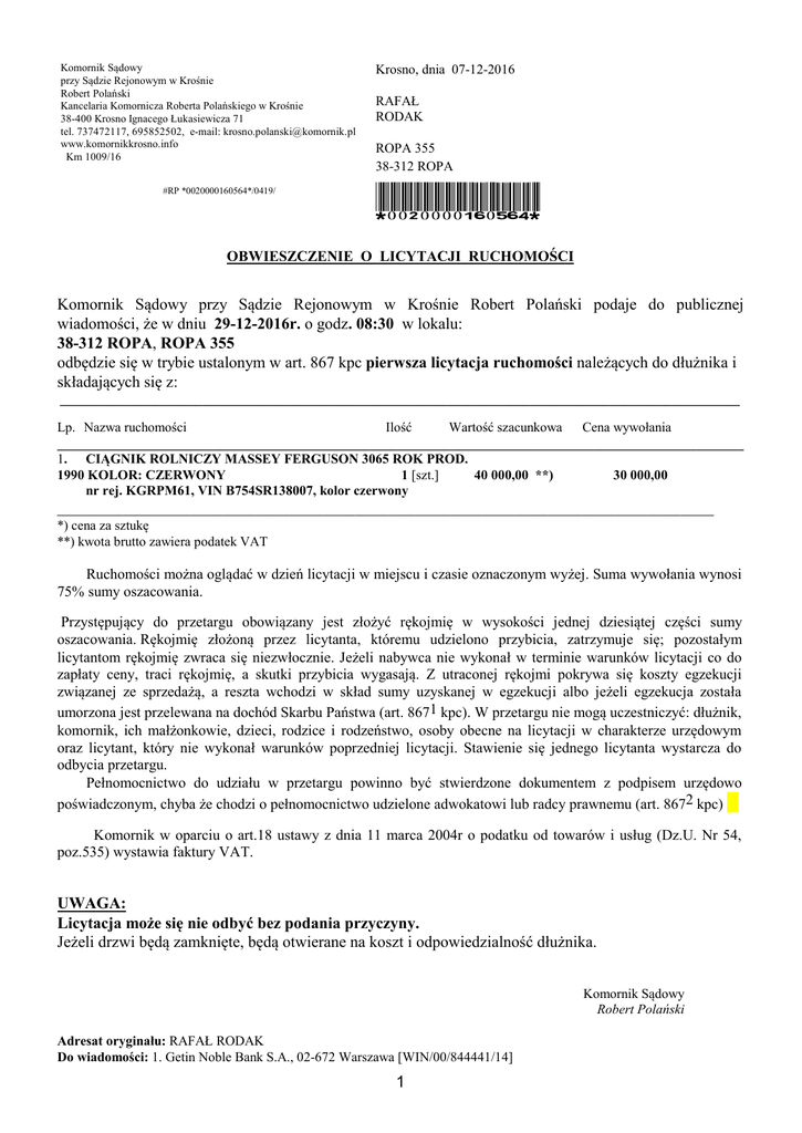 Komornik Sądowy przy Sądzie Rejonowym w Krośnie Robert Polański Kancelaria Komornicza Roberta Polańskiego w Krośnie 38-400 Krosno Ignacego Łukasiewicza 71 tel. 737472117, 695852502, e-mail: [email protected] www.komornikkrosno.info Km 1009/16 #RP *0020000160564*/0419/ Krosno, dnia 07-12-2016 RAFAŁ RODAK ROPA 355 38-312 ROPA *0020000160564* OBWIESZCZENIE O LICYTACJI RUCHOMOŚCI Komornik Sądowy przy Sądzie Rejonowym w Krośnie Robert Polański podaje do publicznej wiadomości, że w dniu 29-12-2016r. o godz. 08:30 w lokalu: 38-312 ROPA, ROPA 355 odbędzie się w trybie ustalonym w art. 867 kpc pierwsza licytacja ruchomości należących do dłużnika i składających się z: ____________________________________________________________________________________________________ Lp. Nazwa ruchomości Ilość Wartość szacunkowa Cena wywołania _____________________________________________________________________________________________________ 1. CIĄGNIK ROLNICZY MASSEY FERGUSON 3065 ROK PROD. 1990 KOLOR: CZERWONY 1 [szt.] 40 000,00 **) 30 000,00 nr rej. KGRPM61, VIN B754SR138007, kolor czerwony _______________________________________________________________________________________________________________________ *) cena za sztukę **) kwota brutto zawiera podatek VAT Ruchomości można oglądać w dzień licytacji w miejscu i czasie oznaczonym wyżej. Suma wywołania wynosi 75% sumy oszacowania. Przystępujący do przetargu obowiązany jest złożyć rękojmię w wysokości jednej dziesiątej części sumy oszacowania. Rękojmię złożoną przez licytanta, któremu udzielono przybicia, zatrzymuje się; pozostałym licytantom rękojmię zwraca się niezwłocznie. Jeżeli nabywca nie wykonał w terminie warunków licytacji co do zapłaty ceny, traci rękojmię, a skutki przybicia wygasają. Z utraconej rękojmi pokrywa się koszty egzekucji związanej ze sprzedażą, a reszta wchodzi w skład sumy uzyskanej w egzekucji albo jeżeli egzekucja została umorzona jest przelewana na dochód Skarbu Państwa (art. 8671 kpc). W przetargu nie mogą uczestniczyć: dłużnik, komornik, ich małżonkowie, dzieci, rodzice i rodzeństwo, osoby obecne na licytacji w charakterze urzędowym oraz licytant, który nie wykonał warunków poprzedniej licytacji. Stawienie się jednego licytanta wystarcza do odbycia przetargu. Pełnomocnictwo do udziału w przetargu powinno być stwierdzone dokumentem z podpisem urzędowo poświadczonym, chyba że chodzi o pełnomocnictwo udzielone adwokatowi lub radcy prawnemu (art. 8672 kpc) Komornik w oparciu o art.18 ustawy z dnia 11 marca 2004r o podatku od towarów i usług (Dz.U. Nr 54, poz.535) wystawia faktury VAT. UWAGA: Licytacja może się nie odbyć bez podania przyczyny. Jeżeli drzwi będą zamknięte, będą otwierane na koszt i odpowiedzialność dłużnika. Komornik Sądowy Robert Polański Adresat oryginału: RAFAŁ RODAK Do wiadomości: 1. Getin Noble Bank S.A., 02-672 Warszawa [WIN/00/844441/14] 1 2. Sąd Rejonowy w Gorlicach, 38-300 GORLICE 3. a/a 2