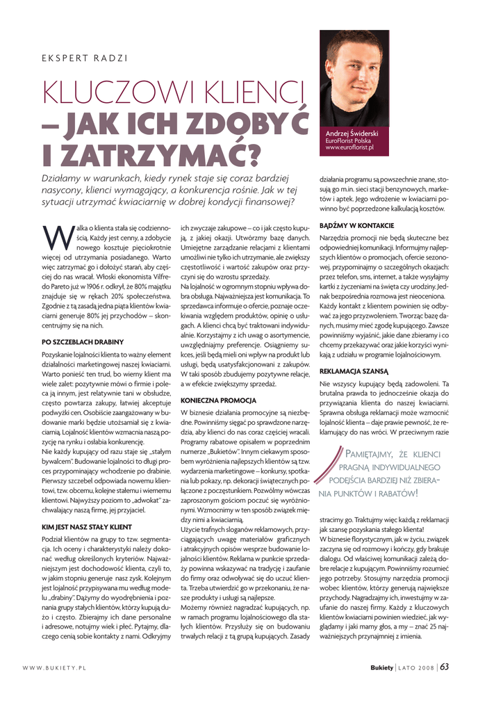EKSPERT RADZI KLUCZOWI KLIENCI – JAK ICH ZDOBYĆ I ZATRZYMAĆ? Działamy w warunkach, kiedy rynek staje się coraz bardziej nasycony, klienci wymagający, a konkurencja rośnie. Jak w tej sytuacji utrzymać kwiaciarnię w dobrej kondycji finansowej? W alka o klienta stała się codziennością. Każdy jest cenny, a zdobycie nowego kosztuje pięciokrotnie więcej od utrzymania posiadanego. Warto więc zatrzymać go i dołożyć starań, aby częściej do nas wracał. Włoski ekonomista Vilfredo Pareto już w 1906 r. odkrył, że 80% majątku znajduje się w rękach 20% społeczeństwa. Zgodnie z tą zasadą jedna piąta klientów kwiaciarni generuje 80% jej przychodów – skoncentrujmy się na nich. PO SZCZEBLACH DRABINY Pozyskanie lojalności klienta to ważny element działalności marketingowej naszej kwiaciarni. Warto ponieść ten trud, bo wierny klient ma wiele zalet: pozytywnie mówi o firmie i poleca ją innym, jest relatywnie tani w obsłudze, często powtarza zakupy, łatwiej akceptuje podwyżki cen. Osobiście zaangażowany w budowanie marki będzie utożsamiał się z kwiaciarnią. Lojalność klientów wzmacnia naszą pozycję na rynku i osłabia konkurencję. Nie każdy kupujący od razu staje się „stałym bywalcem”. Budowanie lojalności to długi proces przypominający wchodzenie po drabinie. Pierwszy szczebel odpowiada nowemu klientowi, tzw. obcemu, kolejne stałemu i wiernemu klientowi. Najwyższy poziom to „adwokat” zachwalający naszą firmę, jej przyjaciel. KIM JEST NASZ STAŁY KLIENT Podział klientów na grupy to tzw. segmentacja. Ich oceny i charakterystyki należy dokonać według określonych kryteriów. Najważniejszym jest dochodowość klienta, czyli to, w jakim stopniu generuje nasz zysk. Kolejnym jest lojalność przypisywana mu według modelu „drabiny”. Dążymy do wyodrębnienia i poznania grupy stałych klientów, którzy kupują dużo i często. Zbierajmy ich dane personalne i adresowe, notujmy wiek i płeć. Pytajmy, dlaczego cenią sobie kontakty z nami. Odkryjmy W W W. B U K I E T Y. P L ich zwyczaje zakupowe – co i jak często kupują, z jakiej okazji. Utwórzmy bazę danych. Umiejętne zarządzanie relacjami z klientami umożliwi nie tylko ich utrzymanie, ale zwiększy częstotliwość i wartość zakupów oraz przyczyni się do wzrostu sprzedaży. Na lojalność w ogromnym stopniu wpływa dobra obsługa. Najważniejsza jest komunikacja. To sprzedawca informuje o ofercie, poznaje oczekiwania względem produktów, opinię o usługach. A klienci chcą być traktowani indywidualnie. Korzystajmy z ich uwag o asortymencie, uwzględniajmy preferencje. Osiągniemy sukces, jeśli będą mieli oni wpływ na produkt lub usługi, będą usatysfakcjonowani z zakupów. W taki sposób zbudujemy pozytywne relacje, a w efekcie zwiększymy sprzedaż. KONIECZNA PROMOCJA W biznesie działania promocyjne są niezbędne. Powinniśmy sięgać po sprawdzone narzędzia, aby klienci do nas coraz częściej wracali. Programy rabatowe opisałem w poprzednim numerze „Bukietów”. Innym ciekawym sposobem wyróżnienia najlepszych klientów są tzw. wydarzenia marketingowe – konkursy, spotkania lub pokazy, np. dekoracji świątecznych połączone z poczęstunkiem. Pozwólmy wówczas zaproszonym gościom poczuć się wyróżnionymi. Wzmocnimy w ten sposób związek między nimi a kwiaciarnią. Użycie trafnych sloganów reklamowych, przyciągających uwagę materiałów graficznych i atrakcyjnych opisów wesprze budowanie lojalności klientów. Reklama w punkcie sprzedaży powinna wskazywać na tradycję i zaufanie do firmy oraz odwoływać się do uczuć klienta. Trzeba utwierdzić go w przekonaniu, że nasze produkty i usługi są najlepsze. Możemy również nagradzać kupujących, np. w ramach programu lojalnościowego dla stałych klientów. Przysłuży się on budowaniu trwałych relacji z tą grupą kupujących. Zasady Andrzej Świderski EuroFlorist Polska www.euroflorist.pl działania programu są powszechnie znane, stosują go m.in. sieci stacji benzynowych, marketów i aptek. Jego wdrożenie w kwiaciarni powinno być poprzedzone kalkulacją kosztów. BĄDŹMY W KONTAKCIE Narzędzia promocji nie będą skuteczne bez odpowiedniej komunikacji. Informujmy najlepszych klientów o promocjach, ofercie sezonowej, przypominajmy o szczególnych okazjach: przez telefon, sms, internet, a także wysyłajmy kartki z życzeniami na święta czy urodziny. Jednak bezpośrednia rozmowa jest nieoceniona. Każdy kontakt z klientem powinien się odbywać za jego przyzwoleniem. Tworząc bazę danych, musimy mieć zgodę kupującego. Zawsze powinniśmy wyjaśnić, jakie dane zbieramy i co chcemy przekazywać oraz jakie korzyści wynikają z udziału w programie lojalnościowym. REKLAMACJA SZANSĄ Nie wszyscy kupujący będą zadowoleni. Ta brutalna prawda to jednocześnie okazja do przywiązania klienta do naszej kwiaciarni. Sprawna obsługa reklamacji może wzmocnić lojalność klienta – daje prawie pewność, że reklamujący do nas wróci. W przeciwnym razie PAMIĘTAJMY, ŻE KLIENCI PRAGNĄ INDYWIDUALNEGO PODEJŚCIA BARDZIEJ NIŻ ZBIERANIA PUNKTÓW I RABATÓW! stracimy go. Traktujmy więc każdą z reklamacji jak szansę pozyskania stałego klienta! W biznesie florystycznym, jak w życiu, związek zaczyna się od rozmowy i kończy, gdy brakuje dialogu. Od właściwej komunikacji zależą dobre relacje z kupującym. Powinniśmy rozumieć jego potrzeby. Stosujmy narzędzia promocji wobec klientów, którzy generują największe przychody. Nagradzajmy ich, inwestujmy w zaufanie do naszej firmy. Każdy z kluczowych klientów kwiaciarni powinien wiedzieć, jak wyglądamy i jaki mamy głos, a my – znać 25 najważniejszych przynajmniej z imienia. | Bukiety L A T O 2 0 0 8 | 63