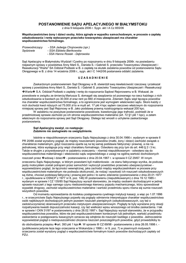 POSTANOWIENIE SĄDU APELACYJNEGO W BIAŁYMSTOKU z dnia 9 listopada 2006 r. Sygn. akt I A Cz 855/06 Współuczestnictwo żony i dzieci osoby, która zginęła w wypadku samochodowym, w procesie o zapłatę odszkodowania i rentę wytoczonym przeciwko towarzystwu ubezpieczeń ma charakter współuczestnictwa formalnego. Przewodniczący Sędziowie - SSA Jadwiga Chojnowska (spr.) - SSA Elżbieta Bieńkowska - SSA Hanna Rosiak - Dąbrowska Sąd Apelacyjny w Białymstoku Wydział I Cywilny po rozpoznaniu w dniu 9 listopada 2006r. na posiedzeniu niejawnym sprawy z powództwa Anny Marii S., Daniela S. i Gabrieli S. przeciwko Towarzystwu Ubezpieczeń i Reasekuracji "Warta" SA Oddział Podlaski w B. o zapłatę na skutek zażalenia powodów od postanowienia Sądu Okręgowego w B. z dnia 14 września 2006 r., sygn. akt I C 1442/06 postanawia oddalić zażalenie. UZASADNIENIE Zaskarżonym postanowieniem Sąd Okręgowy w B. stwierdził swą niewłaściwość rzeczową i przekazał sprawę z powództwa Anny Marii S., Daniela S. i Gabrieli S. przeciwko Towarzystwu Ubezpieczeń i Reasekuracji �Warta� S.A. Oddział Podlaski o zapłatę i rentę do rozpoznania Sądowi Rejonowemu w B. Wskazał, że powodowie w związku ze śmiercią Mariusza S, domagali się zasądzenia od pozwanego na rzecz każdego z nich odszkodowania w kwotach po 30.000 zł oraz rent po 660 zł miesięcznie. Zdaniem Sądu więź łącząca powodów ma charakter współuczestnictwa formalnego, a to ograniczone jest wymogiem właściwości sądu. Skoro każdy z nich dochodzi kwot niższych od 75.000 zł to w myśl art. 17 pkt 4 kpc sądem rzeczowo właściwym do rozpoznania niniejszej sprawy jest Sąd Rejonowy w B. Jako podstawę prawną rozstrzygnięcia wskazał 200 kpc. W zażaleniu na powyższe postanowienie powodowie, kwestionując jego trafność, podnieśli że w przedmiotowej sprawie zachodzi po ich stronie współuczestnictwo materialne (art. 72 §1 pkt 1 kpc), a zatem właściwym do rozpoznania sprawy jest Sąd Okręgowy. Dlatego też wnosili o uchylenie zaskarżonego postanowienia. Sąd Apelacyjny zważył, co następuje: Zażalenie nie zasługiwało na uwzględnienie. Istotnie w niepublikowanym orzeczeniu Sądu Najwyższego z dnia 30.04.1966 r. wydanym w sprawie II PR 20/66 został wyrażony pogląd, że między roszczeniami powodów (matki, żony i dzieci) zachodzi związek o charakterze materialnym, gdyż roszczenia oparte są na tej samej podstawie faktycznej i prawnej, a nie na jednakowej, która występuje przy więzi charakteru formalnego. Odwołano się przy tym do art. 446 § 2 i 3 kc. Także w drugim z przywoływanych w zażaleniu orzeczeniu - również niepublikowanym - odwołano się do współuczestnictwa materialnego i właściwości sądu wojewódzkiego z uwagi na ogólną wartość dochodzonych roszczeń przez �wdowę i dzieci� - postanowienie z dnia 20.04.1967 r. w sprawie II CZ 29/67. W innym orzeczeniu Sądu Najwyższego, w którym powodami byli małżonkowie - ze stanu faktycznego wynika, że podczas jazdy motocyklem zostali potrąceni przez samochód i wytoczyli powództwo przeciwko ubezpieczycielowi wypowiedziano pogląd, że łączności wewnętrznej, jaka zachodzi między współuczestnikami w procesie przy współuczestnictwie materialnym nie podważa okoliczność, że rodzaj i wysokość ich roszczeń odszkodowawczych są różne, chociaż podstawą faktyczną i prawną jest jedno i to samo zdarzenie (postanowienie z dnia 20.01.1977 r., opublikowane w OSNCP z 1977 nr 8, poz. 146) W postanowieniu (niepublikowanym) z dnia 19.12.1985 r. wydanym w sprawie I CZ 135/85 Sąd Najwyższy wyraził stanowisko, że między osobami dochodzącymi w jednej sprawie roszczeń z tego samego czynu niedozwolonego kierowcy pojazdu mechanicznego, który spowodował wypadek drogowy, zachodzi współuczestnictwo materialne i wartość przedmiotu sporu równa się sumie roszczeń wszystkich powodów. Od momentu wprowadzenia do kodeksu postępowania cywilnego instytucji kasacji, a więc po 1.07.1996 r., w orzecznictwie Sądu Najwyższego pojawiły się poglądy odmiennie interpretujące charakter współuczestnictwa osób najbliższych dochodzących jednym pozwem roszczeń pieniężnych (odszkodowawczych, czy też o zadośćuczynienie) skierowanych przeciwko instytucjom ubezpieczeniowym. Poglądy te były wyrażane przy okazji rozpatrywania kwestii dopuszczalności kasacji, czy też wielkości wpisu wnoszonego od środka zaskarżenia. I tak w sprawie I CKN 31/97 w postanowieniu z dnia 28.02.1997 r. Sąd Najwyższy wyraził stanowisko, że w przypadku współuczestnictwa powodów, które nie jest współuczestnictwem koniecznym lub jednolitym, wartość przedmiotu zaskarżenia w postępowaniu kasacyjnym oznacza się odrębnie do roszczeń każdego z powodów. Jednocześnie wypowiedział pogląd o niedopuszczalności zliczania roszczeń poszczególnych powodów, gdyż prowadziłoby to do obchodzenia przepisu �art. 393 pkt 1 kpc�. W sprawie III CZ 69/98 - postanowienie z dnia 26.05.1998 r. (publikowana jedynie teza tego orzeczenia w Wokandzie z 1998 r. nr 9, poz. 7) w pisemnych motywach orzeczenia został wyrażony pogląd o współuczestnictwie formalnym trzech powodów dochodzących zapłaty od PZU. Wprowadzenie kasacji, a następnie skargi kasacyjnej i uzależnienie jej dopuszczalności w sprawach o prawa majątkowe od wartości przedmiotu zaskarżenia - w ocenie Sądu Apelacyjnego - zmusza do ponownego rozważenia charakteru współuczestnictwa osób w procesie o zapłatę czy rentę po stronie powodowej. Nie sposób przyjąć, mając na uwadze systematykę postępowania cywilnego, że na użytek dopuszczalności skargi kasacyjnej współuczestnictwo pokrzywdzonych wskutek wypadku drogowego spowodowanego przez kierowcę, za którego ponosi odpowiedzialność cywilną firma ubezpieczeniowa, będzie określane jako współuczestnictwo jedynie o charakterze formalnym, ze stosownymi konsekwencjami w zakresie wielkości