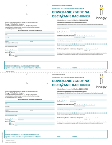 egzemplarz dla innogy Polska S.A. FORMULARZ DLA KLIENTÓW INDYWIDUALNYCH ODWOŁANIE ZGODY NA OBCIĄŻANIE RACHUNKU Identyfikator innogy Polska S.A. 5250000794 Niniejszym odwołuję moją zgodę na obciążanie przez innogy Polska Spółka Akcyjna ul. Wybrzeże Kościuszkowskie 41, 00-347 Warszawa na obciążanie wskazanego poniżej rachunku bankowego w drodze polecenia zapłaty. Dane Właściciela rachunku bankowego Adres miejsca dostarczania energii elektrycznej (proszę wypełnić, jeśli jest inny niż adres Właściciela rachunku bankowego) ulica, numer domu, lokalu kod pocztowy imię miejscowość IDENTYFIKATOR PŁATNOŚCI nazwisko telefon e-mail Adres zameldowania 0 konto umowy w innogy nazwa banku prowadzącego rachunek bankowy Klienta numer rachunku w banku Klienta (proszę wpisać tylko cyfry) ulica, numer domu, lokalu Preferowany termin ostatniego obciążenia: kod pocztowy kraj*: Polska inny: miejscowość miesiąc rok Niniejszy dokument odwołuje jednocześnie zgodę dla wskazanego powyżej banku do obciążania ww. rachunku bankowego w drodze polecenia zapłaty z tytułu zobowiązań umownych firmy wobec innogy Polska S.A. nazwa PODPIS WŁAŚCICIELA RACHUNKU BANKOWEGO zgodny z kartą wzorów podpisów złożoną w banku DATA. . . . . . . . . . . . . . . . . PODPIS. . . . . . . . . . . . . . . . . . . . . . . . . . . . . . . . . . . . . . . . . . * właściwe zakreślić egzemplarz dla banku FORMULARZ DLA KLIENTÓW INDYWIDUALNYCH ODWOŁANIE ZGODY NA OBCIĄŻANIE RACHUNKU Identyfikator innogy Polska S.A. 5250000794 Niniejszym odwołuję moją zgodę na obciążanie przez innogy Polska Spółka Akcyjna ul. Wybrzeże Kościuszkowskie 41, 00-347 Warszawa na obciążanie wskazanego poniżej rachunku bankowego w drodze polecenia zapłaty. Dane Właściciela rachunku bankowego Adres miejsca dostarczania energii elektrycznej (proszę wypełnić, jeśli jest inny niż adres Właściciela rachunku bankowego) ulica, numer domu, lokalu kod pocztowy imię miejscowość IDENTYFIKATOR PŁATNOŚCI nazwisko telefon e-mail Adres zameldowania 0 konto umowy w innogy nazwa banku prowadzącego rachunek bankowy Klienta numer rachunku w banku Klienta (proszę wpisać tylko cyfry) ulica, numer domu, lokalu Preferowany termin ostatniego obciążenia: kod pocztowy kraj*: Polska inny: miejscowość miesiąc rok Niniejszy dokument odwołuje jednocześnie zgodę dla wskazanego powyżej banku do obciążania ww. rachunku bankowego w drodze polecenia zapłaty z tytułu zobowiązań umownych firmy wobec innogy Polska S.A. Wersja z dnia 20160902 nazwa PODPIS WŁAŚCICIELA RACHUNKU BANKOWEGO zgodny z kartą wzorów podpisów złożoną w banku * właściwe zakreślić Wersja z dnia 20160902 DATA. . . . . . . . . . . . . . . . . PODPIS. . . . . . . . . . . . . . . . . . . . . . . . . . . . . . . . . . . . . . . . . .