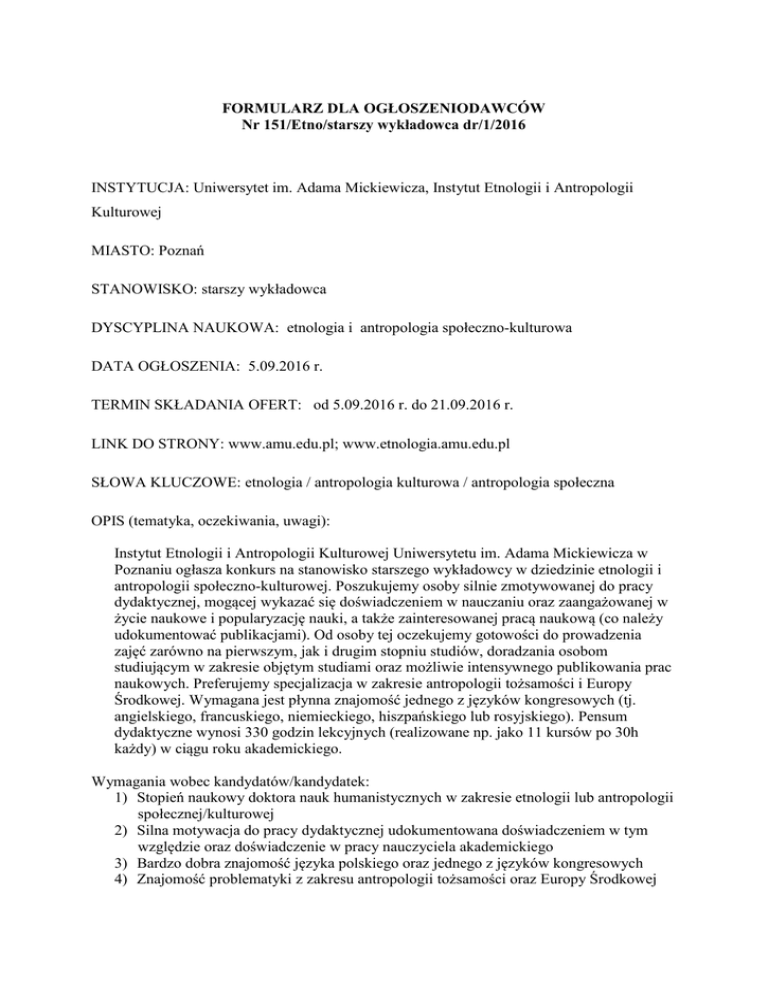 FORMULARZ DLA OGŁOSZENIODAWCÓW Nr 151/Etno/starszy wykładowca dr/1/2016 INSTYTUCJA: Uniwersytet im. Adama Mickiewicza, Instytut Etnologii i Antropologii Kulturowej MIASTO: Poznań STANOWISKO: starszy wykładowca DYSCYPLINA NAUKOWA: etnologia i antropologia społeczno-kulturowa DATA OGŁOSZENIA: 5.09.2016 r. TERMIN SKŁADANIA OFERT: od 5.09.2016 r. do 21.09.2016 r. LINK DO STRONY: www.amu.edu.pl; www.etnologia.amu.edu.pl SŁOWA KLUCZOWE: etnologia / antropologia kulturowa / antropologia społeczna OPIS (tematyka, oczekiwania, uwagi): Instytut Etnologii i Antropologii Kulturowej Uniwersytetu im. Adama Mickiewicza w Poznaniu ogłasza konkurs na stanowisko starszego wykładowcy w dziedzinie etnologii i antropologii społeczno-kulturowej. Poszukujemy osoby silnie zmotywowanej do pracy dydaktycznej, mogącej wykazać się doświadczeniem w nauczaniu oraz zaangażowanej w życie naukowe i popularyzację nauki, a także zainteresowanej pracą naukową (co należy udokumentować publikacjami). Od osoby tej oczekujemy gotowości do prowadzenia zajęć zarówno na pierwszym, jak i drugim stopniu studiów, doradzania osobom studiującym w zakresie objętym studiami oraz możliwie intensywnego publikowania prac naukowych. Preferujemy specjalizacja w zakresie antropologii tożsamości i Europy Środkowej. Wymagana jest płynna znajomość jednego z języków kongresowych (tj. angielskiego, francuskiego, niemieckiego, hiszpańskiego lub rosyjskiego). Pensum dydaktyczne wynosi 330 godzin lekcyjnych (realizowane np. jako 11 kursów po 30h każdy) w ciągu roku akademickiego. Wymagania wobec kandydatów/kandydatek: 1) Stopień naukowy doktora nauk humanistycznych w zakresie etnologii lub antropologii społecznej/kulturowej 2) Silna motywacja do pracy dydaktycznej udokumentowana doświadczeniem w tym względzie oraz doświadczenie w pracy nauczyciela akademickiego 3) Bardzo dobra znajomość języka polskiego oraz jednego z języków kongresowych 4) Znajomość problematyki z zakresu antropologii tożsamości oraz Europy Środkowej Wymagane dokumenty: 1) Podanie 2) List motywacyjny 3) Kopia dokumentu zaświadczającego uzyskanie stopnia doktora 4) C.V. zawierające również wykaz publikacji 5) 1 przykładowa publikacja (o objętości nie większej niż ca 1 arkusz wydawniczy – artykuł lub fragmenty książki) 6) Listy rekomendacyjne od 2 osób znających pracę kandydata//-ki. Procedura: 1) Komisja konkursowa zapozna się z sylwetkami i pracami kandydatów/-tek 2) Na swym posiedzeniu Komisja dokona wyboru kandydata//tki 3) Rada Wydziału Historycznego zaaprobuje kandydata//tkę 4) Rektor Uniwerystetu podejmie decyzję o zatrudnieniu kandydata/kandydatki. Zgłoszenia należy przesłać na adres: Instytut Etnologii i Antropologii Kulturowej ‘Konkurs’ Uniwersytet im. Adama Mickiewicza ul. Umultowska 89D 61-614 Poznań Lub – forma preferowana – mailowo (skan dokumentów lub pliki w formacie PDF) na adres: [email protected] (temat: konkurs) II. FORM FOR EMPLOYERS Nr 151/Etno/starszy wykładowca dr/1/2016 INSTITUTION ..Adam Mickiewicz University, Department of Ethnology and Cultural Anthropology……............................................................................................. CITY................Poznań.................................................................................................... POSITION ......Senior lecturer DISCIPLINE…ethnology and social/cultural anthropology……………....................... POSTED ........... 5.09.2016 r. EXPIRES .......... od 5.09.2016 r. do 21.09.2016 r. WEBSITE .........www.amu.edu.pl; www.etnologia.amu.edu.pl.................................... KEY WORDS . cultural anthropology, social anthropology....................... DESCRIPTION (field, expectations, comments): The Department of Ethnology and Social Anthropology at Adam Mickiewicz University (Poznań, Poland) seeks to appoint a Senior lecturer specialising in Ethnology or Sociocultural Anthropology. We are looking for a highly motivated individual with a strong academic teaching record, active engagement in academic life popularising anthropological knowledge, as well as an interest in research (proven in the publication list). A potential candidate must hold a PhD award (preferably in Ethnology or Sociocultural Anthropology). Knowledge of one of foreigner languages relevant in the European context (e.g., English, French, German, Spanish or Russian) is required. Preference will be given to experts specialising in anthropology of identity and Central European sociocultural issues. We expect that the prospective lecturer will be able to teach courses in ethnographic methods, on identity and held B.A. seminars as well as specialist courses close to his or her research interests. Successful applicant will have teach 330 teaching hours per academic year (e.g. 11 courses/30h each), advise graduate and undergraduate student and participate actively in the Departments life. The application must contain the following: 1. An Application Letter 2. A motivated text wherein the reasons for applying, qualifications in relation to the position, and intentions and visions for the position are stated 3. A copy of the PhD certificate 4. A current curriculum vitae including a complete list of publications 5. 1 exemplary academic publication (up to 40 000 characters; journal article or book chapter) 6. Two recommendation letters written by people familiar with his or her teaching and academic work. Applications can be send via e-mail (preferred option) to: [email protected] (subject: ‘konkurs’; all documents in a PDF format) or by post. The postal address is: Instytut Etnologii i Antropologii Kulturowej ‘Konkurs’ Uniwersytet im. Adama Mickiewicza ul. Umultowska 89D 61-614 Poznań, Poland Selection procedure: - A Search Committee will assess all candidates - At the meeting Search Committee will choose a candidate - Candidate will be approved by the Faculty of Historical Studies Council