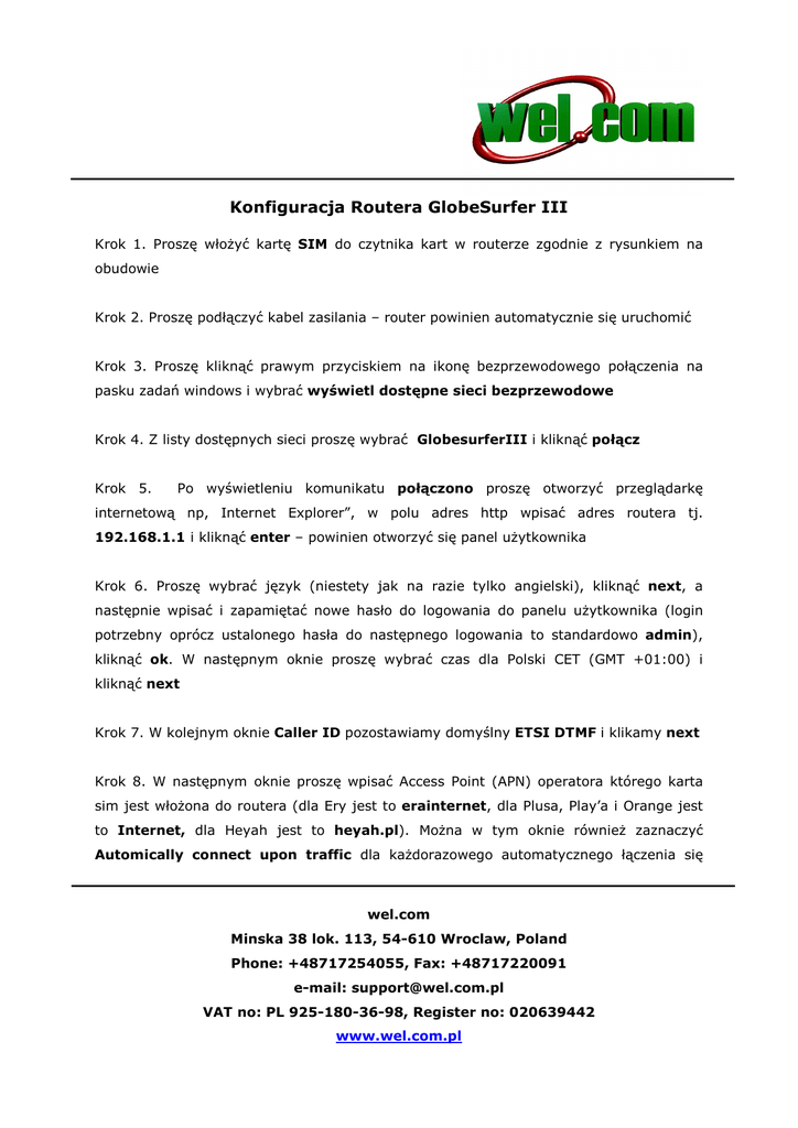 Konfiguracja Routera GlobeSurfer III Krok 1. Proszę włoŜyć kartę SIM do czytnika kart w routerze zgodnie z rysunkiem na obudowie Krok 2. Proszę podłączyć kabel zasilania – router powinien automatycznie się uruchomić Krok 3. Proszę kliknąć prawym przyciskiem na ikonę bezprzewodowego połączenia na pasku zadań windows i wybrać wyświetl dostępne sieci bezprzewodowe Krok 4. Z listy dostępnych sieci proszę wybrać GlobesurferIII i kliknąć połącz Krok 5. Po wyświetleniu komunikatu połączono proszę otworzyć przeglądarkę internetową np, Internet Explorer”, w polu adres http wpisać adres routera tj. 192.168.1.1 i kliknąć enter – powinien otworzyć się panel uŜytkownika Krok 6. Proszę wybrać język (niestety jak na razie tylko angielski), kliknąć next, a następnie wpisać i zapamiętać nowe hasło do logowania do panelu uŜytkownika (login potrzebny oprócz ustalonego hasła do następnego logowania to standardowo admin), kliknąć ok. W następnym oknie proszę wybrać czas dla Polski CET (GMT +01:00) i kliknąć next Krok 7. W kolejnym oknie Caller ID pozostawiamy domyślny ETSI DTMF i klikamy next Krok 8. W następnym oknie proszę wpisać Access Point (APN) operatora którego karta sim jest włoŜona do routera (dla Ery jest to erainternet, dla Plusa, Play’a i Orange jest to Internet, dla Heyah jest to heyah.pl). MoŜna w tym oknie równieŜ zaznaczyć Automically connect upon traffic dla kaŜdorazowego automatycznego łączenia się wel.com Minska 38 lok. 113, 54-610 Wroclaw, Poland Phone: +48717254055, Fax: +48717220091 e-mail: [email protected] VAT no: PL 925-180-36-98, Register no: 020639442 www.wel.com.pl routera z siecią po przerwaniu połączenia. Do ręcznego łączenia się z siecią słuŜy przycisk z ikonką sieci bezprzewodowej na przedniej obudowie routera – pierwszy od prawej patrząc od strony wyświetlacza. Ręczne połączenie moŜna równieŜ realizować poprzez panel uŜytkownika. Krok 9. W następnym oknie proszę wpisać nazwę identyfikatora sieciowego jeśli ma być inna niŜ dotychczasowa – Globesurfer III. Krok 10. W kolejnym oknie jest moŜliwość ustawienia zabezpieczenia sieci (encryption) poprzez podanie wybranego przez siebie klucza (Pre-Shared Key) – zalecamy zabezpieczenie sieci. Klucz proszę zapamiętać gdyŜ będzie potrzebny przy realizowaniu pierwszego połączenia z zabezpieczeniem. W kolejnym oknie wybieramy poziom zabezpieczeń (Firewall Policy) Krok 11. W ostatnim oknie podsumowującym dokonane ustawienia proszę kliknąć dla ich potwierdzenia finish i następnie ok. W tym momencie połączenie powinno zostać przerwane. Krok 12. Proszę powtórzyć krok 3 i 4 a następnie podać ustalony w kroku 10 klucz i kliknąć połącz Po kilkunastu sekundach (moŜe to potrwać nawet do ok. 1 minuty) powinno nastąpić automatyczne połączenie z operatorem co widać równieŜ na monitorze routera (jeśli jest widoczny tylko zegar, proszę wcisnąć na przednim panelu routera przycisk monitor – pierwszy od lewej) W tym momencie moŜemy korzystać z internetu W razie problemów z instalacją prosimy o kontakt. wel.com Minska 38 lok. 113, 54-610 Wroclaw, Poland Phone: +48717254055, Fax: +48717220091 e-mail: [email protected] VAT no: PL 925-180-36-98, Register no: 020639442 www.wel.com.pl wel.com Minska 38 lok. 113, 54-610 Wroclaw, Poland Phone: +48717254055, Fax: +48717220091 e-mail: [email protected] VAT no: PL 925-180-36-98, Register no: 020639442 www.wel.com.pl