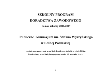 SZKOLNY PROGRAM DORADZTWA ZAWODOWEGO na rok szkolny 2016/2017 Publiczne Gimnazjum im. Stefana Wyszyńskiego w Leśnej Podlaskiej zaopiniowany pozytywnie przez Radę Rodziców w dniu 14 września 2016 r. Zatwierdzony przez Radę Pedagogiczną w dniu 15 września 2016 r. 1 1. Obowiązujące akty prawne dotyczące udzielania uczniom pomocy w wyborze zawodu i kierunku kształcenia: Ustawa z dnia 7 września 1991r. o systemie oświaty ( Dz. U. z 2015 r. poz. 2156) zobowiązująca placówki oświatowe do przygotowania uczniów do wyboru zawodu i kierunku kształcenia Rozporządzenie Ministra Edukacji Narodowej z dnia 21 maja 2001r. w sprawie ramowych statutów publicznego przedszkola oraz publicznych szkół wprowadzające funkcjonowanie wewnątrzszkolnego systemu doradztwa zawodowego, realizowanego we współpracy z poradniami psychologiczno- zawodowymi. Rozporządzenie Ministra Edukacji Narodowej i Sportu z dnia 13 czerwca 2003r.w sprawie rodzajów, organizacji oraz sposobu działania publicznych placówek kształcenia ustawicznego, w tym publicznych ośrodków dokształcania i doskonalenia zawodowego (Dz. U. z 2003 r. nr 132 poz. 1225). Rozporządzenie Ministra Edukacji Narodowej z dnia 30 kwietnia 2013 r. w sprawie zasad udzielania i organizacji pomocy psychologiczno- pedagogicznej w publicznych przedszkolach, szkołach i placówkach (Dz.U. 2013 poz. 532). Strategia Rozwoju Kształcenia Ustawicznego do roku 2010 przyjęta przez Radę Ministrów 8 lipca 2003r. jako jeden z priorytetów uznaje tworzenie zasobów informacyjnych w zakresie kształcenia ustawicznego i rozwoju zasobów doradczych. 2. Założenia Szkolnego Programu Doradztwa Zawodowego. Szkolny Program Doradztwa Zawodowego obejmuje ogół działań podejmowanych przez szkołę w celu prawidłowego przygotowania uczniów do świadomego wyboru zawodu i kierunku kształcenia ponadgimnazjalnego. Program określa cele szkolnego doradztwa zawodowego, a także role i zadania nauczycieli, wychowawców, psychologa szkolnego, formy, metody i sposób realizacji zadań oraz oczekiwane efekty. 3. Cele główne szkolnego doradztwa zawodowego: przygotowanie uczniów do świadomego i umiejętnego planowania kariery zawodowej, wyzwalanie aktywności uczniów w kierunku samopoznania i samooceny, 2 pomoc uczniom w poznaniu interesujących dla nich zawodów, zapoznanie ze strukturą szkolnictwa. 4. Główne zadania szkoły w zakresie doradztwa zawodowego: gromadzenie, aktualizacja i udostępnianie informacji edukacyjnych i zawodowych właściwych dla gimnazjalnego poziomu kształcenia, systematyczne diagnozowanie zapotrzebowania uczniów na informacje edukacyjne i zawodowe oraz na pomoc w planowaniu kształcenia. udzielanie indywidualnych porad edukacyjnych i zawodowych uczniom, prowadzenie zajęć przygotowujących uczniów do świadomego planowania kariery i podjęcia pracy zawodowej, wspieranie rodziców i nauczycieli w działaniach zmierzających do efektywnego wspierania dzieci w podejmowaniu decyzji edukacyjnych i zawodowych. współpraca z różnymi instytucjami wspierającymi Wewnątrzszkolny System Doradztwa Zawodowego, np.: Mobilne Centrum Informacji Zawodowej, Poradnia Psychologiczno – Pedagogiczna, współpraca wszystkich pracowników szkoły w ramach realizacji w/w zadań. 5. Zadania szczegółowe: a) w zakresie pracy z uczniami: wdrażanie uczniów do samopoznania kształcenie umiejętności oceny swoich mocnych i słabych stron konfrontacja samooceny uczniów z wymaganiami szkół i zawodów planowanie kariery zawodowej pokonywanie barier emocjonalnych, stresu rozszerzanie zasobu informacji na temat sposobów poszukiwania pracy poznawanie lokalnego rynku pracy poznanie możliwości dalszego kształcenia 3 b) w zakresie pracy z rodzicami: podniesienie umiejętności komunikowania się ze swoimi dziećmi doskonalenie umiejętności wychowawczych wypracowanie form wspierania uczniów w wyborze ich dalszej drogi życiowej pozyskanie informacji o zawodach, aktualnych trendach na rynku pracy, możliwościach kształcenia zapoznanie z problematyką wyboru zawodu c) w zakresie współpracy z nauczycielami: uzyskanie wsparcia i pomocy w pracy wychowawczej lepsze rozpoznanie potrzeb uczniów i ich poglądów, oczekiwań wobec szkoły i rynku pracy uświadomienie konieczności wplatania w treści przedmiotowe problematyki wyboru zawodu nakreślenie dalszego kierunku pracy z uczniami i rodzicami 6. Zadania należące do doradcy zawodowego/psychologa szkolnego w szkole: systematyczne diagnozowanie zapotrzebowania uczniów na informacje edukacyjne i zawodowe oraz pomoc w planowaniu kształcenia i kariery zawodowej gromadzenie, aktualizacja i udostępnianie informacji edukacyjnych i zawodowych właściwych dla danego poziomu kształcenia prowadzenie zajęć związanych z wyborem kierunku kształcenia i zawodu oraz planowaniem kształcenia i kariery zawodowej koordynowanie działalności informacyjno - doradczej prowadzonej przez szkołę i placówkę współpraca z innymi nauczycielami w tworzeniu i zapewnieniu ciągłości działań w zakresie doradztwa edukacyjno – zawodowego wspieranie nauczycieli, wychowawców grup wychowawczych i innych specjalistów w udzielaniu pomocy psychologiczno-pedagogicznej 7. Zadania podejmowane przez wychowawców i nauczycieli przedmiotowych w ramach doradztwa zawodowego obejmują: diagnozowanie zapotrzebowanie uczniów na informacje udostępnianie informacji o charakterze edukacyjnym i zawodowym, właściwych dla danego poziomu kształcenia 4 współpraca z instytucjami wspierającymi wewnątrzszkolny system doradztwa, przede wszystkim z doradcą zawodowym ( psychologiem szkolnym) w celu tworzenia jednolitego frontu oddziaływań doradczych i wykorzystywania materiałów do prowadzenia zajęć przygotowanie uczniów do dokonania świadomego wyboru zawodu uświadomienie uczniom wartości pracy i konieczności rozwoju zawodowego zapoznanie uczniów z systemem poradnictwa zawodowego wyzwalanie ich aktywności w kier