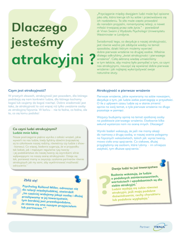 Dlaczego jesteśmy atrakcyjni ? „Przyciąganie między dwojgiem ludzi może być opisane jako siła, która kieruje ich ku sobie i przeciwstawia się ich rozdzieleniu. Ta siła może często prowadzić do narodzin przyjaźni, romantycznej relacji, a nawet miłości trwającej przez całe życie.” – powiedział dr Viren Swami z Wydziału Psychologii Uniwersytetu Westminster w Londynie. Świadomość tego, co decyduje o naszej atrakcyjności, jest równie ważna jak zdobycie wiedzy na temat sposobów, dzięki którym możemy wywrzeć dobre pierwsze wrażenie na drugiej osobie. Właśnie dlatego odkryliśmy „świat atrakcyjności i pierwszego wrażenia”. Całą zebraną wiedzę umieściliśmy w tym tekście, aby można było pomyśleć o tym, co czyni nas atrakcyjnymi, nauczyć się wywierać dobre pierwsze wrażenie i jak najlepiej wykorzystywać swoje naturalne atuty. Czym jest atrakcyjność? Atrakcyjność a pierwsze wrażenie W prostych słowach, atrakcyjność jest powodem, dla którego podobają się nam konkretni ludzie, dla którego kochamy kogoś lub czujemy do kogoś niechęć. Dobra wiadomość jest taka, że atrakcyjność to coś więcej niż tylko uważanie osoby za atrakcyjną fizycznie. W końcu – nie to ładne, co ładne, ale to, co się komu podoba! Pierwsze wrażenie, jakie wywieramy na sobie nawzajem, decyduje o tym, jak ludzie siebie postrzegają w przyszłości. O ile z upływem czasu ludzie są w stanie zmienić opinie na swój temat, o tyle pierwsze wrażenie na długo pozostaje w pamięci. Wszyscy budujemy opinię na temat spotkanej osoby na podstawie pierwszego wrażenia. Dosłownie kilka sekund wystarcza nam na ocenę innych. Dlaczego? Co czyni ludzi atrakcyjnymi? Ludzie mnie lubią Nasze postrzeganie piękna wynika z całości wrażeń, jakie wywarli na nas ludzie, kiedy byliśmy dziećmi (najczęściej są to członkowie naszej rodziny, rówieśnicy czy ludzie z show– –biznesu). Co więcej, badania sugerują, że w przypadku tak kobiet, jak i mężczyzn regularne rysy twarzy i jej podobieństwo do naszej twarzy są czynnikami silnie wpływającymi na naszą ocenę atrakcyjności. Dzieje się tak, ponieważ mamy w zwyczaju szukanie partnerów równie atrakcyjnych jak my sami, aby wyeliminować możliwość odrzucenia.2 Zbliż się! Psycholog Rolland Mille r, odnosząc się do relacji międzyludzk iej, stwierdził: „Im częściej widujemy jakąś osobę i dłużej przebywamy w jej towa rzystwie, tym bardziej jest praw dopodobne, że stanie się ona nasz ym przyjacielem lub partnerem.”10 Wyniki badań wskazują, że jeśli nie mamy okazji do rozmowy z drugą osobą, w naszej ocenie polegamy na fizycznych wskazówkach, takich jak: wyraz twarzy, mowa ciała oraz spojrzenie. Co ciekawe, dłużej przyglądamy się osobom, które lubimy – im silniejsza zażyłość, tym dłuższe spojrzenia.1 zystwo Dwoje ludzi to już towar zie Badania wskazują, że lud niach, wa so ere int za o podobnych obaniach są dla wartościach i upod 7 siebie atrakcyjni. również Ludzie wydają się sobie dobne atrakcyjni, jeśli mają po arakteru doświadczenia, cechy ch 8 lub podobnie wyglądają. Partner: Mężczyźni a kobiety Kobiety Mężczyźni Fizyczne atrybuty, takie jak symetryczne rysy twarzy i zaokrąglone kształty są instynktownie uważane przez mężczyzn za atrakcyjne, ponieważ łączą oni wysoką płodność z czynnikiem odpowiedzialnym za dystrybucję tłuszczu.3 W Europie i USA młodzieńczy wygląd, odpowiednia waga i zdrowy wygląd zewnętrzny są uważane za wyznacznik dobrego stanu zdrowia i tym samym wpływają na pozytywną ocenę kobiet w oczach mężczyzn. Zupełnie inaczej jest w krajach Wschodu, gdzie większy rozmiar jest wręcz oznaką bogactwa i kobiecości.4 Wysocy mężczyźni z trójkątnymi torsami w kształcie litery V i silnymi męskimi cechami są uważani przez kobiety za najbardziej atrakcyjnych. Kobiety zwracają również uwagę na symetrię twarzy jako oznakę dobrego zdrowia i zdolności do reprodukcji.5 Zadziwiający jest fakt, że kobiety potrafią ocenić potencjał biologiczny mężczyzny jedynie po spojrzeniu na jego twarz.6 Osobowość Atrakcyjność jest czymś więcej niż tym, co przyciąga nasz wzrok. Liczy się również nasze pozytywne podejście do rozmówcy. Właśnie dlatego ludzie, którzy nie wpisują się zbytnio w kanony piękna są atrakcyjni dla tych, którzy ich znają i lubią. Naukowcy badający to zjawisko prosili uczestników badania o ocenę pozostałych uczestników po wspólnej pracy w grupach. Okazało się, że za najbardziej atrakcyjne uznano osoby z najciekawszą osobowością 9 i przyjaznym nastawieniem do pozostałych. Poza uprzejmością innymi cechami, które wpływają na atrakcyjność, są chęć współpracy i poczucie 9 humoru. „3 W” – Spróbuj to wykorzystać Badania wskazują na istnienie trzech ważnych elementów, które w różny sposób wpływają na poziom naszej sympatii do danej osoby. Są one znane jako „3 W” – werbalne, wokalne i wizualne.13 Ekspresja niewerbalna stanowi 93% przekazu. Słowa, które wypowiadamy to tylko 7% naszej komunikacji, podczas gdy 38% pochodzi z tonu głosu, a aż 55% z mowy ciała!13 Czy wiesz, że...? Ludzie otwarci, którzy ko munikują się w sposób ekspresyjny, za zwyczaj są bardziej lubiani w porów naniu z osobami zamkniętymi w sobie. Dzieje się tak, ponieważ jesteśmy bardziej pewni tego, co nam komunikują.14 Pierwsze wrażenie – doceń to! Kiedy spotykamy kogoś po raz pierwszy, jesteśmy w stanie bardzo szybko zdecydować, czy są to osoby, z którymi chcemy spędzać więcej czasu w przyszłości. Podobny sposób komunikowania się pomaga ludziom uspokoić się i przyspiesza zacieśnianie relacji, których rozwój w przeciwnym razie trwałby dużo dłużej. Kluczowe pozytywne zachowania: Uśmiech Otwarta mowa ciała Szukanie kontaktu wzrokowego Przedstawienie się Okazanie zainteresowania i otwartość Partner: Rusz 