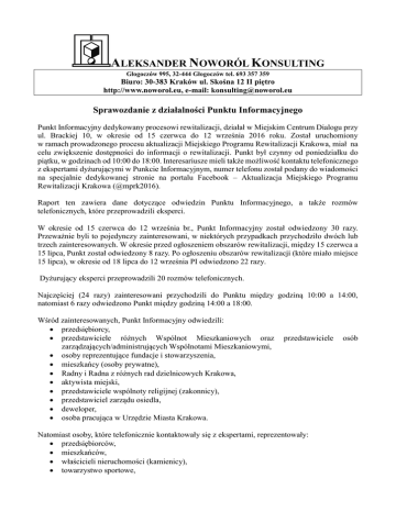 ALEKSANDER NOWORÓL KONSULTING Głogoczów 995, 32-444 Głogoczów tel. 693 357 359 Biuro: 30-383 Kraków ul. Skośna 12 II piętro http://www.noworol.eu, e-mail: [email protected] Sprawozdanie z działalności Punktu Informacyjnego Punkt Informacyjny dedykowany procesowi rewitalizacji, działał w Miejskim Centrum Dialogu przy ul. Brackiej 10, w okresie od 15 czerwca do 12 września 2016 roku. Został uruchomiony w ramach prowadzonego procesu aktualizacji Miejskiego Programu Rewitalizacji Krakowa, miał na celu zwiększenie dostępności do informacji o rewitalizacji. Punkt był czynny od poniedziałku do piątku, w godzinach od 10:00 do 18:00. Interesariusze mieli także możliwość kontaktu telefonicznego z ekspertami dyżurującymi w Punkcie Informacyjnym, numer telefonu został podany do wiadomości na specjalnie dedykowanej stronie na portalu Facebook – Aktualizacja Miejskiego Programu Rewitalizacji Krakowa (@mprk2016). Raport ten zawiera dane dotyczące odwiedzin Punktu Informacyjnego, a także rozmów telefonicznych, które przeprowadzili eksperci. W okresie od 15 czerwca do 12 września br., Punkt Informacyjny został odwiedzony 30 razy. Przeważnie byli to pojedynczy zainteresowani, w niektórych przypadkach przychodziło dwóch lub trzech zainteresowanych. W okresie przed ogłoszeniem obszarów rewitalizacji, między 15 czerwca a 15 lipca, Punkt został odwiedzony 8 razy. Po ogłoszeniu obszarów rewitalizacji (które miało miejsce 15 lipca), w okresie od 18 lipca do 12 września PI odwiedzono 22 razy. Dyżurujący eksperci przeprowadzili 20 rozmów telefonicznych. Najczęściej (24 razy) zainteresowani przychodzili do Punktu między godziną 10:00 a 14:00, natomiast 6 razy odwiedzono Punkt między godziną 14:00 a 18:00. Wśród zainteresowanych, Punkt Informacyjny odwiedzili: przedsiębiorcy, przedstawiciele różnych Wspólnot Mieszkaniowych oraz zarządzających/administrujących Wspólnotami Mieszkaniowymi, osoby reprezentujące fundacje i stowarzyszenia, mieszkańcy (osoby prywatne), Radny i Radna z różnych rad dzielnicowych Krakowa, aktywista miejski, przedstawiciele wspólnoty religijnej (zakonnicy), przedstawiciel zarządu osiedla, deweloper, osoba pracująca w Urzędzie Miasta Krakowa. przedstawiciele Natomiast osoby, które telefonicznie kontaktowały się z ekspertami, reprezentowały: przedsiębiorców, mieszkańców, właścicieli nieruchomości (kamienicy), towarzystwo sportowe, osób fundacje, instytucje kultury (m.in. teatr). Kwestie, o które pytali w Punkcie zainteresowani dotyczyły/stanowiły: między 15 czerwca a 15 lipca: możliwości pozyskania pieniędzy na konkretny, przedstawiony przez te osoby projekt, możliwości składania projektu, czasu naboru, czy oferowana zostanie pomoc przy wypełnianiu karty projektu/fiszki, kto może zostać beneficjentem/wnioskodawcą (kto może złożyć fiszkę) czym jest rewitalizacja, tego, czy zostały już wyznaczone obszary do rewitalizacji, zagadnień odnośnie procesu rewitalizacji, uzyskania dofinansowania, harmonogramu związanego z naborem projektów, z procesem aktualizacji MPRK, z działalnością Punktu Informacyjnego, między 15 lipca a 12 września: zapytanie, o to dlaczego granica obszaru rewitalizacji na Zabłociu została wyznaczona do linii kolejowej i dlaczego nie obejmuje obszarów dalej, za tą linią kolejową, procesu rewitalizacji, aktualizacji programu – dlaczego zostaje on poddany aktualizacji, potencjalnych beneficjentów – kto może zostać beneficjentem/wnioskodawcą, potencjalnych projektów – typy projektów, jak będzie wyglądać proces składania projektów, w jakiej formie, jak wypełnić fiszkę, gdzie składać fiszkę i w jaki sposób – czy papierowo, czy elektronicznie, na jaki adres e-mail wysłać fiszkę, kiedy będzie rozstrzygnięcie, kto będzie o tym decydował, gdzie znaleźć fiszkę (kartę projektu), gdzie znaleźć jeszcze dodatkowe informacje na temat projektów, gdzie trafiają teraz na tym etapie te fiszki – do Urzędu Marszałkowskiego czy Miejskiego w Krakowie, zapytanie, czy diagnoza opracowywana do AMPRK będzie udostępniona do publicznej informacji przed ukończeniem aktualizacji całego dokumentu, przed jego procedowaniem i przed zakończeniem naboru, zapytanie o to, które punkty będą aktualizowane, a które z poprzedniego MPRK (2014), zapytanie, jak będą rozliczane koszty, zapytanie jak poprawnie określić w fiszce koszty projektu, potencjalne dofinansowanie, itp., zapytanie, czy możliwe jest pozyskanie środków na wynajem sali i jakie to są kwoty, zasięgu obszarów rewitalizacji, dofinansowania projektu, znajdującego się poza obszarem przeznaczonym do rewitalizacji – wymiana informacji na temat odpowiedzi uzyskanych na ten temat od Urzędu Marszałkowskiego, zasad pozyskania środków unijnych na rewitalizację, jaka jest wysokość dofinansowania z UE na rewitalizację, omówienia projektu przedstawionego przez mieszkańca, dotyczącego termomodernizacji budynku, omówienie fiszki odnośnie tego projektu, omówienie projektów przedstawionych przez Wspólnotę Mieszkaniową, jacy mogą być współwnioskodawcy, jak uzyskać dofinansowanie, jakie są kwoty dofinansowania z UE, jaki typ projektu może uzyskać dofinansowanie, czy środki ze SKOZK mogą być traktowane jako wkład własny beneficjenta, konsultacji pomysłu mieszkanki na projekt integracji osób niepełnosprawnych, rodzaju beneficjenta/wnioskodawcy w sytuacji wyjątkowej (sprawa dotyczyła kamienicy i formy administrowania), kwestie dotyczące zgody wszystkich współwłaścicieli na projekt, pozyskanie pieniędzy w przypadku rozpoczęcia/trwania już projektu, konsultacji wypełnionej fiszki projektowej, możliwość pozyskania funduszy unijnych w kontekście Wspólnoty Mieszkaniowej, jakie typ projektu, kwestia otrzymania dofinansowania dla projektu leżącego poza obszarem rewitalizacji, uwarunkowania prawne procesu rewitalizacji obecnie, gdzie i co można poc