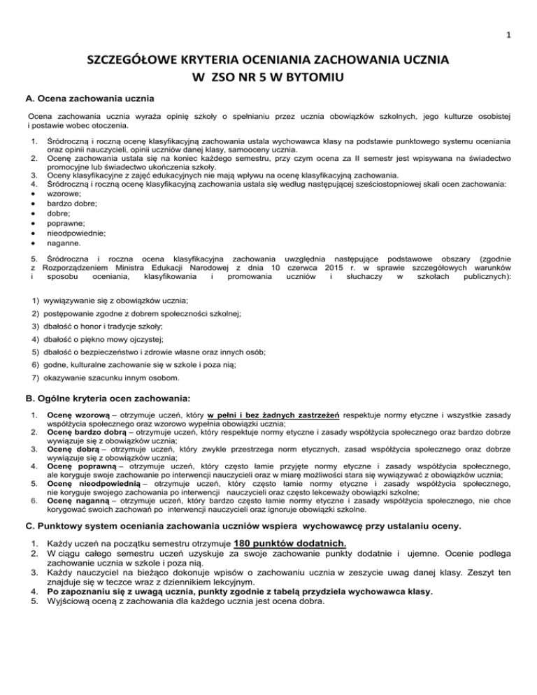 1 SZCZEGÓŁOWE KRYTERIA OCENIANIA ZACHOWANIA UCZNIA W ZSO NR 5 W BYTOMIU A. Ocena zachowania ucznia Ocena zachowania ucznia wyraża opinię szkoły o spełnianiu przez ucznia obowiązków szkolnych, jego kulturze osobistej i postawie wobec otoczenia. 1. 2. 3. 4.       Śródroczną i roczną ocenę klasyfikacyjną zachowania ustala wychowawca klasy na podstawie punktowego systemu oceniania oraz opinii nauczycieli, opinii uczniów danej klasy, samooceny ucznia. Ocenę zachowania ustala się na koniec każdego semestru, przy czym ocena za II semestr jest wpisywana na świadectwo promocyjne lub świadectwo ukończenia szkoły. Oceny klasyfikacyjne z zajęć edukacyjnych nie mają wpływu na ocenę klasyfikacyjną zachowania. Śródroczną i roczną ocenę klasyfikacyjną zachowania ustala się według następującej sześciostopniowej skali ocen zachowania: wzorowe; bardzo dobre; dobre; poprawne; nieodpowiednie; naganne. 5. Śródroczna i roczna ocena klasyfikacyjna zachowania uwzględnia następujące podstawowe obszary (zgodnie z Rozporządzeniem Ministra Edukacji Narodowej z dnia 10 czerwca 2015 r. w sprawie szczegółowych warunków i sposobu oceniania, klasyfikowania i promowania uczniów i słuchaczy w szkołach publicznych): 1) wywiązywanie się z obowiązków ucznia; 2) postępowanie zgodne z dobrem społeczności szkolnej; 3) dbałość o honor i tradycje szkoły; 4) dbałość o piękno mowy ojczystej; 5) dbałość o bezpieczeństwo i zdrowie własne oraz innych osób; 6) godne, kulturalne zachowanie się w szkole i poza nią; 7) okazywanie szacunku innym osobom. B. Ogólne kryteria ocen zachowania: 1. 2. 3. 4. 5. 6. Ocenę wzorową – otrzymuje uczeń, który w pełni i bez żadnych zastrzeżeń respektuje normy etyczne i wszystkie zasady współżycia społecznego oraz wzorowo wypełnia obowiązki ucznia; Ocenę bardzo dobrą – otrzymuje uczeń, który respektuje normy etyczne i zasady współżycia społecznego oraz bardzo dobrze wywiązuje się z obowiązków ucznia; Ocenę dobrą – otrzymuje uczeń, który zwykle przestrzega norm etycznych, zasad współżycia społecznego oraz dobrze wywiązuje się z obowiązków ucznia; Ocenę poprawną – otrzymuje uczeń, który często łamie przyjęte normy etyczne i zasady współżycia społecznego, ale koryguje swoje zachowanie po interwencji nauczycieli oraz w miarę możliwości stara się wywiązywać z obowiązków ucznia; Ocenę nieodpowiednią – otrzymuje uczeń, który często łamie normy etyczne i zasady współżycia społecznego, nie koryguje swojego zachowania po interwencji nauczycieli oraz często lekceważy obowiązki szkolne; Ocenę naganną – otrzymuje uczeń, który bardzo często łamie normy etyczne i zasady współżycia społecznego, nie chce korygować swoich zachowań po interwencji nauczycieli oraz ignoruje obowiązki szkolne. C. Punktowy system oceniania zachowania uczniów wspiera wychowawcę przy ustalaniu oceny. 1. Każdy uczeń na początku semestru otrzymuje 180 punktów dodatnich. 2. W ciągu całego semestru uczeń uzyskuje za swoje zachowanie punkty dodatnie i ujemne. Ocenie podlega zachowanie ucznia w szkole i poza nią. 3. Każdy nauczyciel na bieżąco dokonuje wpisów o zachowaniu ucznia w zeszycie uwag danej klasy. Zeszyt ten znajduje się w teczce wraz z dziennikiem lekcyjnym. 4. Po zapoznaniu się z uwagą ucznia, punkty zgodnie z tabelą przydziela wychowawca klasy. 5. Wyjściową oceną z zachowania dla każdego ucznia jest ocena dobra. 2 Zachowanie Lp. 1. szkolne ♦ udział ♦ zajęcie I miejsca dodatkowo ♦ zajęcie II miejsca dodatkowo ♦ zajęcie III miejsca dodatkowo   ♦3 ♦ 20 ♦ 15 ♦ 10 ♦5 - każdorazowo - po konkursie - po konkursie - po konkursie - po konkursie ♦4 ♦ 25 ♦ 20 ♦ 15 ♦5 - każdorazowo - po konkursie - po konkursie - po konkursie - po konkursie ♦5 ♦ 30 ♦ 25 ♦ 20 ♦ 10 - każdorazowo - po konkursie - po konkursie - po konkursie - po konkursie ♦ 10 - każdorazowo ♦5 - każdorazowo ♦ 10 ♦ 10 - na koniec semestru - na koniec semestru regionalne, krajowe, międzynarodowe, konkursy o zasięgu ogólnopolskim ♦ udział ♦ zajęcie I miejsca dodatkowo ♦ zajęcie II miejsca dodatkowo ♦ zajęcie III miejsca dodatkowo ♦ wyróżnienie 4. - każdorazowo - po konkursie - po konkursie - po konkursie rejonowe, wojewódzkie ♦ udział ♦ zajęcie I miejsca dodatkowo ♦ zajęcie II miejsca dodatkowo ♦ zajęcie III miejsca dodatkowo ♦ wyróżnienie  ♦3 ♦ 15 ♦ 10 ♦5 powiatowe i miejskie ♦ udział ♦ zajęcie I miejsca dodatkowo ♦ zajęcie II miejsca dodatkowo ♦ zajęcie III miejsca dodatkowo ♦ wyróżnienie 3. Częstotliwość oceny Udział w konkursach i zawodach sportowych z podziałem na szczeble:  2. Liczba punktów + Uczeń otrzymuje PUNKTY DODATNIE za: Każda praca na rzecz szkoły: ♦ reprezentowanie szkoły podczas imprez i uroczystości oficjalnych (pozalekcyjnych, w dni wolne, promocja szkoły na zewnątrz), ♦ aktywny udział w uroczystościach szkolnych (np. apele, występy, pomoc w dekoracjach i sprzęcie nagłaśniającym, itp.), ♦ całoroczna aktywna praca w Samorządzie Uczniowskim, ♦ całoroczna praca w kołach zainteresowań, klubach, np. europejskim, szkolnym teatrze, innych organizacjach i zajęciach nadobowiązkowych (np. PTG, PCK, LOP, kółko podróżnicze) ♦ pomoc nauczycielowi w realizacji zajęć ♦ aktywny całoroczny udział w projektach organizowanych przez szkołę, np. eTwinning, projekty unijne ♦ inne działania, których uczeń sam jest pomysłodawcą, a które zdobywają uznanie i pochwałę: proponuje innowacje i doprowadza do realizacji w szkole swojego pomysłu ♦ 1 – 5 - każdorazowo ♦ 1 – 10 - na koniec semestru ♦ 10 - na koniec semestru ♦ Potwierdzona przez organizatora całoroczna praca na rzecz innych (np. „Nasze Słoneczka”, „Fabryka Dobra”) ♦ całoroczna aktywna praca charytatywna lub wolontariat np. zbiórki (zbiórka korków – co