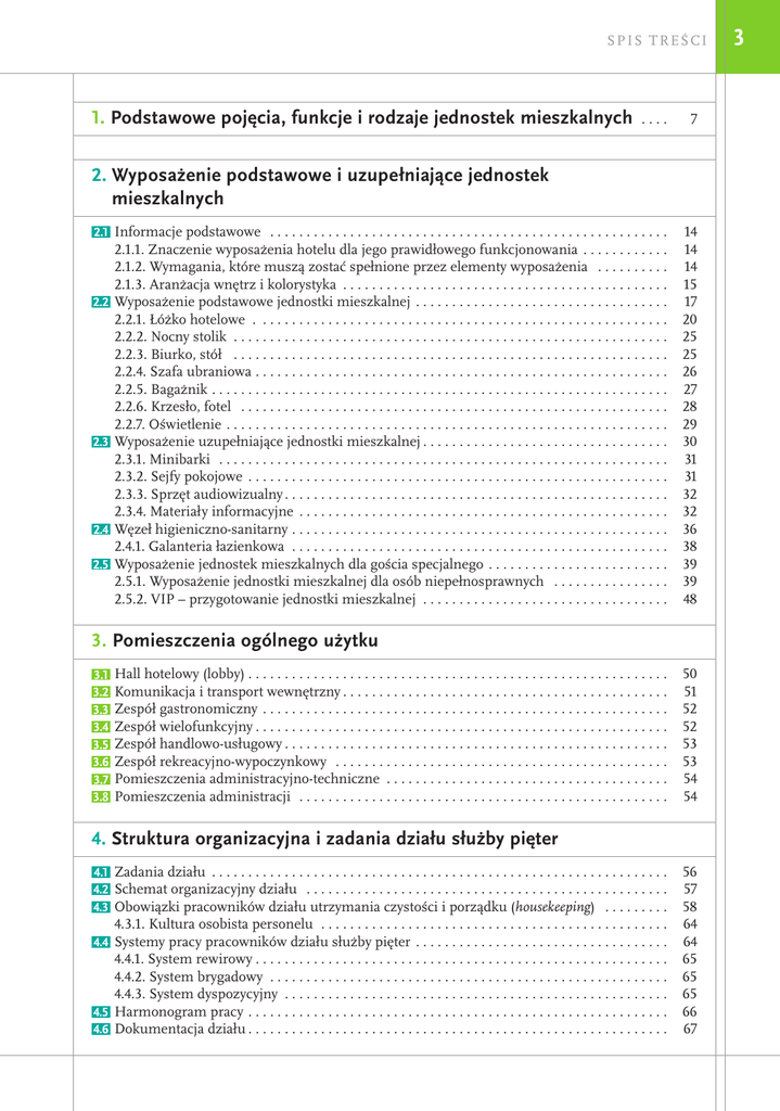 SPIS TREŚC I 1. Podstawowe pojęcia, funkcje i rodzaje jednostek mieszkalnych . . . 7 2. Wyposażenie podstawowe i uzupełniające jednostek mieszkalnych 2.1 Informacje podstawowe . . . . . . . . . . . . . . . . . . . . . . . . . . . . . . . . . . . . . . . . . . . . . . . . . . . . . . . 14 2.1.1. Znaczenie wyposażenia hotelu dla jego prawidłowego funkcjonowania . . . . . . . . . . . . 14 2.1.2. Wymagania, które muszą zostać spełnione przez elementy wyposażenia . . . . . . . . . . 14 2.1.3. Aranżacja wnętrz i kolorystyka . . . . . . . . . . . . . . . . . . . . . . . . . . . . . . . . . . . . . . . . . . . . . 15 2.2 Wyposażenie podstawowe jednostki mieszkalnej . . . . . . . . . . . . . . . . . . . . . . . . . . . . . . . . . . . 17 2.2.1. Łóżko hotelowe . . . . . . . . . . . . . . . . . . . . . . . . . . . . . . . . . . . . . . . . . . . . . . . . . . . . . . . . . 20 2.2.2. Nocny stolik . . . . . . . . . . . . . . . . . . . . . . . . . . . . . . . . . . . . . . . . . . . . . . . . . . . . . . . . . . . .25 2.2.3. Biurko, stół . . . . . . . . . . . . . . . . . . . . . . . . . . . . . . . . . . . . . . . . . . . . . . . . . . . . . . . . . . . . 25 2.2.4. Szafa ubraniowa . . . . . . . . . . . . . . . . . . . . . . . . . . . . . . . . . . . . . . . . . . . . . . . . . . . . . . . . 26 2.2.5. Bagażnik . . . . . . . . . . . . . . . . . . . . . . . . . . . . . . . . . . . . . . . . . . . . . . . . . . . . . . . . . . . . . . . 27 2.2.6. Krzesło, fotel . . . . . . . . . . . . . . . . . . . . . . . . . . . . . . . . . . . . . . . . . . . . . . . . . . . . . . . . . . . 28 2.2.7. Oświetlenie . . . . . . . . . . . . . . . . . . . . . . . . . . . . . . . . . . . . . . . . . . . . . . . . . . . . . . . . . . . . . 29 2.3 Wyposażenie uzupełniające jednostki mieszkalnej . . . . . . . . . . . . . . . . . . . . . . . . . . . . . . . . . 30 2.3.1. Minibarki . . . . . . . . . . . . . . . . . . . . . . . . . . . . . . . . . . . . . . . . . . . . . . . . . . . . . . . . . . . . . . 31 2.3.2. Sejfy pokojowe . . . . . . . . . . . . . . . . . . . . . . . . . . . . . . . . . . . . . . . . . . . . . . . . . . . . . . . . . . 31 2.3.3. Sprzęt audiowizualny . . . . . . . . . . . . . . . . . . . . . . . . . . . . . . . . . . . . . . . . . . . . . . . . . . . . 32 2.3.4. Materiały informacyjne . . . . . . . . . . . . . . . . . . . . . . . . . . . . . . . . . . . . . . . . . . . . . . . . . . . 32 2.4 Węzeł higieniczno-sanitarny . . . . . . . . . . . . . . . . . . . . . . . . . . . . . . . . . . . . . . . . . . . . . . . . . . . . 36 2.4.1. Galanteria łazienkowa . . . . . . . . . . . . . . . . . . . . . . . . . . . . . . . . . . . . . . . . . . . . . . . . . . . . 38 2.5 Wyposażenie jednostek mieszkalnych dla gościa specjalnego . . . . . . . . . . . . . . . . . . . . . . . . . 39 2.5.1. Wyposażenie jednostki mieszkalnej dla osób niepełnosprawnych . . . . . . . . . . . . . . . . 39 2.5.2. VIP – przygotowanie jednostki mieszkalnej . . . . . . . . . . . . . . . . . . . . . . . . . . . . . . . . . .48 3. Pomieszczenia ogólnego użytku 3.1 Hall hotelowy (lobby) . . . . . . . . . . . . . . . . . . . . . . . . . . . . . . . . . . . . . . . . . . . . . . . . . . . . . . . . . .50 3.2 Komunikacja i transport wewnętrzny . . . . . . . . . . . . . . . . . . . . . . . . . . . . . . . . . . . . . . . . . . . . 51 3.3 Zespół gastronomiczny . . . . . . . . . . . . . . . . . . . . . . . . . . . . . . . . . . . . . . . . . . . . . . . . . . . . . . . . 52 3.4 Zespół wielofunkcyjny . . . . . . . . . . . . . . . . . . . . . . . . . . . . . . . . . . . . . . . . . . . . . . . . . . . . . . . . 52 3.5 Zespół handlowo-usługowy . . . . . . . . . . . . . . . . . . . . . . . . . . . . . . . . . . . . . . . . . . . . . . . . . . . . 53 3.6 Zespół rekreacyjno-wypoczynkowy . . . . . . . . . . . . . . . . . . . . . . . . . . . . . . . . . . . . . . . . . . . . . . 53 3.7 Pomieszczenia administracyjno-techniczne . . . . . . . . . . . . . . . . . . . . . . . . . . . . . . . . . . . . . . . 54 3.8 Pomieszczenia administracji . . . . . . . . . . . . . . . . . . . . . . . . . . . . . . . . . . . . . . . . . . . . . . . . . . . 54 4. Struktura organizacyjna i zadania działu służby pięter 4.1 Zadania działu . . . . . . . . . . . . . . . . . . . . . . . . . . . . . . . . . . . . . . . . . . . . . . . . . . . . . . . . . . . . . . . 56 4.2 Schemat organizacyjny działu . . . . . . . . . . . . . . . . . . . . . . . . . . . . . . . . . . . . . . . . . . . . . . . . . . 57 4.3 Obowiązki pracowników działu utrzymania czystości i porządku (housekeeping) . . . . . . . . . 58 4.3.1. Kultura osobista personelu . . . . . . . . . . . . . . . . . . . . . . . . . . . . . . . . . . . . . . . . . . . . . . . . 64 4.4 Systemy pracy pracowników działu służby pięter . . . . . . . . . . . . . . . . . . . . . . . . . . . . . . . . . . . 64 4.4.1. System rewirowy . . . . . . . . . . . . . . . . . . . . . . . . . . . . . . . . . . . . . . . . . . . . . . . . . . . . . . . . 65 4.4.2. System brygadowy . . . . . . . . . . . . . . . . . . . . . . . . . . . . . . . . . . . . . . . . . . . . . . . . . . . . . . .65 4.4.3. System dyspozycyjny . . . . . . . . . . . . . . . . . . . . . . . . . . . . . . . . . . . . . . . . . . . . . . . . . . . . . 65 4.5 Harmonogram pracy . . . . . . . . . . . . . . . . . . . . . . . . . . . . . . . . . . . . . . . . . . . . . . . . . . . . . . . . . . 66 4.6 Dokumentacja działu . . . . . . . . . . . . . . . . . . . . . . . . . . . . . . . . . . . . . . . . . . . . . . . . . . . . . . . . . 67 3 4 O RG A N I Z A C JA P R A C Y S Ł U Ż BY P I Ę T E R 5. Rodzaje i zasady sprzątania 5.1 Rodzaje sprzątania . . . . . . . . . . . . . . . . . . . . . . . . . . . . . . . . . . . . . . . . . . . . . . . . . . . . . . . . . . . .71 5.2 Instrukcja pracy pokojowej . . . . . . . . . . . . . . . . . . . . . . . . . . . . . . . . . . . . . . . . . . . . . . . . . . . . . 74 5.3 Sprzątanie pokoju 
