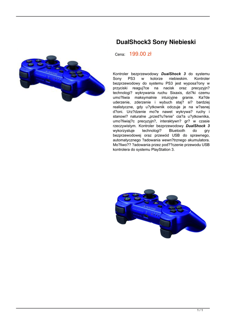 DualShock3 Sony Niebieski Cena: 199.00 zł Kontroler bezprzewodowy DualShock 3 do systemu Sony PS3 w kolorze niebieskim. Kontroler bezprzewodowy do systemu PS3 jest wyposa?ony w przyciski reaguj?ce na nacisk oraz precyzyjn? technologi? wykrywania ruchu Sixaxis, dzi?ki czemu umo?liwia maksymalnie intuicyjne granie. Ka?de uderzenie, zderzenie i wybuch staj? si? bardziej realistyczne, gdy u?ytkownik odczuje je na w?asnej d?oni. Urz?dzenie mo?e nawet wykrywa? ruchy i stanowi? naturalne „przed?u?enie” cia?a u?ytkownika, umo?liwiaj?c precyzyjn?, interaktywn? gr? w czasie rzeczywistym. Kontroler bezprzewodowy DualShock 3 wykorzystuje technologi? Bluetooth do gry bezprzewodowej oraz przewód USB do sprawnego, automatycznego ?adowania wewn?trznego akumulatora. Mo?liwo?? ?adowania przez pod??czenie przewodu USB kontrolera do systemu PlayStation 3. 1/1 Powered by TCPDF (www.tcpdf.org)