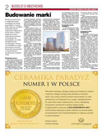 2 DODATEK PROMOCYJNO-REKLAMOWY Budowanie marki Rynek nieruchomoÊci to najdynamiczniej rozwijajàca si´ bran˝a gospodarki w naszym kraju. Oporna wszelkim przewidywaniom, naukowym za∏o˝eniom, od lat tak˝e w Polsce rzàdzi si´ swoimi niepisanymi prawami. Utrzymujàca si´ koniunktura na rynku mieszkaniowym, wysoki popyt i wzrost cen mieszkaƒ na rynku pierwotnym stworzy∏ okazj´ do inwestowania w nieruchomoÊci nieobarczone ryzykiem straty. Wiarygodny partner Ka˝dy inwestor reprezentujàcy rodzin´ czy du˝y kapita∏ musi dokonaç wyboru firmy deweloperskiej i w dzisiejszych czasach kieruje si´ przede wszystkim: gwarancjà dobrze ulokowanych pieni´dzy, wiarygodnoÊcià firmy na rynku. W wyborze dewelopera nie pomaga dzisiaj doskonale funkcjonujàcy rynek REKLAMA „marketingu zast´pczego”, snobowanie firm na najlepsze. Poszukiwanie „firmy z gwarancjà” u∏atwiajà badania przeprowadzone przez niezale˝ne firmy pracujàce na rzecz gospodarki, w których parametrami oceny dewelopera sà opinie ich klientów. Badania poÊwi´cone „Planom i decyzjom internautów w procesie kupowania mieszkaƒ” przeprowadzone przez warszawskà firm´ Arbo Gemius S.A. wskaza∏y na gdyƒskà firm´ Allcon Osiedla – jako najbardziej wiarygodnego wÊród trójmiejskich deweloperów. Klienci docenili rzetelnoÊç dewelopera na wszystkich etapach wspó∏pracy, terminowoÊç, standardy, jakie powinny funkcjonowaç w ka˝dej firmie na europejskim poziomie. – To nie jedyne atuty, jakie wyró˝niajà naszà firm´ – zapewnia Alina ¸uczycka, Dyrektor Generalny w firmie Allcon Osiedla. – O naszej pozycji na rynku decyduje tak˝e zrównowa˝ony rozwój firmy, jakoÊç produktu i przede wszystkim wysoki poziom obs∏ugi. Wygrywamy z konkurencjà najkrótszymi terminami realizacji, które uwiarygodniajà firm´, dysponujàcà w∏asnym wykonawstwem (Allcon S.A.). W naszym wewn´trznym programie Zarzàdzania JakoÊcià przyj´liÊmy zasad´ „4S”: specjalizacja, standard, solidnoÊç, szybkoÊç. Roczne oceny realizacji programu „ 4S” opiniujà i recenzujà nasi klienci, wystawiajà nam ocen´ za okres wspó∏pracy, jest to dla nas najbardziej obiektywne badanie naszych umiej´tnoÊci. MyÊl´, ˝e najwi´kszym wyzwaniem dla nas jest umacnianie marki firmy, z pe∏nà ÊwiadomoÊcià, i˝ najwa˝niejszym podmiotem naszej pracy jest – Klient. Wysokie umiej´tnoÊci firmy w zakresie realizacji projektów, które wyró˝nia jakoÊç i nowoczesna architektura, dostrzegli tak˝e arbitrzy: W 2006 r. budynek „Red∏owska Kaskada” dosta∏ ogólnopolskà nagrod´ 1-go stopnia przyznawanà przez Kapitu∏´ Ogólnopolskiego Nagrodzona realizacja „Red∏owska Kaskada”. Konkursu „Budowa Roku”, organizowanego przez Zwiàzek In˝ynierów i Techników Budownictwa, zdoby∏ tak˝e nagrod´ „Czas Gdyni” dla najlepszej inwestycji 2006 roku w Gdyni, przyznawanà przez Rad´ Miasta. W 2002 roku gdyƒska inwestycja „Witawa” – kompleks mieszkaniowy w sercu Witomina, otrzyma∏ tytu∏ „Budowa Roku”. Firma nie boi si´ wyzwaƒ; pionierskie na rynku trójmiejskim dzia∏ania, polegajà- ce na przekszta∏caniu terenów poprzemys∏owych w mieszkaniowe, ma ju˝ za sobà. Dzisiaj na tym terenie powstaje jedno z naj∏adniejszych osiedli mieszkaniowych „Nova Oliva”, po∏o˝one prawie w sercu miasta, Êwietnie skomunikowane z trójmiejskà aglomeracjà. Zarówno lokalizacja, jak i przyjazna, niska zabudowa inwestycji zdoby∏a uznanie klientów. Europejskie zasady wspó∏pracy Po wielu spektakularnych medialnie upadkach firm deweloperskich, których efektem by∏a utrata wiarygodnoÊci bran˝y, zaistnia∏a koniecznoÊç zagwarantowania naszym klientom bezpieczeƒstwa wspó∏pracy z firmà Allcon Osiedla. Po raz pierwszy w 2003 roku firma zdecydowa∏a si´ poddaç audytowi zewn´trznemu przeprowadzonemu przez Polski Zwiàzek Pracodawców Budownictwa, którego efektem by∏o przyznanie Allcon Osiedla Certyfikatu Dewelopera, potwierdzajàcego wiarygodnoÊç i rzetelnoÊç dewelopera na rynku. Ten wyjàtkowy „znak jakoÊci” przyznawany jest na czas okreÊlony, na 2 lata. – Konsekwentne poszukiwanie rzetelnych partnerów biznesowych na polskim rynku, a tak˝e skutecznych rozwiàzaƒ dla trudnych problemów bran˝y mieszkaniowej spowodowa∏y powstanie Polskiego Zwiàzku Firm Deweloperskich, którego Allcon Osiedla jest aktywnym cz∏onkiem i partnerem – mówi Dyrektor Generalny Alina ¸uczycka. Jednym z pierwszych konkretnych postulatów P.Z.F.D. by∏o opracowanie regulaminu zapisów stosowanych w umowach deweloperskich, tak powsta∏ Kodeks Dobrych Praktyk, przyjazne i bezpieczne dla klientów paragrafy, opracowane wraz z Urz´dem Ochrony Konsumentów przy udziale naszej firmy – i to sà nasze ma∏e sukcesy, które dzisiaj wp∏ywajà na nasze dobre samopoczucie, komfort pracy – mówi Alina ¸uczycka. Zarzàdzanie przez kompetencje – Nie ukrywam, ˝e zale˝y mi na dalszej wspó∏pracy z firmà – mówi Mariola Krakowiak, Doradca Zarzàdu ds. Sprzeda˝y i Marketingu. – Jestem przekonana, ˝e nie jestem odosobniona w swojej opinii. Mam mo˝liwoÊç pracowaç z profesjonalnym i przede wszystkim kreatywnym zespo∏em pracowników, ale przewodzà nam ludzie o wyjàtkowej kulturze osobistej, co ma znaczenie nie tylko dla relacji wewn´trznych w firmie, ale przede wszystkim kontaktów z klientami. Naszej dobrej wspó∏pracy sprzyjajà czytelnie i jasno okreÊlone cele i oczekiwania, wysoko oceniana jest nasza skutecznoÊç w ich realizacji. MyÊl´, ˝e na sukces naszej firmy najwi´kszy wp∏yw ma styl zarzàdzania, umiej´tnoÊç skoncentrowania nas wszystkich wokó∏ tematów, problemów wymagajàcych rozwiàzania, które wspólnie, z pasjà osiàgamy. Mamy poczucie, ˝e kolejny sukces firmy jest naszà zas∏ugà. Bardzo si´ cieszymy z nominacji do tytu∏u „EUropejska Firma 2007”. MyÊl´, ˝e Êmia∏o na niego zas∏ugujemy. Jakub Lisiecki