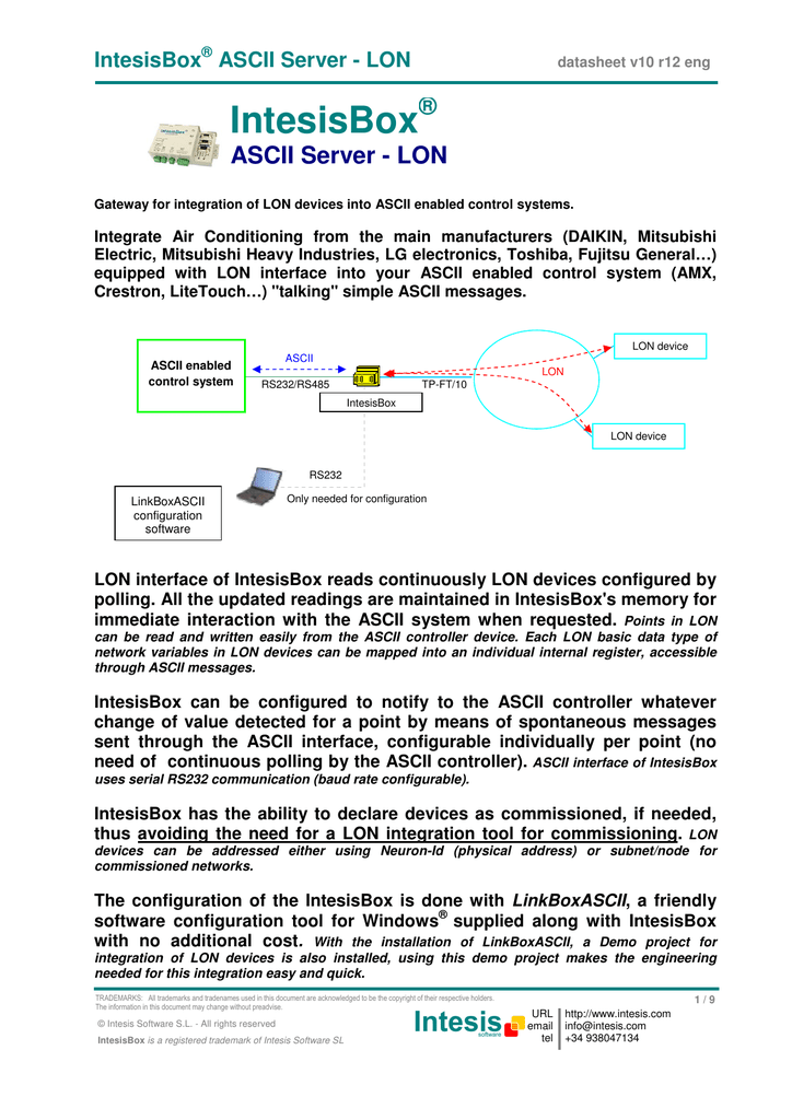 IntesisBox® ASCII Server - LON datasheet v10 r12 eng IntesisBox® ASCII Server - LON Gateway for integration of LON devices into ASCII enabled control systems. Integrate Air Conditioning from the main manufacturers (DAIKIN, Mitsubishi Electric, Mitsubishi Heavy Industries, LG electronics, Toshiba, Fujitsu General…) equipped with LON interface into your ASCII enabled control system (AMX, Crestron, LiteTouch…) "talking" simple ASCII messages. LON device ASCII enabled control system ASCII LON RS232/RS485 TP-FT/10 IntesisBox LON device RS232 LinkBoxASCII configuration software Only needed for configuration LON interface of IntesisBox reads continuously LON devices configured by polling. All the updated readings are maintained in IntesisBox's memory for immediate interaction with the ASCII system when requested. Points in LON can be read and written easily from the ASCII controller device. Each LON basic data type of network variables in LON devices can be mapped into an individual internal register, accessible through ASCII messages. IntesisBox can be configured to notify to the ASCII controller whatever change of value detected for a point by means of spontaneous messages sent through the ASCII interface, configurable individually per point (no need of continuous polling by the ASCII controller). ASCII interface of IntesisBox uses serial RS232 communication (baud rate configurable). IntesisBox has the ability to declare devices as commissioned, if needed, thus avoiding the need for a LON integration tool for commissioning. LON devices can be addressed either using Neuron-Id (physical address) or subnet/node for commissioned networks. The configuration of the IntesisBox is done with LinkBoxASCII, a friendly software configuration tool for Windows® supplied along with IntesisBox with no additional cost. With the installation of LinkBoxASCII, a Demo project for integration of LON devices is also installed, using this demo project makes the engineering needed for this integration easy and quick. TRADEMARKS: All trademarks and tradenames used in this document are acknowledged to be the copyright of their respective holders. The information in this document may change without preadvise. © Intesis Software S.L. - All rights reserved IntesisBox is a registered trademark of Intesis Software SL 1/9 URL email tel http://www.intesis.com [email protected] +34 938047134 IntesisBox® ASCII Server - LON datasheet v10 r12 eng IntesisBox capacity Element Max. (Basic version) Max. (Extended version) Type of LON devices Supported number of LON network variable fields 500 4000 Supported number of LON devices 64 128 Notes Those supporting Free Topology channel (FT10) Maximum number of points (ASCII registers) that can be defined into IntesisBox. Each of them can contain an individual field from a LON network variable. Maximum number of different LON devices that can be defined into IntesisBox (to read/write points into them). ® There are two different models of IntesisBox ASCII Server - LON with different capacity each one. • • Basic version with capacity of 500 points and 64 LON devices. Ref.: IBOX-ASCII-LON-A Extended version with capacity of 4000 points and 128 LON devices. Ref.: IBOX-ASCII-LON-B TRADEMARKS: All trademarks and tradenames used in this document are acknowledged to be the copyright of their respective holders. The information in this document may change without preadvise. © Intesis Software S.L. - All rights reserved IntesisBox is a registered trademark of Intesis Software SL 2/9 URL email tel http://www.intesis.com [email protected] +34 938047134 IntesisBox® ASCII Server - LON datasheet v10 r12 eng Sample applications Integration of any LON device or system into ASCII enabled control systems. ASCII ASCII enabled control system LON device LON RS232/RS485 TP-FT/10 IntesisBox LON device Control system with ASCII master interface. • • • • • • • BMS. SCADA. PLC. AMX. Crestron. LiteTouch. … Typical LON devices or Systems equipped with LON interface: • • • • • • • • • • • ASCII Air conditioners (Daikin, Mitsubishi Electric, Mitsubishi Heavy Ind, Toshiba, LG…). Chillers. Heaters. Thermostats. Fan coil controllers. Room controllers. Power meters. Energy meters. Building Control Systems (BMS). Programmable Logic Controllers (PLC). … Full supervision and control System supervising / controlling TRADEMARKS: All trademarks and tradenames used in this document are acknowledged to be the copyright of their respective holders. The information in this document may change without preadvise. © Intesis Software S.L. - All rights reserved IntesisBox is a registered trademark of Intesis Software SL LON System under supervision / control 3/9 URL email tel http://www.intesis.com [email protected] +34 938047134 IntesisBox® ASCII Server - LON datasheet v10 r12 eng Typical applications Integration of Daikin VRV Air Conditioning into ASCII enabled control systems. For this application, Daikin VRV Air Conditioning system must be equipped with Daikin LON gateway (model DMS504B51), this Daikin gateway is normally commissioned by Daikin technical personnel, contact your nearest Daikin distributor for details. …… Indoor units DIII-NET Outdoor units LON Free Topology (FT-10) network DMS504B51 RS232 ASCII ® IntesisBox ASCII Server - LON ASCII master device In the technical documentation of IntesisBox supplied with the device, extended details on how to configure IntesisBox for this application is provided. Also, if you are interested in this kind of application, Intesis Software can provide you sample projects for IntesisBox, these sample projects contain specific configuration to integrate any brand of air conditioning with LonWorks connectivity, with these sample projects the configuration and commissioning of IntesisBox for this kind of application becomes easy and quick, almost plug & play. TRADEMARKS: All trademarks and tradenames used in this document are ackno