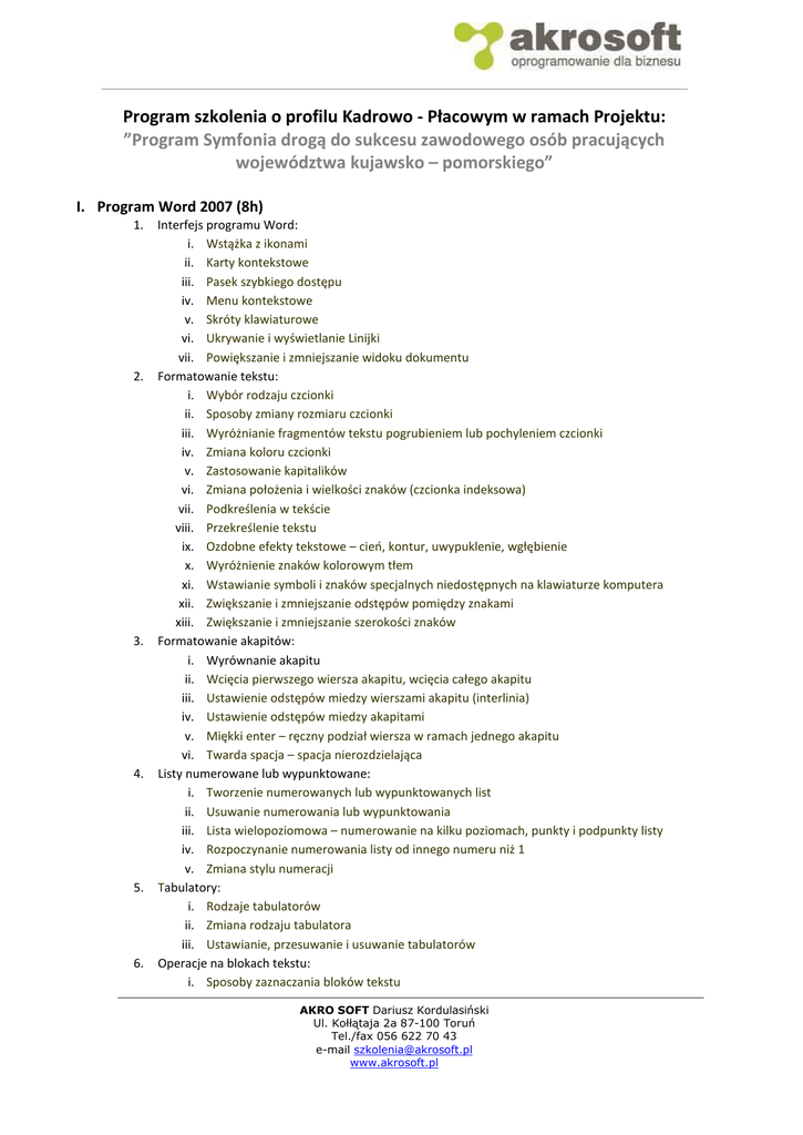 Program szkolenia o profilu Kadrowo - Płacowym w ramach Projektu: ”Program Symfonia drogą do sukcesu zawodowego osób pracujących województwa kujawsko – pomorskiego” I. Program Word 2007 (8h) 1. 2. 3. 4. 5. 6. Interfejs programu Word: i. Wstążka z ikonami ii. Karty kontekstowe iii. Pasek szybkiego dostępu iv. Menu kontekstowe v. Skróty klawiaturowe vi. Ukrywanie i wyświetlanie Linijki vii. Powiększanie i zmniejszanie widoku dokumentu Formatowanie tekstu: i. Wybór rodzaju czcionki ii. Sposoby zmiany rozmiaru czcionki iii. Wyróżnianie fragmentów tekstu pogrubieniem lub pochyleniem czcionki iv. Zmiana koloru czcionki v. Zastosowanie kapitalików vi. Zmiana położenia i wielkości znaków (czcionka indeksowa) vii. Podkreślenia w tekście viii. Przekreślenie tekstu ix. Ozdobne efekty tekstowe – cień, kontur, uwypuklenie, wgłębienie x. Wyróżnienie znaków kolorowym tłem xi. Wstawianie symboli i znaków specjalnych niedostępnych na klawiaturze komputera xii. Zwiększanie i zmniejszanie odstępów pomiędzy znakami xiii. Zwiększanie i zmniejszanie szerokości znaków Formatowanie akapitów: i. Wyrównanie akapitu ii. Wcięcia pierwszego wiersza akapitu, wcięcia całego akapitu iii. Ustawienie odstępów miedzy wierszami akapitu (interlinia) iv. Ustawienie odstępów miedzy akapitami v. Miękki enter – ręczny podział wiersza w ramach jednego akapitu vi. Twarda spacja – spacja nierozdzielająca Listy numerowane lub wypunktowane: i. Tworzenie numerowanych lub wypunktowanych list ii. Usuwanie numerowania lub wypunktowania iii. Lista wielopoziomowa – numerowanie na kilku poziomach, punkty i podpunkty listy iv. Rozpoczynanie numerowania listy od innego numeru niż 1 v. Zmiana stylu numeracji Tabulatory: i. Rodzaje tabulatorów ii. Zmiana rodzaju tabulatora iii. Ustawianie, przesuwanie i usuwanie tabulatorów Operacje na blokach tekstu: i. Sposoby zaznaczania bloków tekstu AKRO SOFT Dariusz Kordulasiński Ul. Kołłątaja 2a 87-100 Toruń Tel./fax 056 622 70 43 e-mail [email protected] www.akrosoft.pl ii. Kopiowanie i wklejanie fragmentów tekstu iii. Opcje wklejania tekstu iv. Wklej specjalnie, usuwanie formatowania tekstu v. Wycinanie fragmentów tekstu vi. Przesuwanie fragmentów tekstu 7. Wyszukiwanie i zamiana: i. Wyszukiwanie fragmentów tekstu ii. Wyszukiwanie i zamiana fragmentów tekstu 8. Wstawianie grafiki do tekstu: i. Wstawianie rysunku/obrazu do dokumentu ii. Dostosowanie rozmiaru obrazu iii. Obracanie obrazu iv. Położenie obrazu na stronie v. Sposób opływania obrazu przez tekst vi. Dodawanie podpisów pod obrazami vii. Wstawianie tekstów ozdobnych do dokumentu – obiekty WordArt 9. Tabele: i. Wstawianie tabeli do dokumentu ii. Usuwanie tabeli z dokumentu iii. Zmiana szerokości i wysokości kolumn lub wierszy iv. Zmiana wielkości tabeli v. Dodawanie nowych kolumn i wierszy do tabeli vi. Dzielenie i łączenie komórek tabeli vii. Edycja tekstu w tabeli, poruszanie się po polach tabeli viii. Wyrównanie tekstu w komórkach w pionie i poziomie ix. Kierunek tekstu – ustawienie pionowego i poziomego układu tekstu w komórce x. Sortowanie danych w tabeli xi. Automatyczne formatowanie tabeli xii. Obramowanie i cieniowanie tabeli 10. Formatowanie strony: i. Ustawianie marginesów i orientacji strony ii. Ustawianie kolumnowego układu tekstu iii. Wstawianie nagłówków i stopki strony iv. Edycja tekstu nagłówka i stopki v. Wstawianie numeracji stron 11. Narzędzia wspomagające edycję: i. Sprawdzanie pisowni ii. Dodawanie nowych wyrazów do słownika iii. Cofanie i ponawianie operacji iv. Wyświetlanie znaczników pokazujących miejsce wprowadzenia spacji, tabulatora i znaku końca akapitu v. Autokorekta, sposób na szybkie wstawianie nietypowych znaków i fragmentów tekstu vi. Automatyczna zamiana małych liter na duże i dużych na małe vii. Uaktywnienie klawisza Insert – pisanie w trybie wstawiania lub zastępowania viii. Malarz formatów – szybki sposób na kopiowanie formatowania AKRO SOFT Dariusz Kordulasiński Ul. Kołłątaja 2a 87-100 Toruń Tel./fax 056 622 70 43 e-mail [email protected] www.akrosoft.pl ix. II. Program Excel (8h) 1. 2. 3. 4. 5. 6. Zapoznanie z pojęciami i środowiskiem programu Excel i. elementy okna programu Microsoft Excel ii. korzystanie z Pomocy iii. zapisywanie i ochrona pliku iv. poruszanie się po skoroszycie v. praca nad układem arkusza vi. wprowadzanie i edytowanie danych tekstowych i liczbowych vii. kopiowanie i przenoszenie danych. Formatowanie i podstawowe operacje na danych i. formatowanie liczbowe, walutowe, procentowe, tekstowe ii. obramowanie i cieniowanie komórek iii. zmiana koloru i położenia tekstu iv. wykorzystanie Autoformatowania v. wyszukiwanie i zastępowanie zawartości komórek vi. wypełnianie komórek seriami danych. Formuły i funkcje w programie Excel i. budowanie i edycja formuł ii. omówienie adresowania względnego i bezwzględnego iii. autowypełnianie i kopiowanie formuł iv. wykorzystanie funkcji wbudowanych Excela v. sprawdzanie poprawności formuł (Inspekcja). Dodatkowe narzędzia programu Excel i. sortowanie ii. filtrowanie danych przy wykorzystaniu Autofiltru iii. sprawdzanie błędów pisowni iv. autokorekta Wykresy i grafika i. korzystanie z Kreatora wykresów ii. modyfikowanie wykresów iii. wykorzystanie paska narzędzi Rysowanie iv. wstawianie i formatowanie obiektów graficznych (rysunków, zdjęć) v. dodawanie i edycja komentarzy. Ustawienia strony i przygotowanie dokumentu do wydruku i. formatowanie i podział stron do wydruku ii. tworzenie nagłówka i stopki iii. podgląd i drukowanie zawartości arkusza AKRO SOFT Dariusz Kordulasiński Ul. Kołłątaja 2a 87-100 Toruń Tel./fax 056 622 70 43 e-mail [email protected] www.akrosoft.pl III. Program SYMFONIA Kadry i Płace (32h) 1. 2. 3. 4. 5. 6. 7. 8. 9. 10. 11. 12. 13. 14. 15. 16. 17. 18. 19. Zakładanie firmy Pracownicy Okresy płacowe i. Dodawanie nowego okresu płacowego ii. Wybór okresu płacoweg
