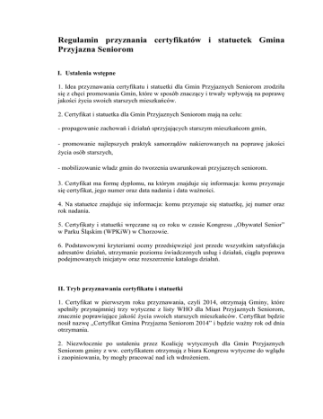 Regulamin przyznania certyfikatów i statuetek Gmina Przyjazna Seniorom I. Ustalenia wstępne 1. Idea przyznawania certyfikatu i statuetki dla Gmin Przyjaznych Seniorom zrodziła się z chęci promowania Gmin, które w sposób znaczący i trwały wpływają na poprawę jakości życia swoich starszych mieszkańców. 2. Certyfikat i statuetka dla Gmin Przyjaznych Seniorom mają na celu: - propagowanie zachowań i działań sprzyjających starszym mieszkańcom gmin, - promowanie najlepszych praktyk samorządów nakierowanych na poprawę jakości życia osób starszych, - mobilizowanie władz gmin do tworzenia uwarunkowań przyjaznych seniorom. 3. Certyfikat ma formę dyplomu, na którym znajduje się informacja: komu przyznaje się certyfikat, jego numer oraz data nadania i data ważności. 4. Na statuetce znajduje się informacja: komu przyznaje się statuetkę, jej numer oraz rok nadania. 5. Certyfikaty i statuetki wręczane są co roku w czasie Kongresu „Obywatel Senior” w Parku Śląskim (WPKiW) w Chorzowie. 6. Podstawowymi kryteriami oceny przedsięwzięć jest przede wszystkim satysfakcja adresatów działań, utrzymanie poziomu świadczonych usług i działań, ciągła poprawa podejmowanych inicjatyw oraz rozszerzenie katalogu działań. II. Tryb przyznawania certyfikatu i statuetki 1. Certyfikat w pierwszym roku przyznawania, czyli 2014, otrzymają Gminy, które spełniły przynajmniej trzy wytyczne z listy WHO dla Miast Przyjaznych Seniorom, znacznie poprawiające jakość życia swoich starszych mieszkańców. Certyfikat będzie nosił nazwę „Certyfikat Gmina Przyjazna Seniorom 2014” i będzie ważny rok od dnia otrzymania. 2. Niezwłocznie po ustaleniu przez Koalicję wytycznych dla Gmin Przyjaznych Seniorom gminy z ww. certyfikatem otrzymają z biura Kongresu wytyczne do wglądu i zaopiniowania, by mogły pracować nad ich wdrożeniem. 3. W latach następnych certyfikat otrzymują gminy, które spełniły przynajmniej trzy wytyczne z listy ustalonej przez Koalicję na rzecz Gmin Przyjaznych Seniorom, o których mowa w punktach III i IV. 4. Przyjmując certyfikat (prócz certyfikatu jednorocznego) gmina deklaruje, że w ciągu trzech lat realizować będzie wszystkie wytyczne dla Gmin Przyjaznych Seniorom ustalone przez Koalicję na rzecz Gmin Przyjaznych Seniorom. Gmina nie powinna zaprzestać stosowania wytycznych. 5. Certyfikat (wyjątek pkt. 1) ważny jest trzy lata od dnia nadania. Po upływie tego czasu traci ważność. 6. Koalicja może w uzasadnionych przypadkach przedłużyć ważność certyfikatu o sześć miesięcy. 7. Jeśli w ciągu trzech lat od nadania certyfikatu gmina wykona wytyczne (wyjątek pkt. 1 i 5), otrzyma statuetkę Gmina Przyjazna Seniorom. 8. Decyzję, czy gmina zrealizowała wytyczne, podejmuje Koalicja (większość członków), przedstawiciele seniorów z danej gminy (max. 10 osób w wieku 60+) oraz – jeśli takowe w gminie są – przedstawiciele organizacji senioralnych (utw, klubu seniora, koła gospodyń wiejskich itp. po max. 3 osoby z każdej organizacji). Decyzja podejmowana jest większością głosów. W przypadku równej liczby głosów rozstrzygającym jest głos przewodniczącego Koalicji. 9. Gmina, która otrzymała statuetkę Gmina Przyjazna Seniorom, może używać logo Gmina Przyjazna Seniorom na swoich materiałach promocyjnych i stronie internetowej gminy po uzyskaniu pisemnej zgody przedstawiciela biura Kongresu „Obywatel Senior”. III. Wytyczne dla Gmin Przyjaznych Seniorom 1. Wytyczne dla Gmin Przyjaznych Seniorom ustala Koalicja na rzecz Gmin Przyjaznych Seniorom. 2. Wytyczne ustalone są na podstawie wytycznych WHO dla Miast Przyjaznych Seniorom, wniosków z dyskusji w czasie Kongresów „Obywatel Senior” w WPKiW oraz ankiet przeprowadzonych wśród osób starszych. 3. Wytyczne mogą być uaktualniane raz w roku, po kolejnych Kongresach „Obywatel Senior”. Uaktualnienia dokonuje Koalicja. IV. Koalicja 1. Koalicję na rzecz Gmin Przyjaznych Seniorom zawiązują: WPKiW im. Gen. J. Ziętka SA, Fundacja Park Śląski, Polskie Towarzystwo Gerontologiczne, Fundacja Rozwoju Demokracji Lokalnej i Stowarzyszenie Gerontologów Społecznych. 2. Przewodniczącym Koalicji jest przedstawiciel WPKiW im. Gen. J. Ziętka SA. 3. Koalicja może być rozszerzana. Decyzję o tym podejmują koalicjanci większością głosów. 4. W przypadku równej liczby głosów rozstrzygającym jest głos przewodniczącego Koalicji 5. Koalicjanci (przedstawiciele organizacji) spotykają się w ustalonych przez siebie terminach przynajmniej dwa razy w roku. 6. Członkowie Koalicji za swoją pracę nie otrzymują wynagrodzenia. 7. Koalicja obraduje na posiedzeniach, które mają charakter niejawny. 8. Posiedzenia Koalicji zwołuje biuro Kongresu. 9. Dla ważności posiedzenia konieczna jest obecność połowy członków Koalicji. 10. Posiedzenia Koalicji są protokołowane, protokoły znajdują się do wglądu zainteresowanych członków Koalicji w biurze Kongresu. 11. Koalicja pracuje w oparciu o niniejszy regulamin. Wszelkie zmiany w regulaminie wymagają jej zgody. 12. Obsługę administracyjno-techniczną Koalicji zapewnia biuro Kongresu. V. Zgłaszanie kandydatów 1. Kandydatów do certyfikatu dla Gmin Przyjaznych Seniorów mogą zgłaszać same jednostki samorządu terytorialnego, organizacje pozarządowe, organizacje/instytucje działające na rzecz seniorów i sami seniorzy. 2. Zgłoszenia przyjmowane są w biurze Kongresu „Obywatel Senior” w Parku Śląskim (WPKiW) mailem lub pocztą konwencjonalną. 3. Zgłoszenia powinny zawierać nazwę gminy – kandydata do certyfikatu oraz opis trzech dobrych praktyk w znacznym stopniu wpływających na poprawę jakości życia starszych mieszkańców gminy. 4. Dobre praktyki powinny być opisane zgodnie z wytycznymi (załącznik 1) oraz pokazane na prezentacji multimedialnej w programie PowerPoint (ok. 10 slajdów) stanowiącej syntezę opisanych dobrych praktyk. 5. Kompletna dokumentac