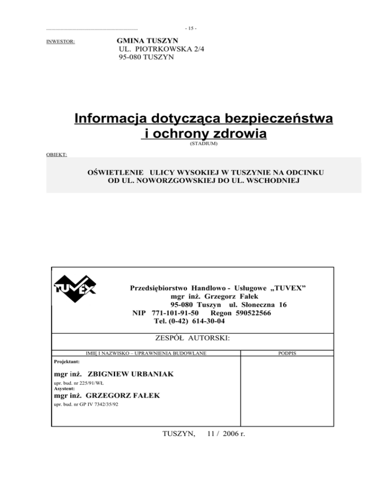 ...................................................................... - 15 - GMINA TUSZYN UL. PIOTRKOWSKA 2/4 95-080 TUSZYN INWESTOR: Informacja dotycząca bezpieczeństwa i ochrony zdrowia (STADIUM) OBIEKT: OŚWIETLENIE ULICY WYSOKIEJ W TUSZYNIE NA ODCINKU OD UL. NOWORZGOWSKIEJ DO UL. WSCHODNIEJ Przedsiębiorstwo Handlowo - Usługowe „TUVEX” mgr inż. Grzegorz Fałek 95-080 Tuszyn ul. Słoneczna 16 NIP 771-101-91-50 Regon 590522566 Tel. (0-42) 614-30-04 ZESPÓŁ AUTORSKI: IMIĘ I NAZWISKO – UPRAWNIENIA BUDOWLANE PODPIS Projektant: mgr inż. ZBIGNIEW URBANIAK upr. bud. nr 225/91/WŁ Asystent: mgr inż. GRZEGORZ FAŁEK upr. bud. nr GP IV 7342/35/92 TUSZYN, 11 / 2006 r. - 16 – CZĘŚĆ OPISOWA 1. Zakres i kolejność robót Zamierzenie inwestora obejmuje wybudowanie linii napowietrznej oświetlenia ul. Wysokiej w Tuszynie na odcinku od ul. Noworzgowskiej do skrzyżowania z ul. Wschodnią Roboty będą prowadzone w następującej kolejności : 1. roboty elektromontażowe 2. roboty elektroinstalacyjne 2. Wykaz istniejących obiektów budowlanych Na terenie objętym zakresem opracowania znajdują się: - napowietrzna linia n.n - napowietrzna linia telefoniczna - kablowa linia sn. - kablowe linie n.n - gazociąg g200 - wodociąg w110 - przyłącza wodociągowe, gazowe i kanalizacyjne - zabudowania mieszkalne 3. Wskazanie elementów zagospodarowania działki lub terenu, które mogą stwarzać zagrożenie bezpieczeństwa i zdrowia ludzi - nie występują 4. Wskazanie dotyczące przewidywanych zagrożeń występujących podczas realizacji robót budowlanych 1. Roboty budowlane , których charakter, organizacja , lub miejsce prowadzenia stwarza szczególne wysokie ryzyko zagrożenia bezpieczeństwa i zdrowia ludzi - występują roboty prowadzone w odległości mniejszej niż 3,0 m od elektroenergetycznej linii napowietrznej n.n występują roboty prowadzone w odległości mniejszej niż 5 m od kablowej linii s.n. występują roboty przy których istnieje zagrożenie upadku z wysokości powyżej 5m 2. Roboty budowlane przy prowadzeniu których występują działania substancji chemicznych, lub czynników zagrażających bezpieczeństwu i zdrowiu ludzi - nie występują 3. Roboty budowlane stwarzające zagrożenie promieniowaniem jonizującym - nie występują 4. Roboty budowlane prowadzone w pobliżu linii wysokiego napięcia lub czynnych linii komunikacyjnych - występują roboty w pasie drogowym ulicy po której może odbywać się ruch 5. Roboty budowlane stwarzające ryzyko utonięcia pracowników - nie występują - 17 - 6. Roboty budowlane prowadzone w studniach, pod ziemią i w tunelach - nie występują 7.Roboty budowlane wykonywane przez kierujących pojazdami zasilanymi z sieci napowietrznych - nie występują 8.Roboty budowlane wykonywane w kesonach, z atmosferą wytwarzaną ze sprężonego powietrza - nie występują 9. Roboty budowlane wymagające użycia materiałów wybuchowych - nie występują 10. Roboty budowlane prowadzone przy montażu i demontażu ciężkich elementów prefabrykowanych - nie występują 5. Wskazanie sposobu prowadzenia instruktażu pracowników przed przystąpieniem do realizacji robót szczególnie niebezpiecznych. - przewiduje się zapoznanie pracowników z planem BIOZ , oraz instruktaż przeprowadzony przez kierownika robót. pracownicy powinni posiadać aktualne szkolenia w zakresie BHP, oraz aktualne badania lekarskie 6.Wskazanie środków technicznych i organizacyjnych, zapobiegających niebezpieczeństwom wynikającym z wykonywania robót budowlanych w strefach szczególnego zagrożenia lub w ich sąsiedztwie Dla prawidłowego przebiegu robót należy je wykonywać pod kierunkiem osoby uprawnionej i przestrzegać przepisów BHP. Roboty prowadzone na czynnej linii napowietrznej muszą być prowadzone po jej wyłączeniu i w uzgodnieniu z Zakładem Energetycznym. Do wykonywania robót używać odpowiedniego i sprawnego sprzętu i narzędzi. Teren budowy oznakować tablicami informacyjnymi. Roboty prowadzić zgodnie ze sztuką budowlaną. OPRACOWAŁ: