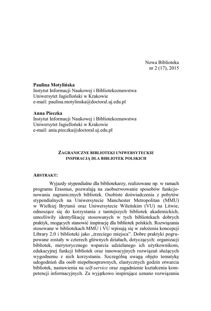 Nowa Biblioteka nr 2 (17), 2015 Paulina Motylińska Instytut Informacji Naukowej i Bibliotekoznawstwa Uniwersytet Jagielloński w Krakowie e-mail: [email protected] Anna Pieczka Instytut Informacji Naukowej i Bibliotekoznawstwa Uniwersytet Jagielloński w Krakowie e-mail: [email protected] ZAGRANICZNE BIBLIOTEKI UNIWERSYTECKIE INSPIRACJĄ DLA BIBLIOTEK POLSKICH ABSTRAKT: Wyjazdy stypendialne dla bibliotekarzy, realizowane np. w ramach programu Erasmus, pozwalają na zaobserwowanie sposobów funkcjonowania zagranicznych bibliotek. Osobiste doświadczenia z pobytów stypendialnych na Uniwersytecie Manchester Metropolitan (MMU) w Wielkiej Brytanii oraz Uniwersytecie Wileńskim (VU) na Litwie, odnoszące się do korzystania z tamtejszych bibliotek akademickich, umożliwiły identyfikację stosowanych w tych bibliotekach dobrych praktyk, mogących stanowić inspirację dla bibliotek polskich. Rozwiązania stosowane w bibliotekach MMU i VU wpisują się w założenia koncepcji Library 2.0 i biblioteki jako „trzeciego miejsca”. Dobre praktyki pogrupowane zostały w czterech głównych działach, dotyczących: organizacji bibliotek, merytorycznego wsparcia udzielanego ich użytkownikom, edukacyjnej funkcji bibliotek oraz innowacyjnych rozwiązań służących wygodnemu z nich korzystaniu. Szczególną uwagą objęto tematykę udogodnień dla osób niepełnosprawnych, elastycznych godzin otwarcia bibliotek, nastawienia na self-service oraz zagadnienie kształcenia kompetencji informacyjnych. Za wyjątkowo inspirujące uznano rozwiązania 38 Paulina Motylińska, Anna Pieczka służące kreowaniu pozytywnego wizerunku biblioteki, w tym m.in. istnienie strefy rozrywki, phone zone czy wypożyczalni laptopów. Stopniowe wdrażanie wybranych dobrych praktyk, dostosowanych do specyfiki polskiego bibliotekarstwa, mogłoby znacząco wpłynąć na podniesienie jakości funkcjonowania rodzimych bibliotek. SŁOWA KLUCZOWE: Biblioteka 2.0. Bibliotekarstwo zagraniczne. Biblioteki uniwersyteckie. Library 2.0. Trzecie miejsce. Uniwersytet Manchester Metropolitan. Uniwersytet Wileński Wstęp Wyjazdy zagraniczne, umożliwiające wymianę fachowej wiedzy, umiejętności i doświadczeń, stanowią przedmiot żywego zainteresowania polskich bibliotekarzy. W zamieszczanych w piśmiennictwie branżowym licznych sprawozdaniach z realizowanych za granicą staży, kursów i szkoleń wyjazdy tego rodzaju postrzegane są jako źródło nowych doświadczeń i inspirujących pomysłów, a także jako niezbędny element rozwoju kariery zawodowej bibliotekarzy. W literaturze naukowej pojawiają się opisy możliwości wyjazdów na stypendia zagraniczne, czego przykład stanowić może przegląd programów stypendialnych autorstwa Marty Stąporek, odnoszący się do wyjazdów przeznaczonych dla bibliotekarzy akademickich [22]. Pomimo widocznego w piśmiennictwie pozytywnego nastawienia do wyjazdów zagranicznych, tylko jednostkowe publikacje zawierają opisy rzeczywistych wdrożeń innowacji lub nowych pomysłów powstałych na bazie takich wyjazdów. Analiza piśmiennictwa z tego zakresu pokazała, że wśród publikacji dominują wspomnienia i sprawozdania bibliotekarzy z pobytów na różnego typu stażach i stypendiach. W 2009 r. wydano numer „Biuletynu EBIB” poświęcony w całości wyjazdom zagranicznym – Staże zagraniczne bibliotekarzy. Właśnie „Biuletyn EBIB” jest jednym z głównych publikatorów tego typu piśmiennictwa branżowego; sprawozdania i wspomnienia z wyjazdów zagranicznych pojawiają się także m.in. w „Bibliotekarzu” i „Poradniku Bibliotekarza”. W „Biuletynie EBIB” można znaleźć m.in. sprawozdanie Dominiki Woźniak z wyjazdu szkoleniowego do Biblioteki Głównej Universität für Bodenkultur Wien w Austrii [26], sprawozdanie Olgi Schabowicz z praktyki w bibliotece Północno-Kaukaskiego Państwowego Uniwersytetu Technicznego w Stavropolu w Rosji [21] oraz opis pobytu Barbary 39 Zagraniczne biblioteki uniwersyteckie inspiracją dla bibliotek polskich Główki na stażu w Uniwersytecie Cardiff w Wielkiej Brytanii [8]. Z kolei w „Bibliotekarzu” znajdują się m.in. wspomnienia Joanny Gil z jej wizyty w bibliotekach hrabstwa Cheshire w Wielkiej Brytanii [7], opracowane przez Andrzeja Tywsa opisy bibliotek w Norwegii [24] i sprawozdanie Krystyny Hudzik z wyjazdów szkoleniowych do niemieckich bibliotek uniwersyteckich [12]. W „Poradniku Bibliotekarza” swoje wspomnienia z praktyk w Bibliotece Uniwersytetu Wileńskiego opisał Łukasz Kołodziejczyk [14], natomiast wrażenia po pobycie w Chester Library w Wielkiej Brytanii – Anna Krysiak [15]. Przedstawione artykuły to tylko niewielki przykład subiektywnie wybranych prac publikowanych w tym zakresie tematycznym. W niniejszym artykule przedstawiono pomysłowe rozwiązania stosowane w dwu uniwersyteckich bibliotekach zagranicznych: the Sir Kenneth Green Library – bibliotece Uniwersytetu Manchester Metropolitan (Manchester Metropolitan University – MMU) w Wielkiej Brytanii [16] oraz Bibliotece Głównej Uniwersytetu Wileńskiego (Vilniaus universitetas – VU) [25]. Roczne stypendium programu Uczenie się przez całe życie – Erasmus na pobyt autorek na tych uniwersytetach miało miejsce w roku akademickim 2011/2012. Zebrane doświadczenia i stosowane w tamtych bibliotekach interesujące rozwiązania postanowiono omówić, dzieląc je na cztery obszary inspiracji, dotyczące: organizacji biblioteki, wsparcia dla użytkownika, kreowania pozytywnego wizerunku biblioteki oraz kompetencji informacyjnych. Przedstawione w głównej części artykułu propozycje inspirujących rozwiązań, wdrażane na grunt polski przy uwzględnieniu specyfiki bibliotekarstwa krajowego, mogą w znaczący sposób przyczynić się do bardziej efektywnego funkcjonowania bibliotek w Polsce. Biblioteka 2.0 Funkcjonowanie analizowanych bibliotek zagranicznych, a zwłaszcza działalność biblioteki Uniwersytetu Manchester Metropolitan, wpisuje