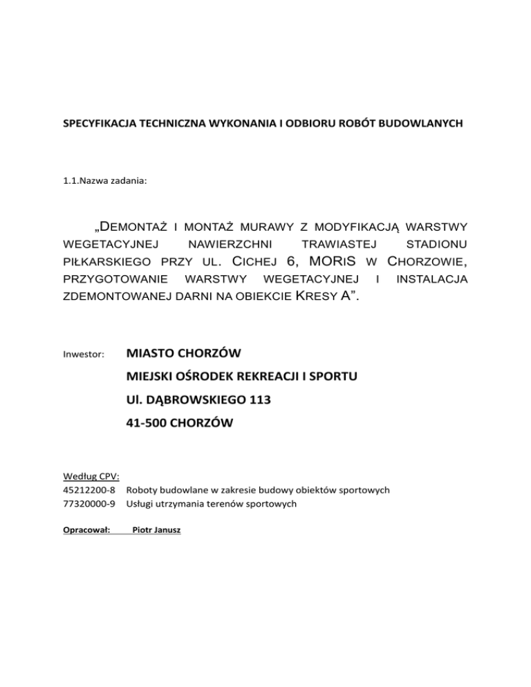 SPECYFIKACJA TECHNICZNA WYKONANIA I ODBIORU ROBÓT BUDOWLANYCH 1.1.Nazwa zadania: „DEMONTAŻ I MONTAŻ MURAWY Z MODYFIKACJĄ WARSTWY WEGETACYJNEJ NAWIERZCHNI PIŁKARSKIEGO PRZY UL . PRZYGOTOWANIE WARSTWY WEGETACYJNEJ I KRESY A”. MIASTO CHORZÓW MIEJSKI OŚRODEK REKREACJI I SPORTU Ul. DĄBROWSKIEGO 113 41-500 CHORZÓW Według CPV: 45212200-8 Roboty budowlane w zakresie budowy obiektów sportowych 77320000-9 Usługi utrzymania terenów sportowych Opracował: Piotr Janusz STADIONU CICHEJ 6, MORIS W CHORZOWIE, ZDEMONTOWANEJ DARNI NA OBIEKCIE Inwestor: TRAWIASTEJ INSTALACJA „DEMONTAŻ I MONTAŻ MURAWY Z MODYFIKACJĄ WARSTWY WEGETACYJNEJ NAWIERZCHNI TRAWIASTEJ STADIONU PIŁKARSKIEGO PRZY UL . CICHEJ 1, MOR IS W CHORZOWIE , PRZYGOTOWANIE WARSTWY WEGETACYJNEJ I INSTALACJA ZDEMONTOWANEJ DARNI NA OBIEKCIE KRESY A”. ...................................................................... 0 1. Podstawa prawna: ....................................................................................................................... 2 2. Informacje dotycząca płyt boiskowych: ...................................................................................... 2 3. Opis stanu płyty boiska i parametry techniczne i chemiczne podłoża, lokalizacja ul. Cicha: ...... 3 4. Opis stanu boiska „KRESY A” parametry techniczne i chemiczne podłoża, lokalizacja ul. Wolności. ............................................................................................................................................. 6 5. Przedmiot zamówienia: ............................................................................................................... 6 6. Zakładane rezultaty i cele: ........................................................................................................... 9 CZĘŚĆ INFORMACYJNA ......................................................................................................................... 10 1. Określenie parametrów dla dostarczonej darni rolowanej. .......................................................... 10 2. Wymagania co do wykonania warstwy wegetacyjnej boiska ................................................... 11 3. Weryfikacja komponentów warstwy wegetacyjnej .................................................................. 11 4. Weryfikacja próbki uzyskanej podbudowy................................................................................ 11 5. Jakość wykonania warstwy nośnej ............................................................................................ 11 6. Weryfikacja wykonania warstwy wegetacyjnej ........................................................................ 12 7. Układanie warstwy ostatecznej – trawa z rolki ............................................................................. 12 8. Wymagania sprzętowe stawiane Wykonawcy .............................................................................. 12 9. Procedury odbiorowe .................................................................................................................... 13 Załącznik 1 ..................................................................................................................................... 14 Załącznik 2 ..................................................................................................................................... 15 Załącznik 3 ..................................................................................................................................... 16 Załącznik 4 ..................................................................................................................................... 17 10. Dodatkowe warunki realizacji zamówienia: ................................................................................ 18 1 1. Podstawa prawna: Rozporządzenie Ministra Infrastruktury z dnia. 2 września 2004 r. w sprawie szczegółowego zakresu i formy dokumentacji projektowej, specyfikacji technicznych wykonania i odbioru robót budowlanych oraz programu funkcjonalno – użytkowego – Dz. U. z 2004 r. Nr 202, poz. 2072 wraz z późniejszymi zmianami. 2. Informacje dotycząca płyt boiskowych: Stadion piłkarski (boisko główne), lokalizacja ul. Cicha w Chorzowie, został oddany do użytku w istniejącej formie w roku ………. Ostania istotna naprawa płyty boiska miała miejsce latem 2014. Wykonany wówczas zabiegi frezowania murawy i następnie jej dosiewu regeneracyjnego nie przyniosły zakładanych efektów. W kilku obszarach boiska trawa wypadła i koniczna była instalacja w wymienionych miejscach darni. Zamontowano wówczas darń z przewagą wiechliny łąkowej. W sezonie 2015 ponownie w miejscu instalacji darni warstwa wegetacyjna wykazała ponownie oznaki hydrofobii. Odpowiednie zabiegi agrotechniczne i zastosowanie preparatów typu „wetting agent” zapobiegły ponownemu wypadnięciu darni. Nawodnienia, składający się z 13 dużych sekcji zraszaczy Rain Bird. Podgrzewania, wykonany w systemie Rehau, z ogrzewaniem glikolowym. Odwodnienia, który stanowi warstwa odsączająca ze specjalnie dobranych mieszanek pisaku wraz z systemem rur drenażowych i studzienkami zbiorczymi zlokalizowanymi poza polem gry. Obiekt jest regularnie użytkowany przez drużynę Ruch Chorzów w rozgrywkach Ekstraklasy. Boisko treningowe „Kresy A” lokalizacja ul Wolności 139 w Chorzowie, obiekt oddany do użytku w istniejącej formie w roku ………. . użytkowany intensywnie głownie jako obiekt treningowy. Ze względu na nierówności nawierzchni inwestor planuje przy okazji modernizacji murawy stadionu głównego modernizację obiektu treningowego polegającą na: Niwelacji i wyrównaniu powierzchni boiska, rozluźnieniu warstwy wegetacyjnej i instalacji darni pozyskanej ze stadionu głównego. System nawodnienia, składający się z 13 dużych sekcji zraszaczy Rain Bird. Odwodnienia, który stanowi warstwa odsączająca ze specjalnie dobranych mieszan