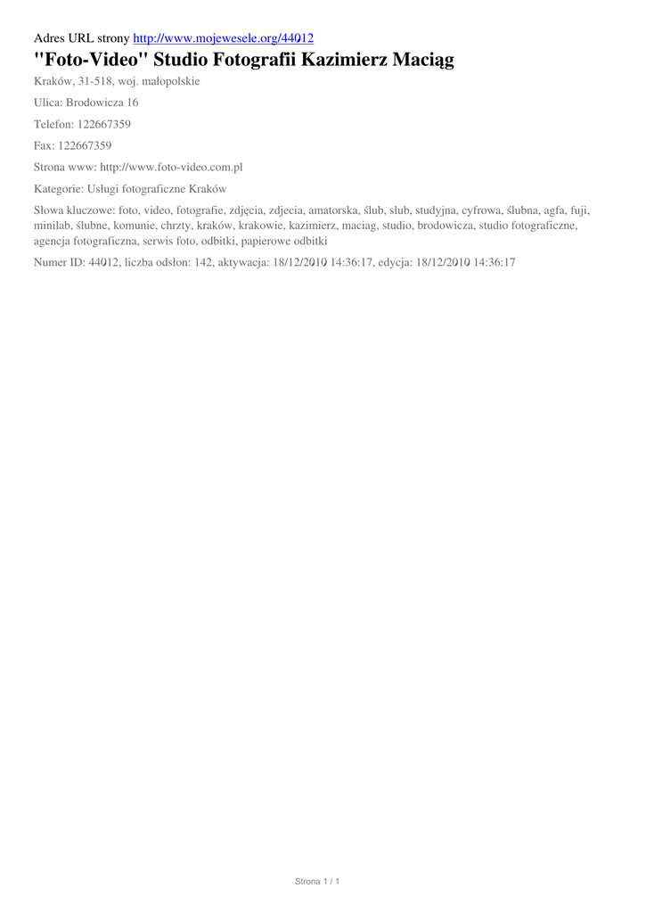 Adres URL strony http://www.mojewesele.org/44012 "Foto-Video" Studio Fotografii Kazimierz Maciąg Kraków, 31-518, woj. małopolskie Ulica: Brodowicza 16 Telefon: 122667359 Fax: 122667359 Strona www: http://www.foto-video.com.pl Kategorie: Usługi fotograficzne Kraków Słowa kluczowe: foto, video, fotografie, zdjęcia, zdjecia, amatorska, ślub, slub, studyjna, cyfrowa, ślubna, agfa, fuji, minilab, ślubne, komunie, chrzty, kraków, krakowie, kazimierz, maciag, studio, brodowicza, studio fotograficzne, agencja fotograficzna, serwis foto, odbitki, papierowe odbitki Numer ID: 44012, liczba odsłon: 142, aktywacja: 18/12/2010 14:36:17, edycja: 18/12/2010 14:36:17 Strona 1 / 1