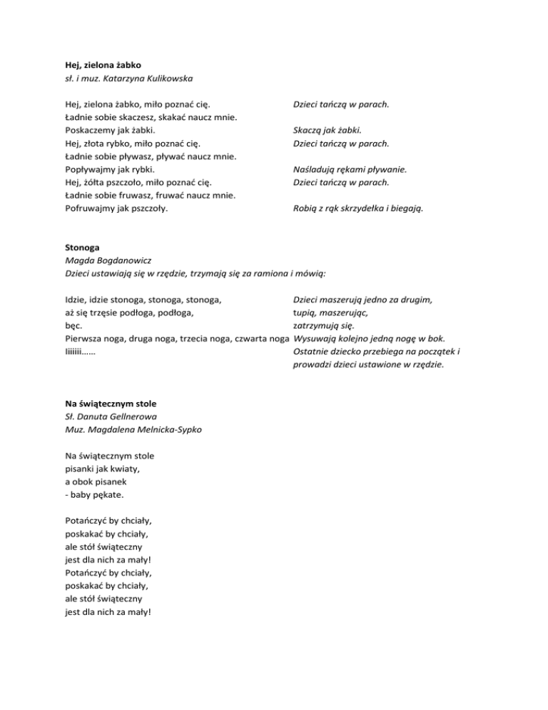 Hej, zielona żabko sł. i muz. Katarzyna Kulikowska Hej, zielona żabko, miło poznać cię. Ładnie sobie skaczesz, skakać naucz mnie. Poskaczemy jak żabki. Hej, złota rybko, miło poznać cię. Ładnie sobie pływasz, pływać naucz mnie. Popływajmy jak rybki. Hej, żółta pszczoło, miło poznać cię. Ładnie sobie fruwasz, fruwać naucz mnie. Pofruwajmy jak pszczoły. Dzieci tańczą w parach. Skaczą jak żabki. Dzieci tańczą w parach. Naśladują rękami pływanie. Dzieci tańczą w parach. Robią z rąk skrzydełka i biegają. Stonoga Magda Bogdanowicz Dzieci ustawiają się w rzędzie, trzymają się za ramiona i mówią: Idzie, idzie stonoga, stonoga, stonoga, aż się trzęsie podłoga, podłoga, bęc. Pierwsza noga, druga noga, trzecia noga, czwarta noga Iiiiiii…… Na świątecznym stole Sł. Danuta Gellnerowa Muz. Magdalena Melnicka-Sypko Na świątecznym stole pisanki jak kwiaty, a obok pisanek - baby pękate. Potańczyć by chciały, poskakać by chciały, ale stół świąteczny jest dla nich za mały! Potańczyć by chciały, poskakać by chciały, ale stół świąteczny jest dla nich za mały! Dzieci maszerują jedno za drugim, tupią, maszerując, zatrzymują się. Wysuwają kolejno jedną nogę w bok. Ostatnie dziecko przebiega na początek i prowadzi dzieci ustawione w rzędzie.