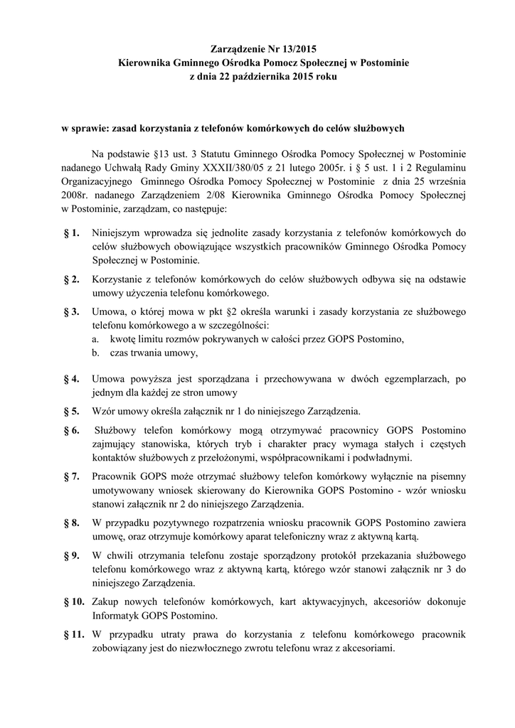 Zarządzenie Nr 13/2015 Kierownika Gminnego Ośrodka Pomocz Społecznej w Postominie z dnia 22 października 2015 roku w sprawie: zasad korzystania z telefonów komórkowych do celów słuŜbowych Na podstawie §13 ust. 3 Statutu Gminnego Ośrodka Pomocy Społecznej w Postominie nadanego Uchwałą Rady Gminy XXXII/380/05 z 21 lutego 2005r. i § 5 ust. 1 i 2 Regulaminu Organizacyjnego Gminnego Ośrodka Pomocy Społecznej w Postominie z dnia 25 września 2008r. nadanego Zarządzeniem 2/08 Kierownika Gminnego Ośrodka Pomocy Społecznej w Postominie, zarządzam, co następuje: § 1. Niniejszym wprowadza się jednolite zasady korzystania z telefonów komórkowych do celów słuŜbowych obowiązujące wszystkich pracowników Gminnego Ośrodka Pomocy Społecznej w Postominie. § 2. Korzystanie z telefonów komórkowych do celów słuŜbowych odbywa się na odstawie umowy uŜyczenia telefonu komórkowego. § 3. Umowa, o której mowa w pkt §2 określa warunki i zasady korzystania ze słuŜbowego telefonu komórkowego a w szczególności: a. kwotę limitu rozmów pokrywanych w całości przez GOPS Postomino, b. czas trwania umowy, § 4. Umowa powyŜsza jest sporządzana i przechowywana w dwóch egzemplarzach, po jednym dla kaŜdej ze stron umowy § 5. Wzór umowy określa załącznik nr 1 do niniejszego Zarządzenia. § 6. SłuŜbowy telefon komórkowy mogą otrzymywać pracownicy GOPS Postomino zajmujący stanowiska, których tryb i charakter pracy wymaga stałych i częstych kontaktów słuŜbowych z przełoŜonymi, współpracownikami i podwładnymi. § 7. Pracownik GOPS moŜe otrzymać słuŜbowy telefon komórkowy wyłącznie na pisemny umotywowany wniosek skierowany do Kierownika GOPS Postomino - wzór wniosku stanowi załącznik nr 2 do niniejszego Zarządzenia. § 8. W przypadku pozytywnego rozpatrzenia wniosku pracownik GOPS Postomino zawiera umowę, oraz otrzymuje komórkowy aparat telefoniczny wraz z aktywną kartą. § 9. W chwili otrzymania telefonu zostaje sporządzony protokół przekazania słuŜbowego telefonu komórkowego wraz z aktywną kartą, którego wzór stanowi załącznik nr 3 do niniejszego Zarządzenia. § 10. Zakup nowych telefonów komórkowych, kart aktywacyjnych, akcesoriów dokonuje Informatyk GOPS Postomino. § 11. W przypadku utraty prawa do korzystania z telefonu komórkowego pracownik zobowiązany jest do niezwłocznego zwrotu telefonu wraz z akcesoriami. § 12. Utrata prawa do korzystania z telefonu komórkowego następuje w przypadku : a. rozwiązania umowy o pracę z pracownikiem, b. choroby pracownika powyŜej 2 tygodni. § 13. Niniejsze Zarządzenie wchodzi w Ŝycie z dniem podpisania. Kierownik Gminnego Ośrodka Pomocy Społecznej w Postominie Krystyna Ślebioda Załącznik nr 1 Umowa nr……w sprawie zasad korzystania ze słuŜbowego telefonu komórkowego Zawarta …….. r. w Postominie pomiędzy: Gminnym Ośrodkiem Pomocy Społecznej w Postominie z siedzibą Postomino 30, 76-113 Postomino, NIP 839-19-39- 428, REGON 005311443, reprezentowanym przez Krystynę Ślebioda- Kierownika Gminnego Ośrodka Pomocy Społecznej w Postominie, zwanym dalej Pracodawcą, a ………… zamieszkałym/łą w ………….., PESEL ………., legitymującym/a się dowodem osobistym ………, zatrudnioną u Pracodawcy na podstawie umowy ……. na stanowisku ……., zwaną dalej Pracownikiem. §1 Pracodawca udostępnia Pracownikowi słuŜbowy telefon komórkowy ……………. IMEI ……………….. wraz z kartą SIM/USIM nr seryjny ………………. na numer telefoniczny ……………. zarejestrowany w sieci ………………. w ramach abonamentu ……………………, w celu prowadzenia rozmów słuŜbowych. Telefon przekazany do uŜytku Pracownika stanowi własność Pracodawcy. W przypadku zmiany stanowiska pracy lub rozwiązania stosunku pracy Pracownik jest zobowiązany zwrócić telefon słuŜbowy Pracodawcy w ostatnim dniu zatrudnienia lub w ostatnim dniu świadczenia pracy na danym stanowisku. §2 Pracodawca pokrywa wyłącznie koszty usług nieprzekraczających limitów dostępnych w ramach opłaty abonamentowej na podstawie przekazanej przez operatora sieci fakturze w sekcji „Abonamenty i usługi”. §3 Pracownik zobowiązuje się do zwrotu Pracodawcy kosztów usług w tym usług mobilnych przekraczających limity dostępne w ramach abonamentu na podstawie przekazanej przez operatora sieci fakturze w sekcji „Opłaty poza abonamentem.” W tym celu Pracodawca przedłoŜy Pracownikowi fakturę z wyszczególnioną kwotą do zapłaty. W/w usługi wykazywane będą w oświadczeniu pracownika, składanego w terminach ustalonych przez pracodawcę. W przypadku uzyskania pisemnej zgody Pracownika na jej potrącenie, naleŜność zostanie pobrana z wynagrodzenia. §4 Pracownik ponosi odpowiedzialność materialną za przekazany mu do uŜytkowania telefon słuŜbowy na zasadach odpowiedzialności za mienie powierzone. Przekazanie telefonu zostanie potwierdzone w protokole zdawczo-odbiorczym. Utratę, uszkodzenie lub zniszczenie telefonu Pracownik jest zobowiązany niezwłocznie zgłosić Pracodawcy, a w przypadku utraty telefonu dodatkowo operatorowi sieci. §5 Pracownik jest zobowiązany do utrzymywania telefonu słuŜbowego w naleŜytym stanie technicznym i do korzystania z niego zgodnie z niniejszą umową i instrukcją obsługi producenta. Pracodawca nie ponosi kosztów eksploatacji i naprawy telefonu, które wynikają z nieprawidłowego korzystania z niego przez Pracownika. §6 Niniejsza umowa moŜe zostać rozwiązana przed kaŜdą ze stron za miesięcznym okresem wypowiedzenia. Z upływem ostatniego dnia wypowiedzenia Pracownik jest zobowiązany zwrócić telefon Pracodawcy, co zostanie potwierdzone w protokole zdawczo-odbiorczym. ............................. Pracodawca ............................. Pracownik Załącznik nr 2 WNIOSEK o przyznanie słuŜbowego telefonu słuŜbowego Imię i nazwisko pracownika: ……………………………