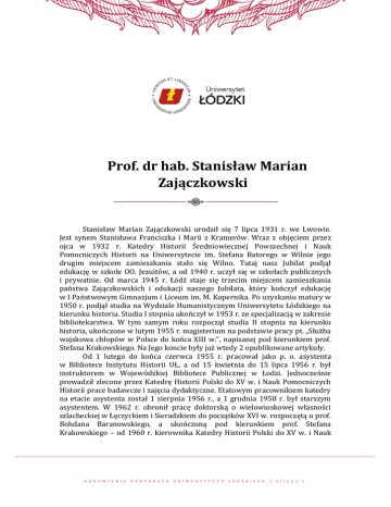 Prof. dr hab. Stanisław Marian Zajączkowski Stanisław Marian Zajączkowski urodził się 7 lipca 1931 r. we Lwowie. Jest synem Stanisława Franciszka i Marii z Kramerów. Wraz z objęciem przez ojca w 1932 r. Katedry Historii Średniowiecznej Powszechnej i Nauk Pomocniczych Historii na Uniwersytecie im. Stefana Batorego w Wilnie jego drugim miejscem zamieszkania stało się Wilno. Tutaj nasz Jubilat podjął edukację w szkole OO. Jezuitów, a od 1940 r. uczył się w szkołach publicznych i prywatnie. Od marca 1945 r. Łódź staje się trzecim miejscem zamieszkania państwa Zajączkowskich i edukacji naszego Jubilata, który kończył edukację w I Państwowym Gimnazjum i Liceum im. M. Kopernika. Po uzyskaniu matury w 1950 r. podjął studia na Wydziale Humanistycznym Uniwersytetu Łódzkiego na kierunku historia. Studia I stopnia ukończył w 1953 r. ze specjalizacją w zakresie bibliotekarstwa. W tym samym roku rozpoczął studia II stopnia na kierunku historia, ukończone w lutym 1955 r. magisterium na podstawie pracy pt. „Służba wojskowa chłopów w Polsce do końca XIII w.”, napisanej pod kierunkiem prof. Stefana Krakowskiego. Na Jego koncie były już wtedy 2 opublikowane artykuły. Od 1 lutego do końca czerwca 1955 r. pracował jako p. o. asystenta w Bibliotece Instytutu Historii UŁ, a od 15 kwietnia do 15 lipca 1956 r. był instruktorem w Wojewódzkiej Bibliotece Publicznej w Łodzi. Jednocześnie prowadził zlecone przez Katedrę Historii Polski do XV w. i Nauk Pomocniczych Historii prace badawcze i zajęcia dydaktyczne. Etatowym pracownikiem katedry na etacie asystenta został 1 sierpnia 1956 r., a 1 grudnia 1958 r. był starszym asystentem. W 1962 r. obronił pracę doktorską o wielowioskowej własności szlacheckiej w Łęczyckiem i Sieradzkiem do początków XVI w. rozpoczętą u prof. Bohdana Baranowskiego, a ukończoną pod kierunkiem prof. Stefana Krakowskiego – od 1960 r. kierownika Katedry Historii Polski do XV w. i Nauk O D N O W I E N I E D O K T O R A T U U N I W E R S Y T E T U Ł Ó D Z K I E G O / S t r o n a 1 O D N O W I E N I E D O K T O R A T U U N I W E R S Y T E T U Ł Ó D Z K I E G O Pomocniczych Historii. Dnia 1 października 1962 r. awansował na adiunkta. Jego bibliografia liczyła wówczas 13 pozycji drukowanych, w tym jedną książkę, tj. znacznie rozszerzoną wersję pracy magisterskiej. Jednocześnie wraz z ojcem zbierali materiały do słownika geograficzno-historycznego dawnych ziem łęczyckiej i sieradzkiej do 1400 r., którego dwie części ukazały się nakładem Łódzkiego Towarzystwa Naukowego w latach 1966-1970. Stanowi on dotąd podstawowe kompendium wiedzy o najstarszych dziejach miejscowości naszego regionu, bez którego trudno sobie wyobrazić jakiekolwiek badania osadnicze i dlatego ma zagwarantowane miejsce w każdej bibliografii dotyczącej przeszłości regionu łęczycko-sieradzkiego. Pokłosiem zainteresowań Stanisława M. Zajączkowskiego problematyką łęczycko-sieradzką w średniowieczu, a szczególnie badań osadniczych, jest jego rozprawa pt. „Ziemie łęczycka i sieradzka od końca XIV do początków XVI w.”, której streszczenie było podstawą kolokwium habilitacyjnego 13 listopada 1969 r. Po jego zatwierdzeniu w marcu następnego roku przez Ministerstwo Oświaty i Szkolnictwa Wyższego, w dniu 1 sierpnia 1970 r. został docentem w Zakładzie Historii Polski Średniowiecznej i Nauk Pomocniczych Historii. Wraz z przejściem profesora Stefana Krakowskiego na emeryturę w 1982 r. docent Stanisław M. Zajączkowski objął kierownictwo Zakładu, a następnie Katedry Historii Polski Średniowiecznej. Dnia 1 listopada 1989 r. otrzymał tytuł profesora nadzwyczajnego, a od 1 grudnia 1990 r. jest profesorem zwyczajnym. W związku z przepisami emerytalnymi prof. dr hab. Stanisław M. Zajączkowski od 1 listopada 2000 r. został zatrudniony w UŁ na stanowisku profesora nadzwyczajnego na stałe. Dnia 1 października 2001 r. przeszedł na emeryturę, ale jeszcze w roku akademickim 2001/2002 – pracując na 1/4 etatu – prowadził seminarium magisterskie i miał zajęcia na Studium Podyplomowym w Instytucie Historii UŁ. Od czasu zatrudnienia na stanowisku asystenta w 1956 r. przez kilkadziesiąt lat UŁ był jedynym miejscem pracy Profesora. Należy wszakże odnotować, że od 1 października 1998 r. do 15 sierpnia 2001 r. pracował w wymiarze 1/2 etatu w Instytucie Historii na Wydziale FilologicznoHistorycznym Filii w Piotrkowie Trybunalskim podówczas Wyższej Szkoły Pedagogicznej im. Jana Kochanowskiego w Kielcach, a obecnie Uniwersytetu Humanistyczno-Przyrodniczego Jana Kochanowskiego w Kielcach. Profesor Stanisław M. Zajączkowski jest autorem 125 prac, w tym 8 książek, następne artykuły są w druku, a niewątpliwie będzie ich jeszcze znacznie więcej. Zdecydowana większość z nich dotyczy ziem Polski Centralnej, badania nad którymi na szerszą skalę rozpoczęły się w zasadzie dopiero po II wojnie światowej i udział w nich Profesora jest znaczący, a w wielu kwestiach pionierski. Można w nich wyróżnić 2 nurty. O D N O W I E N I E D O K T O R A T U U N I W E R S Y T E T U Ł Ó D Z K I E G O / S t r o n a 2 O D N O W I E N I E D O K T O R A T U U N I W E R S Y T E T U Ł Ó D Z K I E G O Pierwszy nurt to badania nad własnością szlachecką, której Stanisław M. Zajączkowski poświęcił swoją rozprawę doktorską. Stała się ona potem podstawą do rozwinięcia poruszanych w niej zagadnień w 7 obszernych artykułach. W tej dziedzinie osiągnął znaczące sukcesy, gdyż żaden region w Polsce nie ma tak solidnie zbadanej i dokładnie opracowanej struktury własności ziemskiej i kompleksów majątkowych jak Łęczyckie i Sieradzkie. Drugi nurt wiąże się z problematyką osadniczą w Łęczyckiem i Sieradzkiem, której dotyczyła rozprawa habilitacyjna, pt. „Ziemie łęczycka i sieradzka od końca XIV do początków XVI w.” Ze względu na swoją objętość ukazała się
