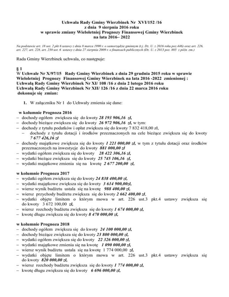 Uchwała Rady Gminy Wierzbinek Nr XVI/152 /16 z dnia 9 sierpnia 2016 roku w sprawie zmiany Wieloletniej Prognozy Finansowej Gminy Wierzbinek na lata 2016– 2022 Na podstawie art. 18 ust. 2 pkt 6 ustawy z dnia 8 marca 1990 r. o samorządzie gminnym (t.j. Dz. U. z 2016 roku poz.446) oraz art. 226, art. 227, art. 228, art. 230 ust. 6 ustawy z dnia 27 sierpnia 2009 r. o finansach publicznych (Dz. U. z 2013 poz. 885 z późn .zm.) Rada Gminy Wierzbinek uchwala, co następuje: §1 W Uchwale Nr X/97/15 Rady Gminy Wierzbinek z dnia 29 grudnia 2015 roku w sprawie Wieloletniej Prognozy Finansowej Gminy Wierzbinek na lata 2016 -2022 zmienionej : Uchwałą Rady Gminy Wierzbinek Nr XI/ 108 /16 z dnia 2 lutego 2016 roku Uchwałą Rady Gminy Wierzbinek Nr XII/ 126 /16 z dnia 22 marca 2016 roku dokonuje się zmian: 1. W załączniku Nr 1 do Uchwały zmienia się dane: w kolumnie Prognoza 2016 dochody ogółem zwiększa się do kwoty 28 193 906,16 zł, dochody bieżące zwiększa się do kwoty 26 972 906,16 zł, w tym: dochody z tytułu podatków i opłat zwiększa się do kwoty 7 832 418,00 zł, dochody z tytułu dotacji i środków przeznaczonych na cele bieżące zwiększa się do kwoty 7 677 426,16 zł dochody majątkowe zwiększa się do kwoty 1 221 000,00 zł, w tym z tytułu dotacji oraz środków przeznaczonych na inwestycje do kwoty 881 000,00 zł wydatki ogółem zwiększa się do kwoty 28 422 306,16 zł, wydatki bieżące zwiększa się do kwoty 25 745 106,16 zł, wydatki majątkowe zmienia się na kwotę 2 677 200,00 zł, w kolumnie Prognoza 2017 wydatki ogółem zwiększa się do kwoty 24 838 400,00 zł, wydatki majątkowe zwiększa się do kwoty 3 614 900,00zł, wiersz wynik budżetu ustala się na kwotę 988 400,00 zł, wiersz przychody budżetu zwiększa się do kwoty 2 662 400,00 zł, wydatki objęte limitem o którym mowa w art. 226 ust.3 pkt.4 ustawy zwiększa się do kwoty 3 672 100,00 zł, wiersz rozchody budżetu zwiększa się do kwoty 1 674 000,00 zł, kwotę długu zwiększa się do kwoty 8 470 000,00 zł, w kolumnie Prognoza 2018 dochody ogółem zwiększa się do kwoty 24 100 000,00 zł, dochody bieżące zwiększa się do kwoty 23 800 000,00 zł, wydatki ogółem zwiększa się do kwoty 22 326 000,00 zł, wydatki majątkowe zmienia się na kwotę 1 090 000,00 zł, wiersz wynik budżetu ustala się na kwotę 1 774 000,00 zł, wydatki objęte limitem o którym mowa w art. 226 ust.3 pkt.4 ustawy zwiększa się do kwoty 820 000,00 zł, wiersz rozchody budżetu zwiększa się do kwoty 1 774 000,00 zł, kwotę długu zwiększa się do kwoty 6 696 000,00 zł, w kolumnie Prognoza 2019 wydatki bieżące zmienia się na kwotę 21 198 500,00 zł, wydatki majątkowe zmienia się na kwotę 927 500,00 zł, wiersz wynik budżetu ustala się na kwotę 1 774 000,00 zł, wiersz rozchody budżetu zwiększa się do kwoty 1 774 000,00 zł, kwotę długu zwiększa się do kwoty 4 922 000,00 zł, wydatki objęte limitem o którym mowa w art. 226 ust.3 pkt.4 ustawy zmniejsza się do kwoty 600 000,00 zł, w kolumnie Prognoza 2020 - dochody ogółem zmienia się na kwotę 23 900 000,00 zł, wydatki ogółem zmniejsza się do kwoty 21 926 000,00 zł, wydatki majątkowe zmniejsza się do kwoty 787 500,00 zł, wiersz wynik budżetu ustala się na kwotę 1 974 000,00 zł, wiersz rozchody budżetu ustala się na kwotę 1 974 000,00 zł, kwotę długu zwiększa się do kwoty 2 948 000,00 zł, w kolumnie Prognoza 2021 - dochody ogółem zmienia się na kwotę 23 900 000,00 zł, wydatki ogółem zmniejsza się do kwoty 22 426 000,00 zł, wydatki majątkowe zmienia się do kwoty 1 237 500,00 zł, wiersz wynik budżetu ustala się na kwotę 1 474 000,00 zł, wiersz rozchody budżetu zwiększa się do kwoty 1 474 000,00 zł, kwotę długu zwiększa się do kwoty 1 474 000,00 zł, w kolumnie Prognoza 2022 - dochody ogółem zmienia się na kwotę 23 900 000,00 zł, wydatki ogółem zmniejsza się do kwoty 22 426 000,00 zł, wydatki majątkowe zmienia się na kwotę 1 287 500,00 zł, wiersz wynik budżetu ustala się na kwotę 1 474 000,00 zł, wiersz rozchody budżetu ustala się na kwotę 1 474 000,00 zł, W związku z w/w zmianami załącznik Nr 1 otrzymuje brzmienie załącznika Nr 1 po zmianach do niniejszej uchwały. 2. W załączniku Nr 2 Wieloletnie przedsięwzięcia finansowe do WPF dokonuje się zmian : W punkcie 1 a wykazu – wydatki bieżące – dodaje się przedsięwzięcie pn. Prowadzenie Przedszkoli w miejscowości Sadlno i Morzyczyn – rozszerzenie opieki przedszkolnej w latach 2015-2017 , o łącznych nakładach 403 000,00 zł, z limitem w roku 2016 w kwocie 170 500,00 zł oraz limitem na rok 2017 w kwocie 170 500,00 zł oraz limitem zobowiązań w kwocie 170 500,00 zł. W punkcie 1 b wykazu wydatki majątkowe dodaje się : - w przedsięwzięciu pn Budowa Przedszkola Gminnego w miejscowości Wierzbinek zwiększa się limit roku 2016 do kwoty 25 000,00 zł, dodaje się limit roku 2017 na kwotę 800 000,00 zł ,zmniejsza się limit roku 2018 i 2019 do 0,00 zł, zwiększa się łączne nakłady finansowe do kwoty 870 000,00 zł oraz limit zobowiązań do kwoty 800 000,00 zł. - w przedsięwzięciu pn Budowa kanalizacji w miejscowości Sadlno zwiększa się limit roku 2016 do kwoty 160 000,00 zł, zwiększa się łączne nakłady finansowe do kwoty 760 000,00 zł oraz limit zobowiązań zmienia się na kwotę 550 000,00 zł. - dodaje się przedsięwzięcie pn Zmiana nawierzchni drogi gminnej w miejscowości Racięcin w kierunku Broniszewa –poprawa standardu życia mieszkańców gminy Wierzbinek na lata 20162017,określa się limit roku 2016 na kwotę 3 500,00 zł, dodaje się limit roku 2017 na kwotę 225 000,00 zł określa się łączne nakłady finansowe na kwotę 228 500,00 zł oraz limit zobowiązań na kwotę 225 000,00 zł. - dodaje się przedsięwzięcie pn Zmiana nawierzchni drogi gminnej relacji Chlebowo-Boguszyce – poprawa standardu życia mieszkańców gminy Wierzbinek na lata 2016-