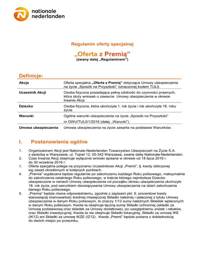 Regulamin oferty specjalnej „Oferta z Premią” (zwany dalej „Regulaminem”) Definicje: Akcja Oferta specjalna „Oferta z Premią” dotycząca Umowy ubezpieczenia na życie „Sposób na Przyszłość” oznaczonej kodem TUL0. Uczestnik Akcji Osoba fizyczna posiadająca pełną zdolność do czynności prawnych, która złoży wniosek o zawarcie Umowy ubezpieczenia w okresie trwania Akcji. Dziecko Osoba fizyczna, która ukończyła 1. rok życia i nie ukończyła 18. roku życia. Warunki Ogólne warunki ubezpieczenia na życie „Sposób na Przyszłość” nr OWU/TUL0/1/2016 (dalej: „Warunki”). Umowa ubezpieczenia I. 1. 2. 3. 4. 5. Umowa ubezpieczenia na życie zawarta na podstawie Warunków. Postanowienia ogólne Organizatorem Akcji jest Nationale-Nederlanden Towarzystwo Ubezpieczeń na Życie S.A. z siedzibą w Warszawie, ul. Topiel 12, 00-342 Warszawa, zwane dalej Nationale-Nederlanden. Czas trwania Akcji obejmuje wyłącznie wnioski spisane w okresie od 18 lipca 2016 r. do 30 września 2016 r. Oferta specjalna polega na przyznaniu Uczestnikowi Akcji „Premii”, tj. kwoty obliczonej wg zasad określonych w kolejnych punktach. „Premia” wypłacana będzie regularnie po zakończeniu każdego Roku polisowego, maksymalnie do zakończenia ostatniego Roku polisowego, w trakcie którego najmłodsze Dziecko ubezpieczone w ramach Umowy ubezpieczenia od początku okresu ubezpieczenia ukończyło 18. rok życia, pod warunkiem obowiązywania Umowy ubezpieczenia na dzień zakończenia danego Roku polisowego. „Premia” będzie równa odpowiedniemu, zgodnie z zapisami pkt. 6, procentowi kwoty stanowiącej równowartość średniej miesięcznej Składki należnej i opłaconej z tytułu Umowy ubezpieczenia w danym Roku polisowym, to znaczy 1/12 sumy należnych Składek wpłaconych w danym Roku polisowym. Kwota ta obejmuje łączną sumę Składki ochronnej (składki za Umowę podstawową oraz składek za Umowy dodatkowe), po uwzględnieniu zniżek i rabatów, oraz Składki inwestycyjnej. Kwota ta nie obejmuje Składki lokacyjnej, Składki za umowę IKE (IK12) ani Składki za umowę IKZE (IZ12) . Kwota „Premii” będzie podana z dokładnością do dwóch miejsc po przecinku. 6. 7. 8. 9. Procentowa wartość „Premii” zależy od wysokości średniej miesięcznej Składki ochronnej zadeklarowanej i opłaconej z tytułu Umowy ubezpieczenia w danym Roku polisowym, obliczonej zgodnie z zasadami określonymi w pkt. 4 i 5, i wynosi odpowiednio: Procentowa wartość „Premii” Średnia miesięczna Składka ochronna 33% średniej miesięcznej Składki 100% średniej miesięcznej Składki od 80 zł – do 149,99 zł od 150 zł Do wyliczenia kwoty „Premii” nie uwzględnia się okresów czasowego zawieszenia opłacania Składek (okresy bezskładowe), ani okresów, w których Nationale-Nederlanden przejmuje obowiązek opłacania Składek w ramach wypłaty Świadczenia z tytułu Umowy dodatkowe – przejęcie opłacania składek, oznaczonej kodem: WP12. W Roku polisowym, w którym ma miejsce zawieszenie opłacania Składek bądź przejęcie opłacania Składek na podstawie Umowy dodatkowej WP12, „Premia” zostanie wyliczona jako 1/12 sumy należnych Składek wpłaconych przez Właściciela polisy poza okresami zawieszenia opłacania Składek bądź przejęcia opłacania Składek na podstawie Umowy dodatkowej WP12 w danym Roku polisowym. Maksymalna wysokość „Premii” w danym Roku polisowym z tytułu jednej Umowy ubezpieczenia nie może przekroczyć kwoty 500 zł. W terminie 30 dni kalendarzowych od pierwszej rocznicy zawarcia Umowy ubezpieczenia Właściciel polisy może złożyć pisemną dyspozycję wypłaty „Premii” na wskazany rachunek bankowy lub przeznaczenia jej na poczet przyszłych Składek. Po tym terminie „Premia” zostanie uznana za Składkę lokacyjną zgodnie z Warunkami. Kolejne „Premie” będą wypłacane zgodnie z pierwszą dyspozycją Właściciela polisy, chyba że zostanie ona zmieniona w terminie 30 dni kalendarzowych od danej rocznicy. II. Warunki Akcji 1. 2. 3. Akcja jest przeznaczona wyłącznie dla osób, które w czasie trwania Akcji spełniają łącznie następujące warunki Uczestnika Akcji: a) wystąpią z wnioskiem o zawarcie z Nationale-Nederlanden Umowy ubezpieczenia na życie „Sposób na Przyszłość” oznaczonej w dokumencie ubezpieczenia i innych dokumentach wystawionych przez Nationale-Nederlanden kodem: TUL0, przy czym w ramach tej Umowy ubezpieczenia ochroną ubezpieczeniową objęte będą przynajmniej dwie osoby oraz co najmniej jedna z nich będzie Dzieckiem , a jedna – osobą pełnoletnią, a dodatkowo, Dziecko zostanie objęte ochroną ubezpieczeniową w ramach przynajmniej jednej Umowy dodatkowej, b) wpłacą należną składkę za Umowę ubezpieczenia - składka za Umowę musi wpłynąć na rachunek Nationale-Nederlanden do dnia 30 listopada 2016 r., z zastrzeżeniem zapisów pkt. 2, c) opłacą wszystkie składki należne z tytułu Umowy ubezpieczenia do dnia pierwszej i każdej kolejnej rocznicy zawarcia Umowy ubezpieczenia, w której ma zostać wypłacona „Premia”. Składka ochronna (po uwzględnieniu rabatów) w okresie naliczania „Premii” nie może zostać obniżona poniżej 80 zł miesięcznie, a w przypadku innych częstotliwości opłacania Składek, nie zostanie obniżona poniżej 240 zł – dla płatności kwartalnych, 480 zł – dla płatności półrocznych oraz 960 zł – dla płatności rocznych. „Premia” zostanie przyznana wyłącznie w przypadku braku zaległości w opłacaniu Składek na dzień pierwszej i każdej kolejnej rocznicy rozpoczęcia ochrony ubezpieczeniowej. III. Postanowienia końcowe 1. 2. 3. 4. 5. Treść Regulaminu dostępna jest przez cały okres trwania Akcji na stronie www.nn.pl.Udział w Akcji oznacza akceptację jej zasad, zawartych w Regulaminie. Wysokość „Premii” jest określona w kwotach netto dla celów podatku dochodowego od osób fizycznych. W przypadk