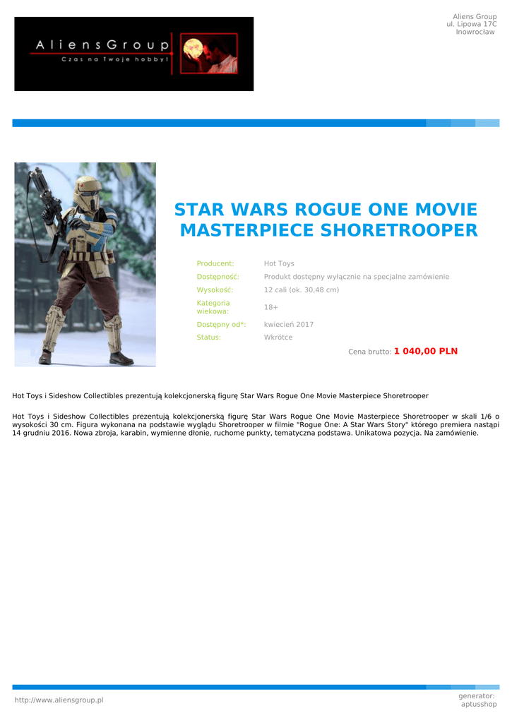 Aliens Group ul. Lipowa 17C Inowrocław STAR WARS ROGUE ONE MOVIE MASTERPIECE SHORETROOPER Producent: Hot Toys Dostępność: Produkt dostępny wyłącznie na specjalne zamówienie Wysokość: 12 cali (ok. 30,48 cm) Kategoria wiekowa: 18+ Dostępny od*: kwiecień 2017 Status: Wkrótce Cena brutto: 1 040,00 PLN Hot Toys i Sideshow Collectibles prezentują kolekcjonerską figurę Star Wars Rogue One Movie Masterpiece Shoretrooper Hot Toys i Sideshow Collectibles prezentują kolekcjonerską figurę Star Wars Rogue One Movie Masterpiece Shoretrooper w skali 1/6 o wysokości 30 cm. Figura wykonana na podstawie wyglądu Shoretrooper w filmie "Rogue One: A Star Wars Story" którego premiera nastąpi 14 grudniu 2016. Nowa zbroja, karabin, wymienne dłonie, ruchome punkty, tematyczna podstawa. Unikatowa pozycja. Na zamówienie. http://www.aliensgroup.pl generator: aptusshop
