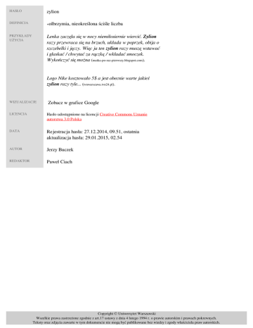 HASŁO zylion DEFINICJA «olbrzymia, PRZYKŁADY UŻYCIA Lenka zaczęła się w nocy niemiłosiernie wiercić. Zylion razy przewraca się na brzuch, układa w poprzek, obija o szczebelki i jęczy. Więc ja ten zylion razy muszę wstawać i głaskać / chwytać za rączkę / wkładać smoczek. Wykończyć się można (matka-po-raz-pierwszy.blogspot.com). nieokreślona ściśle liczba» Logo Nike kosztowało 5$ a jest obecnie warte jakieś zylion razy tyle... (tvnwarszawa.tvn24.pl). WIZUALIZACJE Zobacz w grafice Google LICENCJA Hasło udostępnione na licencji Creative Commons Uznanie autorstwa 3.0 Polska DATA Rejestracja hasła: 27.12.2014, 09.51, ostatnia aktualizacja hasła: 29.01.2015, 02.54 AUTOR Jerzy Buczek REDAKTOR Paweł Ciach Copyright © Uniwersytet Warszawski Wszelkie prawa zastrzeżone zgodnie z art.17 ustawy z dnia 4 lutego 1994 r. o prawie autorskim i prawach pokrewnych. Teksty oraz zdjęcia zawarte w tym dokumencie nie mogą być publikowane bez wiedzy i zgody właściciela praw autorskich. Powered by TCPDF (www.tcpdf.org)