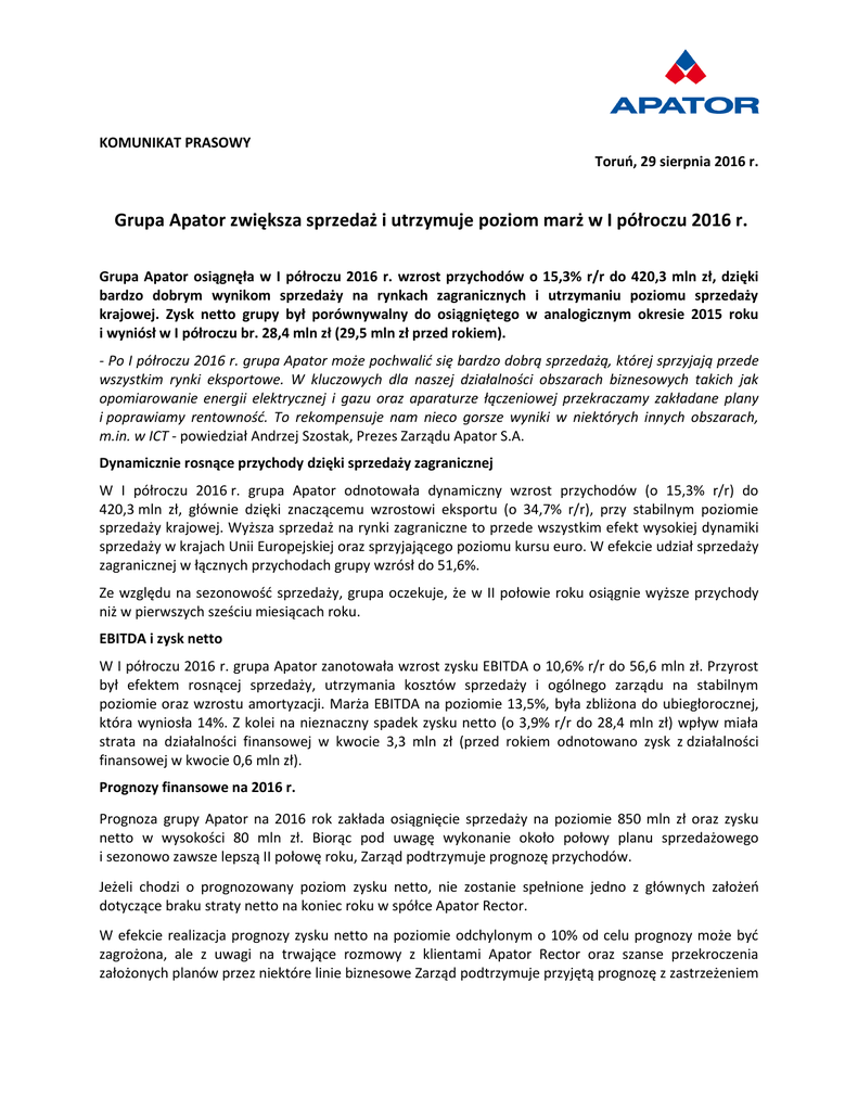KOMUNIKAT PRASOWY Toruń, 29 sierpnia 2016 r. Grupa Apator zwiększa sprzedaż i utrzymuje poziom marż w I półroczu 2016 r. Grupa Apator osiągnęła w I półroczu 2016 r. wzrost przychodów o 15,3% r/r do 420,3 mln zł, dzięki bardzo dobrym wynikom sprzedaży na rynkach zagranicznych i utrzymaniu poziomu sprzedaży krajowej. Zysk netto grupy był porównywalny do osiągniętego w analogicznym okresie 2015 roku i wyniósł w I półroczu br. 28,4 mln zł (29,5 mln zł przed rokiem). - Po I półroczu 2016 r. grupa Apator może pochwalić się bardzo dobrą sprzedażą, której sprzyjają przede wszystkim rynki eksportowe. W kluczowych dla naszej działalności obszarach biznesowych takich jak opomiarowanie energii elektrycznej i gazu oraz aparaturze łączeniowej przekraczamy zakładane plany i poprawiamy rentowność. To rekompensuje nam nieco gorsze wyniki w niektórych innych obszarach, m.in. w ICT - powiedział Andrzej Szostak, Prezes Zarządu Apator S.A. Dynamicznie rosnące przychody dzięki sprzedaży zagranicznej W I półroczu 2016 r. grupa Apator odnotowała dynamiczny wzrost przychodów (o 15,3% r/r) do 420,3 mln zł, głównie dzięki znaczącemu wzrostowi eksportu (o 34,7% r/r), przy stabilnym poziomie sprzedaży krajowej. Wyższa sprzedaż na rynki zagraniczne to przede wszystkim efekt wysokiej dynamiki sprzedaży w krajach Unii Europejskiej oraz sprzyjającego poziomu kursu euro. W efekcie udział sprzedaży zagranicznej w łącznych przychodach grupy wzrósł do 51,6%. Ze względu na sezonowość sprzedaży, grupa oczekuje, że w II połowie roku osiągnie wyższe przychody niż w pierwszych sześciu miesiącach roku. EBITDA i zysk netto W I półroczu 2016 r. grupa Apator zanotowała wzrost zysku EBITDA o 10,6% r/r do 56,6 mln zł. Przyrost był efektem rosnącej sprzedaży, utrzymania kosztów sprzedaży i ogólnego zarządu na stabilnym poziomie oraz wzrostu amortyzacji. Marża EBITDA na poziomie 13,5%, była zbliżona do ubiegłorocznej, która wyniosła 14%. Z kolei na nieznaczny spadek zysku netto (o 3,9% r/r do 28,4 mln zł) wpływ miała strata na działalności finansowej w kwocie 3,3 mln zł (przed rokiem odnotowano zysk z działalności finansowej w kwocie 0,6 mln zł). Prognozy finansowe na 2016 r. Prognoza grupy Apator na 2016 rok zakłada osiągnięcie sprzedaży na poziomie 850 mln zł oraz zysku netto w wysokości 80 mln zł. Biorąc pod uwagę wykonanie około połowy planu sprzedażowego i sezonowo zawsze lepszą II połowę roku, Zarząd podtrzymuje prognozę przychodów. Jeżeli chodzi o prognozowany poziom zysku netto, nie zostanie spełnione jedno z głównych założeń dotyczące braku straty netto na koniec roku w spółce Apator Rector. W efekcie realizacja prognozy zysku netto na poziomie odchylonym o 10% od celu prognozy może być zagrożona, ale z uwagi na trwające rozmowy z klientami Apator Rector oraz szanse przekroczenia założonych planów przez niektóre linie biznesowe Zarząd podtrzymuje przyjętą prognozę z zastrzeżeniem konieczności dalszego ścisłego monitorowania sytuacji. Kolejny raport w tej sprawie zostanie ogłoszony po III kwartale br. Wyniki skonsolidowane w mln zł I półrocze 2016 r. I półrocze 2015 r. Zmiana II kwartał 2016 r. II kwartał 2015 r. Zmiana Przychody ze sprzedaży 420,3 364,5 +15,3% 222,5 183,6 +21,2% Zysk brutto ze sprzedaży 108,4 101,9 +6,4% 56,9 50,5 +12,7% EBITDA 56,6 51,2 +10,6% 29,1 23,3 +24,5% Zysk netto 28,4 29,5 -3,9% 14,6 12,9 +13,9% *** Więcej informacji o Grupie Apator: Grupa Apator to producent i dostawca systemów oraz inteligentnych urządzeń, służących do opomiarowania i zarządzania siecią dystrybucji wszystkich rodzajów mediów użytkowych (liczniki energii elektrycznej, ciepłomierze, gazomierze, wodomierze, aparatura łączeniowa, automatyzacja sieci). Grupa Apator w szczególności koncentruje się na zaspokajaniu potrzeb energetyki zawodowej, korzystając z blisko 120 lat historii produkcji liczników energii elektrycznej.