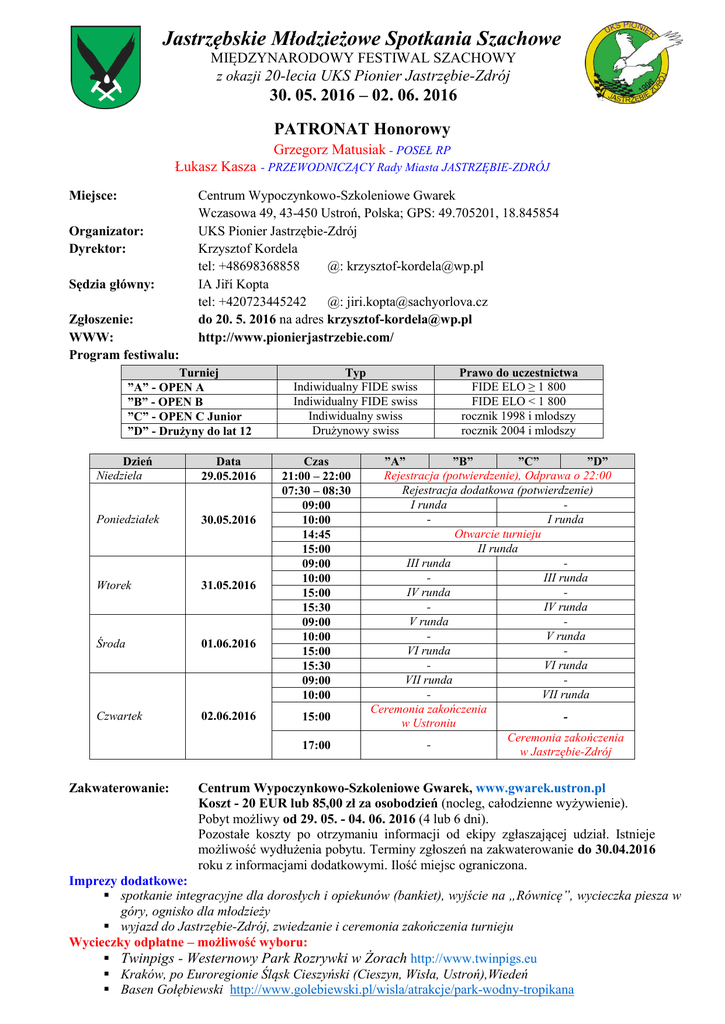 Jastrzębskie Młodzieżowe Spotkania Szachowe MIĘDZYNARODOWY FESTIWAL SZACHOWY z okazji 20-lecia UKS Pionier Jastrzębie-Zdrój 30. 05. 2016 – 02. 06. 2016 PATRONAT Honorowy Grzegorz Matusiak - POSEŁ RP Łukasz Kasza - PRZEWODNICZĄCY Rady Miasta JASTRZĘBIE-ZDRÓJ Miejsce: Organizator: Dyrektor: Sędzia główny: Zgłoszenie: WWW: Program festiwalu: Centrum Wypoczynkowo-Szkoleniowe Gwarek Wczasowa 49, 43-450 Ustroń, Polska; GPS: 49.705201, 18.845854 UKS Pionier Jastrzębie-Zdrój Krzysztof Kordela tel: +48698368858 @: [email protected] IA Jiří Kopta tel: +420723445242 @: [email protected] do 20. 5. 2016 na adres [email protected] http://www.pionierjastrzebie.com/ Turniej ”A” - OPEN A ”B” - OPEN B ”C” - OPEN C Junior ”D” - Drużyny do lat 12 Dzień Niedziela Data 29.05.2016 Poniedziałek 30.05.2016 Wtorek 31.05.2016 Środa 01.06.2016 Czwartek 02.06.2016 Typ Indiwidualny FIDE swiss Indiwidualny FIDE swiss Indiwidualny swiss Drużynowy swiss Czas 21:00 – 22:00 07:30 – 08:30 09:00 10:00 14:45 15:00 09:00 10:00 15:00 15:30 09:00 10:00 15:00 15:30 09:00 10:00 15:00 17:00 Zakwaterowanie: Prawo do uczestnictwa FIDE ELO ≥ 1 800 FIDE ELO < 1 800 rocznik 1998 i mlodszy rocznik 2004 i mlodszy ”A” ”B” ”C” ”D” Rejestracja (potwierdzenie), Odprawa o 22:00 Rejestracja dodatkowa (potwierdzenie) I runda I runda Otwarcie turnieju II runda III runda III runda IV runda IV runda V runda V runda VI runda VI runda VII runda VII runda Ceremonia zakończenia w Ustroniu Ceremonia zakończenia w Jastrzębie-Zdrój Centrum Wypoczynkowo-Szkoleniowe Gwarek, www.gwarek.ustron.pl Koszt - 20 EUR lub 85,00 zł za osobodzień (nocleg, całodzienne wyżywienie). Pobyt możliwy od 29. 05. - 04. 06. 2016 (4 lub 6 dni). Pozostałe koszty po otrzymaniu informacji od ekipy zgłaszającej udział. Istnieje możliwość wydłużenia pobytu. Terminy zgłoszeń na zakwaterowanie do 30.04.2016 roku z informacjami dodatkowymi. Ilość miejsc ograniczona. Imprezy dodatkowe: spotkanie integracyjne dla dorosłych i opiekunów (bankiet), wyjście na „Równicę”, wycieczka piesza w góry, ognisko dla młodzieży wyjazd do Jastrzębie-Zdrój, zwiedzanie i ceremonia zakończenia turnieju Wycieczky odpłatne – możliwość wyboru: Twinpigs - Westernowy Park Rozrywki w Żorach http://www.twinpigs.eu Kraków, po Euroregionie Śląsk Cieszyński (Cieszyn, Wisła, Ustroń),Wiedeń Basen Gołębiewski http://www.golebiewski.pl/wisla/atrakcje/park-wodny-tropikana ”A” - OPEN A Prawo gry: System: zawodnicy posiadający minim. 1800 F-ELO i zatwierdzeni przez organizatorów szwajcarski na dystansie 7 rund, zgłoszony do FIDE Tempo gry: Maks. spóźnienie: Punktacja pom.: 90 min + 30 s/posunięcie 30 minut 1. Średni Buchholz 2. Buchholz 3. Sonnenborn-Berger 4. Progress 25 EUR, zgłoszenie po 25. 5. 2016 – 35 EUR 1-3. miejsce puchar, 1-6. miejsce finansowe, 7-15. miejsce rzeczowe, pozostali upominki Wpisowe: Nagrody: 1. 2. 3. 4. 5. 6. 300 EUR 200 EUR 100 EUR 70 EUR 50 EUR 30 EUR ”B” - OPEN B Prawo gry: System: Tempo gry: Maks. spóźnienie: Punktacja pom.: Wpisowe: Nagrody: zawodnicy posiadający mniej niż 1800 F-ELO i zatwierdzeni przez organizatorów szwajcarski na dystansie 7 rund, zgłoszony do FIDE 90 min + 30 s/posunięcie 30 minut 1. Średni Buchholz 2. Buchholz 3. Sonnenborn-Berger 4. Progress 20 EUR, zgłoszenie po 25. 5. 2016 – 30 EUR 1-3. miejsce puchar, 1-6. miejsce finansowe, 7-15. miejsce rzeczowe, pozostali upominki 1. 2. 3. 4. 5. 6. 150 EUR 100 EUR 50 EUR 30 EUR 25 EUR 20 EUR ”C” - OPEN C Junior Prawo gry: System: Tempo gry: Maks. spóźnienie: Punktacja pom.: Wpisowe: Nagrody: zawodnicy rocznik 1998 i młodszy i zatwierdzeni przez organizatorów szwajcarski na dystansie 7 rund 60 min na zawodnika 30 minut 1. Średni Buchholz 2. Buchholz 3. Sonnenborn-Berger 4. Progress bez wpisowego 1-3. miejsce puchar, 1-3. miejsce chłopcyi dziewczęta medale wszyscy otrzymują nagrody lub upominki ”D” - Drużyny do lat 12 Prawo gry: System: Tempo gry: Maks. spóźnienie: Punktacja: Wpisowe: Nagrody: Rocznik 2004 i młodszy. Drużyna składa się z 3 osób grających według szachownic: 1. chłopak lub dziewczyna, 2. chłopak lub dziewczyna, 3. dziewczyna. szwajcarski na dystansie 7 rund 60 min na zawodnika 30 minut 1. Punkty meczowe (2-1-0) 2. Małe punkty 3. Wynik spólnego meczu 4. Lepszy rezultat punktowy na 1. szachownicy, nast. 2. itd. bez wpisowego 1-6. miejsce puchar, 1-3. miejsce medale wszyscy otrzymują nagrody lub upominki Ilość miejsc w turniejach ograniczona. Udział w turnieju wezmą tylko zawodnicy potwierdzeni przez organizatora!
