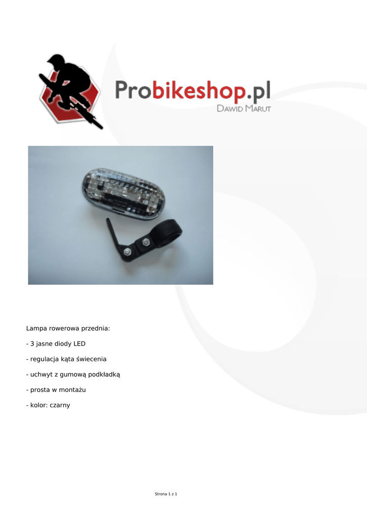 Lampa rowerowa przednia: - 3 jasne diody LED - regulacja kąta świecenia - uchwyt z gumową podkładką - prosta w montażu - kolor: czarny Strona 1 z 1