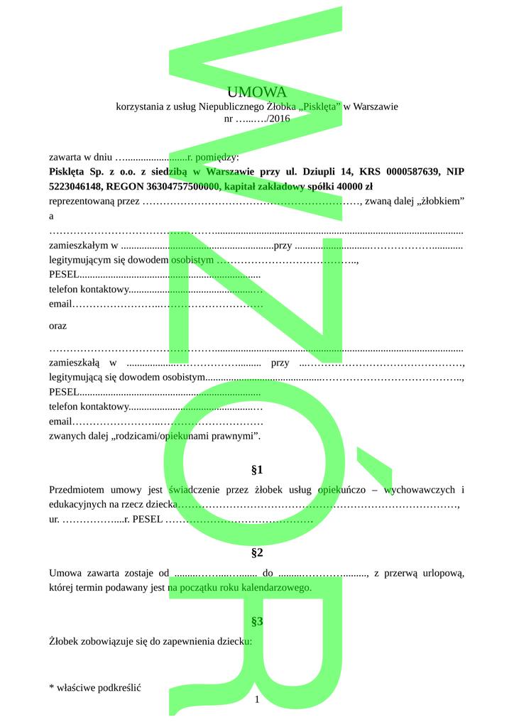 WZÓR UMOWA korzystania z usług Niepublicznego Żłobka „Pisklęta” w Warszawie nr …...…./2016 zawarta w dniu …........................r. pomiędzy: Pisklęta Sp. z o.o. z siedzibą w Warszawie przy ul. Dziupli 14, KRS 0000587639, NIP 5223046148, REGON 36304757500000, kapitał zakładowy spółki 40000 zł reprezentowaną przez ………………………………………………………, zwaną dalej „żłobkiem” a …………………………………………................................................................................................ zamieszkałym w ...........................................................przy .............................………………............ legitymującym się dowodem osobistym ………………………………….., PESEL...................................................................... telefon kontaktowy................................................… email……………………..………………………… oraz …………………………………………................................................................................................ zamieszkałą w ...................………………......... przy ...………………………………………, legitymującą się dowodem osobistym.............................................………………………………….., PESEL...................................................................... telefon kontaktowy................................................… email……………………..………………………… zwanych dalej „rodzicami/opiekunami prawnymi”. §1 Przedmiotem umowy jest świadczenie przez żłobek usług opiekuńczo – wychowawczych i edukacyjnych na rzecz dziecka………………………………………………………………………, ur. ……………....r. PESEL ……………………………………. §2 Umowa zawarta zostaje od .........……....…....... do .........…………........., z przerwą urlopową, której termin podawany jest na początku roku kalendarzowego. §3 Żłobek zobowiązuje się do zapewnienia dziecku: * właściwe podkreślić 1 WZÓR a) Profesjonalnej opieki w warunkach zbliżonych do warunków domowych; b) Zajęć opiekuńczo – wychowawczych i edukacyjnych dostosowanych do wieku rozwojowego oraz uwzględniających rozwój psychomotoryczny, emocjonalny i społeczny dziecka; c) Wspomagania i stymulowania jego indywidualnego rozwoju; d) Wsparcia wychowawczej roli rodziny; e) Bezpieczeństwa w czasie jego przebywania na terenie żłobka; f) Zdrowego i racjonalnego żywienia z uwzględnieniem indywidualnych zaleceń lekarskich. §4 Szczegółowe zasady organizacji pracy żłobka określają Statut żłobka oraz Regulamin żłobka. §5 1. W przyjmowaniu opłat za pobyt i wyżywienie dziecka żłobek będzie stosował następujące zasady: a) opłatę za pobyt dziecka w żłobku oraz opłatę za wyżywienie wnosi się z dołu do 12. dnia miesiąca następującego po miesiącu, w którym dziecko uczęszczało do żłobka. Oznacza to, że najpóźniej w tym dniu należność powinna znajdować się na koncie żłobka; b) okresem rozliczeniowym jest miesiąc kalendarzowy; c) za dni nieobecności dziecka w żłobku rodzice nie będą obciążani opłatą za wyżywienie pod warunkiem poinformowania żłobka o nieobecności dziecka najpóźniej w pierwszym dniu tej nieobecności do godz. 8:00. d) w przypadku pozostawienia dziecka w czasie wykraczającym poza czas pracy żłobka, rodzic/opiekun prawny zobowiązany jest do uiszczenia dodatkowej opłaty zgodnie z obowiązującym cennikiem zamieszczonym na stronie internetowej żłobka. Powyższa należność zostanie doliczona do opłat za korzystanie z usług żłobka w kolejnym okresie rozliczeniowym. 2. Płatności należy regulować przelewem na konto bankowe nr 46103000190109850330020266. Wysokość wpłaty określona jest na rachunku wystawionym przez żłobek i przesyłanym elektronicznie na podane w niniejszej umowie adresy e-mail. Rachunek uwzględnia rozdzielenie opłat za pobyt i wyżywienie. 3. Za każdy dzień zwłoki w płatnościach żłobkowi przysługują odsetki umowne w wysokości odsetek maksymalnych, stanowiących czterokrotność stopy kredytu lombardowego NBP (art. 359 § 21 K.c.). 4. W przypadku braku płatności na koniec miesiąca następującego po miesiącu, którego płatność dotyczy, żłobek zastrzega sobie prawo do odmowy przyjęcia dziecka do czasu uregulowania zaległej płatności. §6 * właściwe podkreślić 2 WZÓR 1. Rodzice/opiekunowie prawni zobowiązują się do: a) Zapoznania się ze Statutem żłobka oraz z Regulaminem żłobka; b) Przestrzegania zasad funkcjonowania żłobka zawartych w Statucie i Regulaminie; c) Współdziałania ze żłobkiem w zakresie wszystkich spraw związanych z pobytem dziecka w placówce; d) Przyprowadzania i odbierania dziecka ze żłobka osobiście lub przez osobę upoważnioną; e) Terminowego wnoszenia opłat ustalonych w niniejszej umowie; f) Niezwłocznego informowania żłobka o nieobecności dziecka: o nagłej nieobecności (sms, telefon) – do godz. 8:00, o nieobecności planowanej – najpóźniej poprzedniego dnia roboczego; g) Natychmiastowego zawiadomienia żłobka w przypadku wystąpienia u dziecka choroby zakaźnej lub innej mogącej przenosić się na pozostałe dzieci korzystające z usług żłobka; h) Przyprowadzania do żłobka dziecka wyłącznie zdrowego; i) Informowania żłobka o wszelkich zmianach w danych osobowych dziecka oraz rodziców/opiekunów, ze szczególnym uwzględnieniem numerów telefonów rodziców/opiekunów. 2. Ponadto Rodzice/opiekunowie: a) Wyrażają zgodę na dokonywanie czynności pielęgnacyjnych przy ich dziecku oraz wyrażanie czułości poprzez przytulanie, głaskanie, tulenie do snu; b) Wyrażają/nie wyrażają* zgodę na fotografowanie ich dziecka oraz umieszczanie jego zdjęć w gale