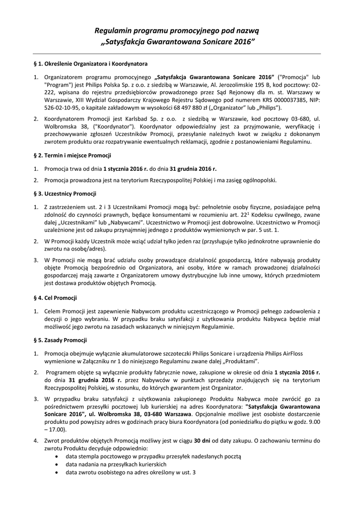 1. Organizatorem programu promocyjnego „Satysfakcja Gwarantowana Sonicare 2016” ("Promocja" lub