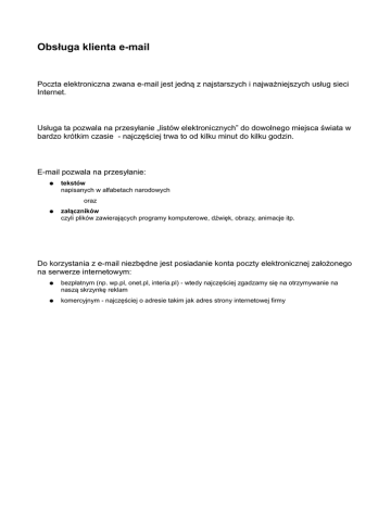 Obsługa klienta e-mail Poczta elektroniczna zwana e-mail jest jedną z najstarszych i najważniejszych usług sieci Internet. Usługa ta pozwala na przesyłanie „listów elektronicznych” do dowolnego miejsca świata w bardzo krótkim czasie - najczęściej trwa to od kilku minut do kilku godzin. E-mail pozwala na przesyłanie: ● tekstów napisanych w alfabetach narodowych oraz ● załączników czyli plików zawierających programy komputerowe, dźwięk, obrazy, animacje itp. Do korzystania z e-mail niezbędne jest posiadanie konta poczty elektronicznej założonego na serwerze internetowym: ● bezpłatnym (np. wp.pl, onet.pl, interia.pl) - wtedy najczęściej zgadzamy się na otrzymywanie na naszą skrzynkę reklam ● komercyjnym - najczęściej o adresie takim jak adres strony internetowej firmy Jak można odbierać i wysyłać e-mail ? ● korzystając interfejsu www, czyli wpisaniu w przeglądarce adresu internetowego i po zalogowaniu, wysyłanie i odbieranie z e-mail zalety: ○ łatwy dostęp do e-mail'a z dowolnego komputera, bez konieczności konfigurowania programu pocztowego wady: ● ○ brak dostępu do poczty gdy nie ma połączenia z internetem ○ kłopotliwe korzystanie z więcej niż jednego konta korzystając z programu do wysyłania i odbierania poczty zalety: ○ dostęp do wcześniej odebranych maili nawet jeżeli nie ma połączenia z internetem, gdyż odebrana poczta znajduje się na dysku naszego komputera ○ łatwe odbieranie poczty z kilku kont jednocześnie ○ automatyczne odbieranie poczty co kilka minut ○ szybkie wysyłanie załączników wady: ○ konieczność skonfigurowania programu pocztowego Programy do wysyłania i odbierania poczty nazywają się klientem poczty elektronicznej. Do najpopularniejszych należą: Outlook Express, MS Outlook, Mozilla Thunderbird, Apple Mail. Każdy program pocztowy musi zostać skonfigurowany. W kreatorze konfiguracji należy wpisać: 1. imię i nazwisko ewentualnie pseudonim np.: Jan Kowalski 2. adres e-mail skrzynki pocztowej (ewentualnie kilku skrzynek pocztowych), z której pobierane będą przesyłki np.: [email protected] 3. serwer poczty przychodzącej adres i typ (najczęściej POP3) np.: infofirmy.com 4. serwer poczty wychodzącej adres i typ np.: infofirmy.com (często trzeba zaznaczyć opcję że „serwer wymaga uwierzytelnienia” 5. nazwa użytkownika (konta) – często jest to adres e-mail, ale nie zawsze np.: [email protected] 6. hasło do konta pocztowego np.: karuzela Konfiguracja programu Mail dla MAC'a 1. Ekran powitalny kliknij dalej 2. Informacje ogólne rodzaj konta: POP opis konta: Konto POP pełna nazwa: wpisz swoje imię i nazwisko adres e-mail: wpisz swój adres e-mail np.: np.: [email protected] kliknij dalej 3. serwer poczty przychodzącej serwer poczty przychodzącej : infofirmy.com nazwa użytkownika: wpisz adres e-mail np.: [email protected] hasło: karuzela kliknij dalej 4. jeżeli się wyświetli ekran: Zabezpieczenia poczty przychodzącej kliknij dalej 5. serwer poczty wychodzącej serwer poczty wychodzącej: infofirmy.com zaznacz „użyj uwierzytelniania” i wpisz: nazwa użytkownika: wpisz adres e-mail np.: [email protected] hasło: karuzela kliknij dalej 6. Podsumowanie konta wyświetla parametry skonfigurowanego konta kliknij dalej 7. Podsumowanie kliknij gotowe 8. Wyświetli się ekran powitalny: Witamy serdecznie kliknij NIE Wysyłanie i obieranie poczty 1. kliknij na strzałki po prawej stronie i wybierz „Nowa” 2. w polu „Do” wpisz adres [email protected] 3. pole „Cc” pozostaw puste 4. w polu temat wpisz „test poczty kl 2 – wpisz swoje imię i nazwisko” 5. w treści wpisz: „zajęcia z technologii informacyjnej, testuję pocztę – wpisz swoje imię i nawisko” 6. wcisnij klawisz 'Wyślij” po 1-2 minutach odbierz pocztę od nauczyciela 7. kliknij na strzałki po prawej stronie i wybierz „Pobierz pocztę” powinieneś otrzymać meila od Krzysztof Ufniarz a w treści będzie e-mail, który wysłałeś z dopisanym słowem „otrzymałem”