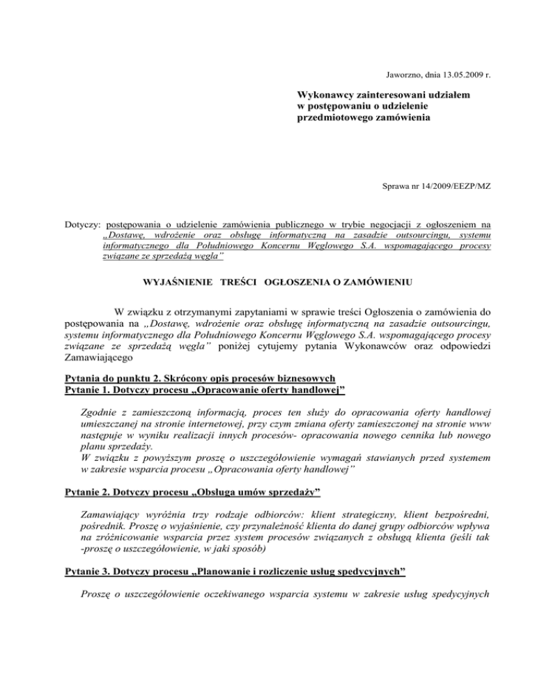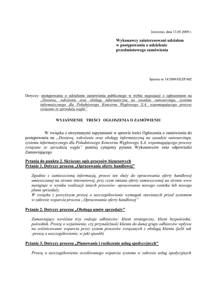 Jaworzno, dnia 13.05.2009 r. Wykonawcy zainteresowani udziałem w postępowaniu o udzielenie przedmiotowego zamówienia Sprawa nr 14/2009/EEZP/MZ Dotyczy: postępowania o udzielenie zamówienia publicznego w trybie negocjacji z ogłoszeniem na „Dostawę, wdroŜenie oraz obsługę informatyczną na zasadzie outsourcingu, systemu informatycznego dla Południowego Koncernu Węglowego S.A. wspomagającego procesy związane ze sprzedaŜą węgla” WYJAŚNIENIE TREŚCI OGŁOSZENIA O ZAMÓWIENIU W związku z otrzymanymi zapytaniami w sprawie treści Ogłoszenia o zamówienia do postępowania na „Dostawę, wdroŜenie oraz obsługę informatyczną na zasadzie outsourcingu, systemu informatycznego dla Południowego Koncernu Węglowego S.A. wspomagającego procesy związane ze sprzedaŜą węgla” poniŜej cytujemy pytania Wykonawców oraz odpowiedzi Zamawiającego Pytania do punktu 2. Skrócony opis procesów biznesowych Pytanie 1. Dotyczy procesu „Opracowanie oferty handlowej” Zgodnie z zamieszczoną informacją, proces ten słuŜy do opracowania oferty handlowej umieszczanej na stronie internetowej, przy czym zmiana oferty zamieszczonej na stronie www następuje w wyniku realizacji innych procesów- opracowania nowego cennika lub nowego planu sprzedaŜy. W związku z powyŜszym proszę o uszczegółowienie wymagań stawianych przed systemem w zakresie wsparcia procesu „Opracowania oferty handlowej” Pytanie 2. Dotyczy procesu „Obsługa umów sprzedaŜy” Zamawiający wyróŜnia trzy rodzaje odbiorców: klient strategiczny, klient bezpośredni, pośrednik. Proszę o wyjaśnienie, czy przynaleŜność klienta do danej grupy odbiorców wpływa na zróŜnicowanie wsparcia przez system procesów związanych z obsługą klienta (jeśli tak -proszę o uszczegółowienie, w jaki sposób) Pytanie 3. Dotyczy procesu „Planowanie i rozliczenie usług spedycyjnych” Proszę o uszczegółowienie oczekiwanego wsparcia systemu w zakresie usług spedycyjnych wykonywanych prze PKW S.A, w szczególności w zakresie planowania usług spedycyjnychskrócony opis procesu odnosi się wyłącznie do rozliczania usługi spedycyjnej i elementów związanych z realizacją usługi spedycyjnej Pytanie 4. Dotyczy procesu „Analiza jakości węgla” Czy dla wsparcia procesu analizy jakości węgla wykorzystywane jest obecnie oprogramowanie specjalistyczne? Jeśli tak, proszę o wyjaśnienie, jakie jest oczekiwane wsparcie systemu w ramach procesu, w szczególności, czy system zapewnić ma funkcjonalności dla wsparcia całości procesu, czy istnieją pewne elementy procesu (np. harmonogramowanie pobieranych prób, rejestracja wyników prób laboratoryjnych), dla których planowane jest pozostawienie funkcjonalności specjalistycznego oprogramowanie? Pytanie 5. Dotyczy procesu „Pobranie ze zwału” Proszę o uszczegółowienie oczekiwanego wsparcia systemu w zakresie obmiaru stanu węgla w ramach gospodarki zwałami. Pytanie 6. Dotyczy procesu „Kolejkowanie pojazdów i kontrola na bramie” Proszę o uszczegółowienie oczekiwanego wsparcia systemu dla opisanego procesu kolejkowania pojazdów i kontroli na bramie. Pytanie 7. Dotyczy procesu „Wystawienie faktury wewnętrznej” Proszę o uszczegółowienie opisu procesu w zakresie dotyczącym sprzedaŜy realizowanej za talony. Odpowiedź do pytań od 1-7 Mapa procesów biznesowych wspierających sprzedaŜ węgla w Południowym Koncernie Węglowym S.A. jest materiałem bardzo obszernym oraz stanowiącym wartość intelektualną firmy dlatego załoŜono, Ŝe powinna być w całości udostępniona firmom, które zostaną dopuszczone do udziału w postępowaniu. Ponadto w „Krótkim opisie przedmiotu zamówienia” skrótowy opis procesów biznesowych został zamieszczony tylko dla celów poglądowych, tak by lepiej zobrazować oczekiwania Zamawiającego. Nie ma on wpływu na kryteria wyboru podmiotów zdolnych zrealizować przedmiot umowy. Pytania do punktu 2. Skrócony opis procesów biznesowych Pytanie 8. Dotyczy zapisu: Dostarczony system powinie (…) Zapewnić powiązanie z infrastrukturą techniczną kopalń- obsługa wagami węglowymi kolejowymi i samochodowymi. Pytanie: • Proszę o podanie informacji na temat obecnie wykorzystywanej infrastruktury technicznej kopalń (wagi węglowe kolejowe i samochodowe), z którymi ma zostać zapewnione powiązanie. • Proszę o wskazanie w jakich procesach / w jakich elementach procesów zapewnione ma zostać powiązanie z wagami węglowymi. Odpowiedź System informatyczny powinien zapewnić powiązanie z infrastrukturą techniczną kopalń, m.in. obsługa wagami węglowymi wagonowymi, samochodowymi oraz drukarkami fiskalnymi. W ramach obsługi wagi węglowej przez System powinny być realizowane m. in.: • komunikacja ze sterownikiem wagi, w tym: o waŜenie tary, o waŜenie brutta, o odmierzanie zadanej ilości towaru, itd. • odczyty oraz reakcja na wskazania czujników obrysu (bariery optyczne), • sterowanie sygnalizacją świetlną i szlabanami, • analiza stanu zabezpieczeń. W Południowym Koncernie Węglowym S.A. eksploatowany są wagi takich producentów jak: • Leon Engineering, • Precia Molen, • Progress, • Flintec, • SysTec. Pytanie 9. Dotyczy zapisu: Oferowane rozwiązanie musi zawierać infrastrukturę od uruchamiania aplikacji mobilnych: zarządzanie urządzeniami mobilnymi, synchronizacją, narzędzie do rozwoju aplikacji mobilnych. Pytanie. Proszę o uszczegółowienie zapisu: • Jakich urządzeń mobilnych wykorzystywanych w PKW S.A., bądź planowanych do wykorzystywania dotyczy wymaganie? • W jakich procesach wykorzystywane są (lub mają być) urządzenia (aplikacje) mobilne? (jeśli to moŜliwe, proszę o skrótowe określenie funkcjonalności aplikacji mobilnych) • Jaki jest zakładany tryb współpracy urządzeń (wymaganie odnosi się do „synchronizacji”)- czy zakładana jest praca w trybie „off-line”? Odpowiedź W Południowym Koncernie Węglowym S.A. pl