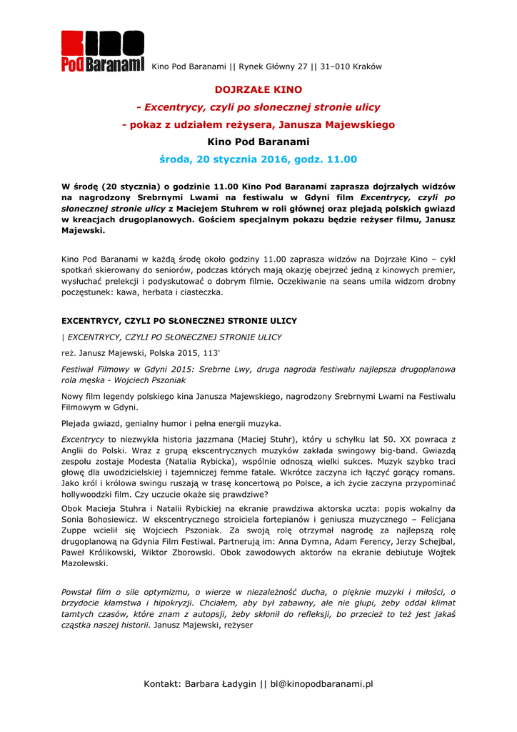 Kino Pod Baranami || Rynek Główny 27 || 31–010 Kraków DOJRZAŁE KINO - Excentrycy, czyli po słonecznej stronie ulicy - pokaz z udziałem reżysera, Janusza Majewskiego Kino Pod Baranami środa, 20 stycznia 2016, godz. 11.00 W środę (20 stycznia) o godzinie 11.00 Kino Pod Baranami zaprasza dojrzałych widzów na nagrodzony Srebrnymi Lwami na festiwalu w Gdyni film Excentrycy, czyli po słonecznej stronie ulicy z Maciejem Stuhrem w roli głównej oraz plejadą polskich gwiazd w kreacjach drugoplanowych. Gościem specjalnym pokazu będzie reżyser filmu, Janusz Majewski. Kino Pod Baranami w każdą środę około godziny 11.00 zaprasza widzów na Dojrzałe Kino – cykl spotkań skierowany do seniorów, podczas których mają okazję obejrzeć jedną z kinowych premier, wysłuchać prelekcji i podyskutować o dobrym filmie. Oczekiwanie na seans umila widzom drobny poczęstunek: kawa, herbata i ciasteczka. EXCENTRYCY, CZYLI PO SŁONECZNEJ STRONIE ULICY | EXCENTRYCY, CZYLI PO SŁONECZNEJ STRONIE ULICY reż. Janusz Majewski, Polska 2015, 113' Festiwal Filmowy w Gdyni 2015: Srebrne Lwy, druga nagroda festiwalu najlepsza drugoplanowa rola męska - Wojciech Pszoniak Nowy film legendy polskiego kina Janusza Majewskiego, nagrodzony Srebrnymi Lwami na Festiwalu Filmowym w Gdyni. Plejada gwiazd, genialny humor i pełna energii muzyka. Excentrycy to niezwykła historia jazzmana (Maciej Stuhr), który u schyłku lat 50. XX powraca z Anglii do Polski. Wraz z grupą ekscentrycznych muzyków zakłada swingowy big-band. Gwiazdą zespołu zostaje Modesta (Natalia Rybicka), wspólnie odnoszą wielki sukces. Muzyk szybko traci głowę dla uwodzicielskiej i tajemniczej femme fatale. Wkrótce zaczyna ich łączyć gorący romans. Jako król i królowa swingu ruszają w trasę koncertową po Polsce, a ich życie zaczyna przypominać hollywoodzki film. Czy uczucie okaże się prawdziwe? Obok Macieja Stuhra i Natalii Rybickiej na ekranie prawdziwa aktorska uczta: popis wokalny da Sonia Bohosiewicz. W ekscentrycznego stroiciela fortepianów i geniusza muzycznego – Felicjana Zuppe wcielił się Wojciech Pszoniak. Za swoją rolę otrzymał nagrodę za najlepszą rolę drugoplanową na Gdynia Film Festiwal. Partnerują im: Anna Dymna, Adam Ferency, Jerzy Schejbal, Paweł Królikowski, Wiktor Zborowski. Obok zawodowych aktorów na ekranie debiutuje Wojtek Mazolewski. Powstał film o sile optymizmu, o wierze w niezależność ducha, o pięknie muzyki i miłości, o brzydocie kłamstwa i hipokryzji. Chciałem, aby był zabawny, ale nie głupi, żeby oddał klimat tamtych czasów, które znam z autopsji, żeby skłonił do refleksji, bo przecież to też jest jakaś cząstka naszej historii. Janusz Majewski, reżyser Kontakt: Barbara Ładygin || [email protected] Kino Pod Baranami || Rynek Główny 27 || 31–010 Kraków Pochwała życia, pasji, radości. Reżyser nakręcił film na przekór naszym polskim martyrologicznym zapędom i wbrew ponurym wspomnieniom - to ubrana w piękny kostium fantazja, film o złudzeniach i ich utracie, a także o radzeniu sobie z rozczarowaniem. Alicja Sterna, Onet.pl Największa niespodzianka 40. Festiwalu Filmowego w Gdyni. Oto bowiem polski film, który bawi, wywołuje emocje i brzmi fenomenalnie. Adam Siennica, NaEkranie.pl Reżyser udowadnia, że wciąż tli się w nim iskra autorskiej zawziętości. Wspaniały film. Małgorzata Steciak, Stopklatka.pl Excentrycy zostali entuzjastycznie przyjęci przez publiczność podczas 40. Festiwalu Filmowego w Gdyni. Radio Gdańsk Film prezentowany z angielskimi napisami. Spotkania Dojrzałego Kina odbywają się co środę, w okolicach godziny 11.00. Uczestnicy cyklu prowadzą blog z recenzjami obejrzanych filmów: www.dojrzalekino.pl. Cykl zrealizowano przy wsparciu PISF. BILETY dla seniorów: 12 zł Dojrzałe kino, jak dojrzałe wino – to pełnia smaku! PARTNERZY: Kontakt: Barbara Ładygin || [email protected]