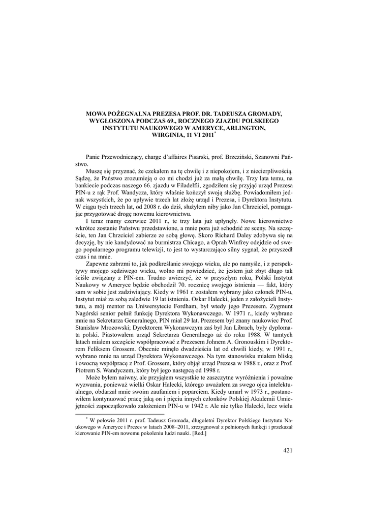 MOWA POŻEGNALNA PREZESA PROF. DR. TADEUSZA GROMADY, WYGŁOSZONA PODCZAS 69., ROCZNEGO ZJAZDU POLSKIEGO INSTYTUTU NAUKOWEGO W AMERYCE, ARLINGTON, WIRGINIA, 11 VI 2011* Panie Przewodniczący, charge d’affaires Pisarski, prof. Brzeziński, Szanowni Państwo. Muszę się przyznać, że czekałem na tę chwilę i z niepokojem, i z niecierpliwością. Sądzę, że Państwo zrozumieją o co mi chodzi już za małą chwilę. Trzy lata temu, na bankiecie podczas naszego 66. zjazdu w Filadelfii, zgodziłem się przyjąć urząd Prezesa PIN-u z rąk Prof. Wandycza, który właśnie kończył swoją służbę. Powiadomiłem jednak wszystkich, że po upływie trzech lat złożę urząd i Prezesa, i Dyrektora Instytutu. W ciągu tych trzech lat, od 2008 r. do dziś, służyłem niby jako Jan Chrzciciel, pomagając przygotować drogę nowemu kierownictwu. I teraz mamy czerwiec 2011 r., te trzy lata już upłynęły. Nowe kierownictwo wkrótce zostanie Państwu przedstawione, a mnie pora już schodzić ze sceny. Na szczęście, ten Jan Chrzciciel zabierze ze sobą głowę. Skoro Richard Daley zdobywa się na decyzję, by nie kandydować na burmistrza Chicago, a Oprah Winfrey odejdzie od swego popularnego programu telewizji, to jest to wystarczająco silny sygnał, że przyszedł czas i na mnie. Zapewne zabrzmi to, jak podkreślanie swojego wieku, ale po namyśle, i z perspektywy mojego sędziwego wieku, wolno mi powiedzieć, że jestem już zbyt długo tak ściśle związany z PIN-em. Trudno uwierzyć, że w przyszłym roku, Polski Instytut Naukowy w Ameryce będzie obchodził 70. rocznicę swojego istnienia — fakt, który sam w sobie jest zadziwiający. Kiedy w 1961 r. zostałem wybrany jako członek PIN-u, Instytut miał za sobą zaledwie 19 lat istnienia. Oskar Halecki, jeden z założycieli Instytutu, a mój mentor na Uniwersytecie Fordham, był wtedy jego Prezesem. Zygmunt Nagórski senior pełnił funkcję Dyrektora Wykonawczego. W 1971 r., kiedy wybrano mnie na Sekretarza Generalnego, PIN miał 29 lat. Prezesem był znany naukowiec Prof. Stanisław Mrozowski; Dyrektorem Wykonawczym zaś był Jan Librach, były dyplomata polski. Piastowałem urząd Sekretarza Generalnego aż do roku 1988. W tamtych latach miałem szczęście współpracować z Prezesem Johnem A. Gronouskim i Dyrektorem Feliksem Grossem. Obecnie minęło dwadzieścia lat od chwili kiedy, w 1991 r., wybrano mnie na urząd Dyrektora Wykonawczego. Na tym stanowisku miałem bliską i owocną współpracę z Prof. Grossem, który objął urząd Prezesa w 1988 r., oraz z Prof. Piotrem S. Wandyczem, który był jego następcą od 1998 r. Może byłem naiwny, ale przyjąłem wszystkie te zaszczytne wyróżnienia i poważne wyzwania, ponieważ wielki Oskar Halecki, którego uważałem za swego ojca intelektualnego, obdarzał mnie swoim zaufaniem i poparciem. Kiedy umarł w 1973 r., postanowiłem kontynuować pracę jaką on i pięciu innych członków Polskiej Akademii Umiejętności zapoczątkowało założeniem PIN-u w 1942 r. Ale nie tylko Halecki, lecz wielu * W połowie 2011 r. prof. Tadeusz Gromada, długoletni Dyrektor Polskiego Instytutu Naukowego w Ameryce i Prezes w latach 2008–2011, zrezygnował z pełnionych funkcji i przekazał kierowanie PIN-em nowemu pokoleniu ludzi nauki. [Red.] 421 innych kolegów i przyjaciół, zbyt wielu by wymienić tu każdego po imieniu, wspierali mnie w tej pracy. Nie muszę mówić, jak bardzo potrzebowałem i jak wysoko ceniłem ich pomoc i poparcie. Rzecz jasna, nigdy nie potrafiłbym sprostać tym wyzwaniom, gdybym nie miał silnego wsparcia mojej żony Teresy, córki Anny oraz synów Józefa i Jana. Bez wyrozumienia i tolerancji Teresy to wszystko byłoby niemożliwe. Mówiąc o swojej rodzinie, muszę także powiedzieć słówko o swojej siostrze Janinie i jej mężu Henryku Kedron. Od 1987 r., aż do dziś, Janina jest moją najbliższą współpracowniczką. Służyła najpierw jako Asystentka Wykonawcza, a następnie jako Dyrektor Zastępczy. Jej usługi PIN-owi, jak i mi samemu są po prostu bezcenne. Zasługuje na medal honoru. Jak wyżej wymieniłem, największą motywacją do zaangażowania w pracy tej niezwykłej organizacji akademickiej stanowiło moje przekonanie o ważności i konieczności jej misji. tj. rozpowszechnienia wiedzy o Polsce, ojczyźnie moich przodków wśród moich współobywateli amerykańskich, cieszących się z życia w społeczeństwie pluralistycznym. Promować pełniejszą wiedzę wśród Amerykanów, szczególnie Amerykanów polskiego pochodzenia, o dziedzictwie intelektualnym Polski — które tyle znaczyło dla naszej zachodniej cywilizacji. Jak długo trwała zimna wojna, PIN stał niezachwiany na straży wolności akademickiej, szacunku dla człowieka oraz praw ludzkich. Był to niebezpieczny okres, który (zagrażał) naszej cywilizacji, ale szczerze mówiąc, cieszę się, że dano mi żyć właśnie w tych czasach. Jestem dumny z roli, jaką odegrał odważny naród polski poprzez ich ruch Solidarność, ich wodzów moralnych, przede wszystkim bł. Jana Pawła II. Odkryli przed oczami świata bankructwo ideologii Marks-Leninizmu, i doprowadzili do upadku systemu komunistycznego w Europie. Pokojowa emancypacja nie tylko Polski, ale i innych narodów Wschodnio-Centralnej Europy, była rezultatem ich niezłomnej odwagi, kiedy siła moralna odniosła zwycięstwo nad mocą militarną. Lecz te dramatyczne zmiany, zapoczątkowane w 1989 r., nie zmieniły zasadniczo misji PIN-u. Jego posłannictwo jest tak samo istotne i ważne dziś, kiedy Polska jest partnerem strategicznym i aliantem Stanów Zjednoczonych, jak było podczas zimnej wojny, kiedy Polska znalazła się za żelazną kurtyną. Zmiany te wreszcie pozwoliły PIN-owi na normalne i naturalne kontakty z demokratycznym rządem Polski i instytucjami akademicko-kulturalnymi tego kraju. Od 1990 r., my w PIN-ie, mamy za najwyższy priorytet, rozwój i utrzymanie bliskiej współpracy z Polską, przed