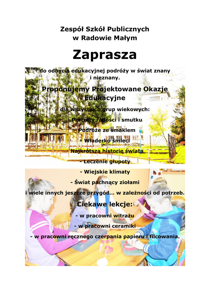Zespół Szkół Publicznych w Radowie Małym Zaprasza do odbycia edukacyjnej podróży w świat znany i nieznany. Proponujemy Projektowane Okazje Edukacyjne dla wszystkich grup wiekowych: - Portrety radości i smutku - Podróże ze smakiem - Wiaderko śmieci - Najkrótszą historię świata - Leczenie głupoty - Wiejskie klimaty - Świat pachnący ziołami i wiele innych jeszcze przygód… w zależności od potrzeb. Ciekawe lekcje: - w pracowni witrażu - w pracowni ceramiki - w pracowni ręcznego czerpania papieru i filcowania. Posiadamy dobre zaplecze socjalne: - stołówkę - bazę noclegową (bez pościeli i koców) - halę sportową - plac ogniskowy - zieloną klasę - piękne zielone tereny - las, jezioro, łąki. Koszt pobytu 3 dniowego wynosi 299 zł: cena zawiera nocleg, wyżywienie, zajęcia warsztatowe i możliwość korzystania z obiektu. Możliwe są również pobyty 4, 5 dniowe – w tygodniu i weekend. Zapraszamy i prosimy o kontakt tel./fax (091) 3972291 606340903 e-mail [email protected] Działania warsztatowe do wyboru. Ciekawe lekcje w pracowniach… „Podróże ze smakiem” KUCHNIA Opowieść o tym, jak przyprawy zmieniły świat, pieczenie pierników. Czas trwania 1,5h. Adresowany do różnych grup wiekowych. „Od ziarenka do bochenka” KUCHNIA Ukazanie związków między ludźmi wykonującymi różne zawody – rolnik, młynarz, piekarz, sprzedawca. Poznanie różnych gatunków zbóż. Pieczenie chleba, degustacja pieczywa. Adresowany do różnych grup wiekowych. „Wiejskie klimaty” KUCHNIA Opowieść o życiu i zwyczajach na wsi. Ukazanie różnic między życiem na wsi a w mieście – pozytywy i zagrożenia. Wykonanie dżemu i pieczenie bułeczek. Degustacja żywności produkowanej przez ludzi na wsi. Adresowany do różnych grup wiekowych. „Leki z domowej apteki” KUCHNIA To powieść o jedzeniu i leczniczych walorach artykułów żywnościowych… W czasie spotkania w domowej aptece uczestnicy dowiadują się jak wykonać syrop, maseczkę smaczną i zdrowotną oraz wykonają „życiodajne” ciasteczka. Warsztat ręcznego czerpania papieru Uczestnicy poznają technikę ręcznego czerpania papieru z pulpy papierowej, każdy czerpie własne arkusze, ozdabia je i gotowe zabiera do domu. Omawiamy także sposób wykorzystanie papieru czerpanego do tworzenia przedmiotów artystycznych. „Spotkania z ceramiką” Uczestnicy poznają podstawy rzeźbienia w glinie, ręcznego formowania i zdobienia drobnych przedmiotów. Tworzą własne prace i po wypaleniu będą mogli je odebrać. Istnieje możliwość prezentacji i prób toczenia na kole garncarskim (z napędem elektrycznym i nożnym). „Spotkanie z witrażem” Uczestnicy poznają wszystkie etapy powstawania witrażu. Samodzielnie wykonają przedmiot wykonując kolejne etapy: cięcie szkła, szlifowanie, lutowanie, patynowanie. Dla młodszych dzieci od I kl. SP proponujemy układanie mozaik szklanych. Etapy pracy ograniczają się szlifowania i klejenia szkiełek. Można też realizować malowanie na szkle. „Filcowanie” Warsztat filcowania jest atrakcyjną formą zajęć. Wprowadza uczniów w świat wełny i filcowania techniką na mokro i na sucho na poziomie historycznym, teoretycznym oraz praktycznym. Uczestnicy zapoznają się z technologią przetwarzania wełny - od owcy przez czesankę po przędzę, poznają różne rodzaje wełen i ich zastosowanie, dowiadują się, dlaczego wełna się filcuje i jak to się dzieje. Praktycznie uczestnicy wykonują drobną biżuterię: broszki, kolczyki, korale. „U fotografa” Poznanie roli fotografii w życiu codziennym człowieka, dostrzeganie zatrzymanego piękna. Podstawowe wiadomości na temat wykonywania fotografii, zabawa w fotografa i w fotografowanego. Aktywność niekonwencjonalna „Dzieci wszechświata” Warsztat pozwala uczestnikom dostrzec ich związek ze wszechświatem i innymi ludźmi. Porusza tematykę społeczną i ekologiczną. Uświadamia, że są rzeczy, na które nie mamy wpływu, ale również i takie, na które możemy mieć wpływ jeśli tylko będziemy tego chcieli. (Szczególnie polecam ten warsztat – dla każdej grupy wiekowej.) „Portrety radości i smutku” Uczestnicy poznają świat uczuć oraz „smutki i radości” świata dzieci i dorosłych. Omawiają prawa i obowiązki człowieka, podejmują różne zobowiązania wobec siebie, rodziny, kolegów. Warsztat porusza problematykę społeczną. (uczestnicy otrzymują zdjęcia na płycie CD na własność) (każda grupa wiekowa) „Gesty świata – świat gestów” Uczestnicy przyglądają się ludziom, ich zwyczajom, tradycjom, różnorodności, analizują sposoby wyrażania uczuć oraz przypominają sobie zasady dobrego współżycia z innymi. Warsztat porusza problematykę społeczną i kulturową. (dla każdej grupy wiekowej) Ekologia „Najkrótsza historia świata” Uczestnicy poznają „dzieje ziemi” i obserwują jak człowiek na przełomie wieków wpływał na degradację środowiska. Wykonują makietę przedstawiającą „najkrótszą historię świata” oraz rozmawiają o tym, co my „mali” ludzie możemy zrobić, żeby dalsze zniszczenia nie następowały. „Wiaderko śmieci” Uczestnicy warsztatu, ubrani we właściwy sposób segregują śmieci, które produkowane są w ciągu jednego dnia w przeciętnej polskiej rodzinie. Następnie „zbierają” rady na odpady i starają się zrobić użytek z każdego rodzaju odpadów. Czas trwania 2 h. Adresowany do klas młodszych SP. „W chacie zielarza” Opowieść o pochodzeniu i znaczeniu ziół, magii i leczniczym właściwościom. Wykonanie woreczka – talizmanu, który będzie chronił przed wszelkim złem. Czas trwania 1,5h. adresowany do klas młodszych SP.