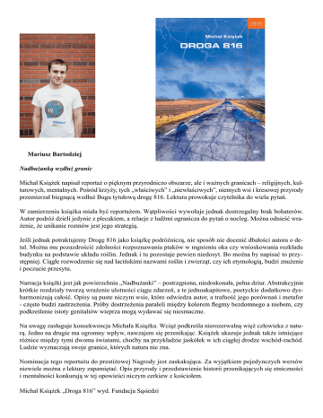 Mariusz Bartodziej Nadbużanką wzdłuż granic Michał Książek napisał reportaż o pięknym przyrodniczo obszarze, ale i ważnych granicach – religijnych, kulturowych, mentalnych. Pośród krzyży, tych „właściwych” i „niewłaściwych”, niemych wsi i kresowej przyrody przemierzał biegnącą wzdłuż Bugu tytułową drogę 816. Lektura prowokuje czytelnika do wielu pytań. W zamierzeniu książka miała być reportażem. Wątpliwości wywołuje jednak dostrzegalny brak bohaterów. Autor podróż dzieli jedynie z plecakiem, a relacje z ludźmi ogranicza do pytań o nocleg. Można odnieść wrażenie, że unikanie rozmów jest jego strategią. Jeśli jednak potraktujemy Drogę 816 jako książkę podróżniczą, nie sposób nie docenić dbałości autora o detal. Można mu pozazdrościć zdolności rozpoznawania ptaków w mgnieniu oka czy wnioskowania rozkładu budynku na podstawie układu roślin. Jednak i tu pozostaje pewien niedosyt. Bo można by napisać to przystępniej. Ciągłe rozwodzenie się nad łacińskimi nazwami roślin i zwierząt, czy ich etymologią, budzi znużenie i poczucie przesytu. Narracja książki jest jak powierzchnia „Nadbużanki” – postrzępiona, niedoskonała, pełna dziur. Abstrakcyjnie krótkie rozdziały tworzą wrażenie ulotności ciągu zdarzeń, a te jednoakapitowe, poetyckie dodatkowo dysharmonizują całość. Opisy są puste niczym wsie, które odwiedza autor, a trafność jego porównań i metafor podkreślenie istoty genitaliów wieprza mogą wydawać się niesmaczne. Na uwagę zasługuje konsekwencja Michała Książka. Wciąż podkreśla nierozerwalną więź człowieka z naturą. Jedno na drugie ma ogromny wpływ, nawzajem się przenikając. Książek ukazuje jednak także istniejące różnice między tymi dwoma światami, choćby na przykładzie jaskółek w ich ciągłej drodze wschód-zachód. Ludzie wyznaczają swoje granice, których natura nie zna. Nominacja tego reportażu do prestiżowej Nagrody jest zaskakująca. Za wyjątkiem pojedynczych wersów niewiele można z lektury zapamiętać. Opis przyrody i przedstawienie historii przenikających się etniczności i mentalności konkurują w tej opowieści niczym cerkiew z kościołem. Michał Książek „Droga 816” wyd. Fundacja Sąsiedzi