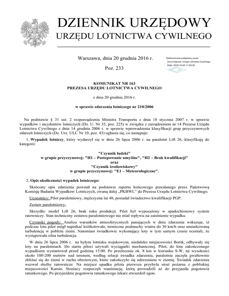 DZIENNIK URZĘDOWY URZĘDU LOTNICTWA CYWILNEGO Warszawa, dnia 20 grudnia 2016 r. Elektronicznie podpisany przez: Anna Kajczuk; Urząd Lotnictwa Cywilnego Poz. 233 Data: 2016-12-20 11:25:32 KOMUNIKAT NR 163 PREZESA URZĘDU LOTNICTWA CYWILNEGO z dnia 20 grudnia 2016 r. w sprawie zdarzenia lotniczego nr 210/2006 Na podstawie § 31 ust. 2 rozporządzenia Ministra Transportu z dnia 18 stycznia 2007 r. w sprawie wypadków i incydentów lotniczych (Dz. U. Nr 35, poz. 225) w związku z zarządzeniem nr 14 Prezesa Urzędu Lotnictwa Cywilnego z dnia 14 grudnia 2006 r. w sprawie wprowadzenia klasyfikacji grup przyczynowych zdarzeń lotniczych (Dz. Urz. ULC Nr 10, poz. 43) ogłasza się, co następuje: 1. Wypadek lotniczy, który wydarzył się w dniu 26 lipca 2006 r. na paralotni Lift 26, klasyfikuję do kategorii: "Czynnik ludzki" w grupie przyczynowej: "H1 – Postepowanie umyślne", "H2 – Brak kwalifikacji" oraz "Czynnik środowiskowy" w grupie przyczynowej: "E1 – Meteorologiczne". 2. Opis okoliczności wypadek lotniczego: Skrócony opis zdarzenia powstał na podstawie raportu końcowego przesłanego przez Państwową Komisję Badania Wypadków Lotniczych, zwaną dalej „PKBWL” do Prezesa Urzędu Lotnictwa Cywilnego. Uczestnicy: Pilot paralotniowy, mężczyzna lat 48, posiadał świadectwo kwalifikacji PGP. Zestaw paralotniowy: Skrzydło: model Lift 26, brak roku produkcji. Pilot był wyposażony w spadochronowy system ratowniczy. Stan techniczny zestawu paralotniowego nie miał wpływu na zaistnienie wypadku. Czynniki pogody: Analiza warunków atmosferycznych panujących w dniu zdarzenia wskazuje, iż podczas lotu pilot mógł napotkać krótkotrwałe, termiczne podmuchy wiatru do 30 km/h oraz umiarkowaną turbulencję w pobliżu ziemi. Natomiast świadkowie wykonujący loty w tym samym czasie oceniali, że występowała silna turbulencja. W dniu 26 lipca 2006 r. na byłym lotnisku wojskowym, niedaleko miejscowości Borsk, odbywały się loty na paralotniach. Do startu piloci używali wyciągarki mechanicznej. Pilot, do lotu zakończonego wypadkiem wystartował przed godziną 15:00. Po przeleceniu ok. 8 km w kierunku S-W, na wysokości około 100-200 metrów nad terenem, według relacji świadka zdarzenia, paralotnia zaczęła gwałtownie zbliżać się do ziemi w ruchu obrotowym, które zakończyło się uderzeniem w ziemię. Świadek zdarzenia wezwał służby ratownicze. Na miejsce upadku pilota pierwsza przybyła straż pożarna z pobliskiej miejscowości Karsin. Strażacy rozpoczęli reanimację, którą prowadzili aż do przyjazdu pogotowia ratunkowego. Po przyjeździe pogotowia ratunkowego lekarz stwierdził zgon. Dziennik Urzędowy Urzędu Lotnictwa Cywilnego –2– Poz. 233 Z zeznań świadków wynika, iż tego dnia pogoda była stabilna, ale występowały dość mocne podmuchy termiczne. Wykorzystując prądy wznoszące pilot przemieścił się w kierunku południowo-zachodnim. Urządzenie rejestrujące lot nie zapisało końcowej fazy lotu oraz przyziemienia. Z zeznań świadków wynika, że pilot leciał na wysokości ok. 100-200 m. Świadkowie zauważyli, że paralotnia zaczęła krążyć tracąc gwałtownie wysokość. Z ich perspektywy zarówno pilot, jak i paralotnia byli na tej samej wysokości z czego wnioskować można, iż paralotnia zbliżała się do ziemi w głębokim spiralnym upadku. Z uwagi na odległość nie widzieli oni dokładnie pilota, w związku z czym nie można jednoznacznie stwierdzić czy pilot przed uderzeniem był przytomny i czy próbował reagować na sytuację, w której się znalazł. Analiza śladu lotu zapisanego przez urządzenie rejestrujące potwierdza obserwacje świadków. Zgodnie z zarejestrowanymi danymi lot do wysokości 140 metrów nad terenem przebiegał prawidłowo, a następnie pilot zaczął opadać ze średnią prędkością przekraczającą 14 m/s, co zdaniem PKBWL wskazuje, że pilot znalazł się w spiralnym upadku. Również ułożenie skrzydła paralotni w miejscu zdarzenia sugeruje, iż uderzenie w ziemię nastąpiło w spirali. PKBWL nie wyklucza, że warunki atmosferyczne, w których lot był wykonywany mogły okazać się zbyt trudne dla pilota i istnieje prawdopodobieństwo, że nie potrafił on sobie poradzić z opanowaniem paralotni w przypadku wystąpienia podwinięcia części skrzydła w turbulentnych warunkach. Brak jest szczegółowych informacji o doświadczeniu i umiejętnościach pilota. Natomiast z analizy zapisów lotów znajdujących się w pamięci urządzenia pomiarowego (wariometr zintegrowany z GPS) wynika, że całkowity nalot pilota w ciągu ostatniego roku przed zaistnieniem wypadku wynosił około 2,5 h, a żaden z lotów nie trwał dłużej niż godzinę. PKBWL ustaliła, że pilot był wyposażony w spadochron ratowniczy, jednak nie został on użyty. Wysokość na jakiej wystąpił niebezpieczny stan lotu (najprawdopodobniej około 140 m) jest wysokością, która jest wystarczająca do sprawnego zadziałania systemu ratowniczego. Zdaniem PKBWL, z racji swojego niewielkiego doświadczenia pilot mógł zostać zaskoczony sytuacją niebezpieczną (np. wystąpieniem dużego podwinięcia bocznego) i nie był w stanie odpowiednio zareagować, co doprowadziło do utraty kontroli nad paralotnią i wejściem w niekontrolowaną spiralę. PKBWL nie może wykluczyć również, że końcówka skrzydła po podwinięciu zaklinowała się w linkach, co również mogło spowodować wejście w głęboką spiralę. Pilot, próbując wyprowadzić paralotnię z niebezpiecznego stanu lotu mógł przestać kontrolować utratę wysokości i w konsekwencji nie użył spadochronu zapasowego. PKBWL nie może wykluczyć świadomego wejścia w spiralę, lecz w takim przypadku należałoby stwierdzić, że pilot nie potrafił sobie poradzić z zakończeniem tej figury na odpowiedniej wysokości i w konsekwencji zderzył się z ziemią z dużą prędkością. 3. Przyczyna wypadku lotniczego: Najbardziej prawdopodobną przyc