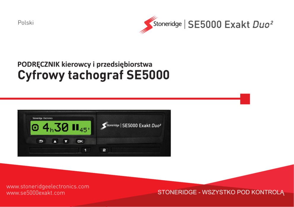 Polski PODRĘCZNIK kierowcy i przedsiębiorstwa Cyfrowy tachograf SE5000 www.stoneridgeelectronics.com www.se5000exakt.com STONERIDGE - WSZYSTKO POD KONTROLĄ Witaj Witaj Dziękujemy za wybranie cyfrowego tachografu SE5000 w wer. 7.5 firmy Stoneridge. Firma Stoneridge stawia sobie za cel ułatwienie życia kierowcom i właścicielom flot. Z tą myślą zaprojektowano tachograf SE5000, obsługujący takie funkcje, jak proste opcje w menu, szybkie pobieranie danych i możliwość zdalnego pobierania. O niniejszym podręczniku Niniejszy podręcznik ma na celu umożliwienie zapoznania się z zasadami obsługi tachografu (zespół pojazdu, VU) i wykorzystanie pełni jego możliwości. Podręcznik przeznaczony jest zarówno dla kierowców, jak i dla przedsiębiorstw posiadających flotę pojazdów, w których zainstalowano tachograf. Podręcznik składa się z trzech części: l l Część dla kierowcy zawiera informacje przeznaczone dla kierowcy. Część dla firmy zawiera informacje przeznaczone dla przedsiębiorstwa będącego właścicielem pojazdu. l Część referencyjna zawiera dodatkowe informacje referencyjne. Zalecamy, aby wszyscy użytkownicy zapoznali się na początku z Częścią dla kierowcy. Zawiera ona bowiem informacje wystarczające do rozpoczęcia użytkowania tachografu. Właściciele firm muszą dodatkowo przeczytać Część dla firmy, aby poznać zakres swoich obowiązków. W Części referencyjnej znajdują się szczegółowe informacje, które mogą się przydać podczas używania tachografu. Zmiany Firma Stoneridge Electronics zastrzega sobie prawo do wprowadzenia w dowolnym czasie zmian konstrukcyjnych, wyposażenia i właściwości technicznych urządzenia. Dlatego też dane, ilustracje i opisy zawarte w niniejszym Podręczniku nie stanowią podstawy do jakichkolwiek roszczeń. certyfikowanego Podręcznika 102019P/14R04. Dostosowano go do potrzeb naszych klientów. Wersja certyfikowana jest dostępna na naszej stronie internetowej. www.stoneridgeelectronics.com Prawa autorskie Przedruk, tłumaczenie lub inne odtwarzanie niniejszego podręcznika — w całości lub w częściach — bez uzyskania pisemnej zgody firmy Stoneridge Electronics AB, jest zabronione. Bezpieczeństwo obsługi Ryzyko wypadku! Obsługiwać tachograf wyłącznie podczas postoju pojazdu. Obsługa tachografu w czasie jazdy powoduje odwrócenie uwagi od ruchu drogowego i może być przyczyną wypadku. Informacje w Internecie Certyfikowany podręcznik Niniejszy podręcznik stanowi wersję rozszerzoną Więcej informacji o cyfrowym tachografie SE5000 firmy Stoneridge oraz o firmie Stoneridge Electronics Ltd można znaleźć na stronie: www.stoneridgeelectronics.com 1 Witaj Nie otwierać obudowy Etykieta plombująca może wyglądać w ten sposób. Tachograf został zamontowany przez autoryzowany personel. Nigdy nie wolno otwierać obudowy tachografu. Wszelkie manipulacje i modyfikacje systemu tachografu są zabronione. Wewnątrz obudowy drukarki została umieszczona etykieta plombująca. Etykieta plombująca nie może być rozerwana. Poniżej pokazano, gdzie znajduje się etykieta plombująca oraz jak wygląda, gdy nie jest rozerwana. Inne dokumenty Oprócz niniejszego Podręcznika kierowcy i przedsiębiorstwa istnieje szereg innych dokumentów, które zawierają informacje na temat tachografu. l Uwaga! Nieupoważnione osoby, modyfikujące to urządzenie, dopuszczają się czynu karalnego, w wymiarze zależnym od prawa obowiązującego na terenie danego kraju. l l l 2 Skrócony przewodnik dla kierowcy zawiera szybkie informacje dla kierowcy dotyczące obsługi tachografu. Skrócony przewodnik dla przedsiębiorstwa zawiera podsumowanie informacji dotyczących używania tachografu przeznaczonych dla właściciela floty. Podręcznik dla warsztatu zawiera informacje dla certyfikowanych warsztatów specjalizujących się w serwisowaniu cyfrowych tachografów. Te informacje są przekazywane wyłącznie warsztatom kwalifikowanym przez program szkoleniowy firmy Stoneridge. Podręcznik kontroli zawiera informacje dla podmiotów kontrolujących, dotyczące sposobu kontroli tachografu i kierowców. Spis treści Spis treści Witaj 1 O niniejszym podręczniku 1 Zmiany 1 Prawa autorskie 1 Bezpieczeństwo obsługi 1 Informacje w Internecie 1 Nie otwierać obudowy 2 Inne dokumenty 2 Spis treści 3 Część dla kierowcy 7 Tachograf SE5000 8 Tacki kart 8 Panel drukarki 8 Przyciski 9 Wyświetlacz 9 Czujnik ruchu 9 Integracja z tablicą wskaźników 9 Różne widoki wyświetlacza 10 Widoki wyświetlacza przy DDS WŁ. 10 Widok wyświetlacza przy DDS WYŁ. Ekran domyślny 11 Bieżąca prędkość 11 Wybór czynności 21 Pozostały czas jazdy 11 Pozostały czas odpoczynku 12 Dyrektywa ws. organizacji czasu pracy (WTD) 21 Kierowca 1 i Kierowca 2 12 DDS w scenariuszach kierowcy 21 Data i czas UTC 12 Rozpoczęcie jazdy z DDS Lokalna data i godzina 13 Pozostały czas jazdy Prom/Pociąg 13 Czas pracy 13 Ostrzeżenie i ostrzeżenie wstępne 21 22 22 23 Odpoczynek 23 Menu 14 Jak przebiega rejestrowanie czynności? Na koniec dnia 23 14 Tygodniowe ograniczenie czasu jazdy 24 14 15 Ograniczenie czasu w kalendarzu 24 15 Scenariusz Prom/Pociąg 24 Czynności rejestrowane ręcznie Przed rozpoczęciem jazdy Wkładanie karty Na koniec dnia Wyjmowanie karty kierowcy 17 17 Dane przechowywane na karcie 17 Dwa scenariusze kierowcy 17 Miejsca rozpoczęcia i zakończenia 18 Podczas wkładania karty Wpisy wprowadzane ręcznie 10 Usuwanie wszystkich wpisów Zmienianie ręcznego wpisu 18 18 20 Aktywuj stan Prom/Pociąg. Jazda poza zakresem 25 25 Więcej informacji na temat pozostałego czasu jazdy 25 Obliczenia i ograniczenia DDS 26 Okres dostępności (POA) 26 W obliczeniach DDS 26 W obliczeniach WTD 26 3 Spis treści Menu INFO Dostęp do MENU INFO 27 27 Czas w kalendarzu pozostały do odpoczynku 28 Łączny czas jazdy kierowcy 1/2 28 Czasu do pobrania i kalibracji28 Wersja 29 Blokada przeds. włączona 29 Ustawienia kierowcy Uszkodzona, zagubi