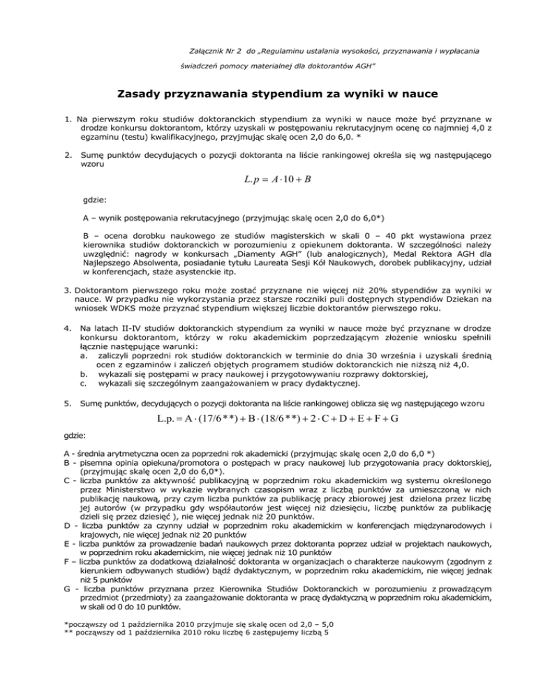 Załącznik Nr 2 do „Regulaminu ustalania wysokości, przyznawania i wypłacania świadczeń pomocy materialnej dla doktorantów AGH” Zasady przyznawania stypendium za wyniki w nauce 1. Na pierwszym roku studiów doktoranckich stypendium za wyniki w nauce może być przyznane w drodze konkursu doktorantom, którzy uzyskali w postępowaniu rekrutacyjnym ocenę co najmniej 4,0 z egzaminu (testu) kwalifikacyjnego, przyjmując skalę ocen 2,0 do 6,0. * 2. Sumę punktów decydujących o pozycji doktoranta na liście rankingowej określa się wg następującego wzoru L. p = A ⋅ 10 + B gdzie: A – wynik postępowania rekrutacyjnego (przyjmując skalę ocen 2,0 do 6,0*) B – ocena dorobku naukowego ze studiów magisterskich w skali 0 – 40 pkt wystawiona przez kierownika studiów doktoranckich w porozumieniu z opiekunem doktoranta. W szczególności należy uwzględnić: nagrody w konkursach „Diamenty AGH” (lub analogicznych), Medal Rektora AGH dla Najlepszego Absolwenta, posiadanie tytułu Laureata Sesji Kół Naukowych, dorobek publikacyjny, udział w konferencjach, staże asystenckie itp. 3. Doktorantom pierwszego roku może zostać przyznane nie więcej niż 20% stypendiów za wyniki w nauce. W przypadku nie wykorzystania przez starsze roczniki puli dostępnych stypendiów Dziekan na wniosek WDKS może przyznać stypendium większej liczbie doktorantów pierwszego roku. 4. Na latach II-IV studiów doktoranckich stypendium za wyniki w nauce może być przyznane w drodze konkursu doktorantom, którzy w roku akademickim poprzedzającym złożenie wniosku spełnili łącznie następujące warunki: a. zaliczyli poprzedni rok studiów doktoranckich w terminie do dnia 30 września i uzyskali średnią ocen z egzaminów i zaliczeń objętych programem studiów doktoranckich nie niższą niż 4,0. b. wykazali się postępami w pracy naukowej i przygotowywaniu rozprawy doktorskiej, c. wykazali się szczególnym zaangażowaniem w pracy dydaktycznej. 5. Sumę punktów, decydujących o pozycji doktoranta na liście rankingowej oblicza się wg następującego wzoru L.p. = A ⋅ (17/6 * *) + B ⋅ (18/6 * *) + 2 ⋅ C + D + E + F + G gdzie: A - średnia arytmetyczna ocen za poprzedni rok akademicki (przyjmując skalę ocen 2,0 do 6,0 *) B - pisemna opinia opiekuna/promotora o postępach w pracy naukowej lub przygotowania pracy doktorskiej, (przyjmując skalę ocen 2,0 do 6,0*). C - liczba punktów za aktywność publikacyjną w poprzednim roku akademickim wg systemu określonego przez Ministerstwo w wykazie wybranych czasopism wraz z liczbą punktów za umieszczoną w nich publikację naukową, przy czym liczba punktów za publikację pracy zbiorowej jest dzielona przez liczbę jej autorów (w przypadku gdy współautorów jest więcej niż dziesięciu, liczbę punktów za publikację dzieli się przez dziesięć ), nie więcej jednak niż 20 punktów. D - liczba punktów za czynny udział w poprzednim roku akademickim w konferencjach międzynarodowych i krajowych, nie więcej jednak niż 20 punktów E - liczba punktów za prowadzenie badań naukowych przez doktoranta poprzez udział w projektach naukowych, w poprzednim roku akademickim, nie więcej jednak niż 10 punktów F – liczba punktów za dodatkową działalność doktoranta w organizacjach o charakterze naukowym (zgodnym z kierunkiem odbywanych studiów) bądź dydaktycznym, w poprzednim roku akademickim, nie więcej jednak niż 5 punktów G - liczba punktów przyznana przez Kierownika Studiów Doktoranckich w porozumieniu z prowadzącym przedmiot (przedmioty) za zaangażowanie doktoranta w pracę dydaktyczną w poprzednim roku akademickim, w skali od 0 do 10 punktów. *począwszy od 1 października 2010 przyjmuje się skalę ocen od 2,0 – 5,0 ** począwszy od 1 października 2010 roku liczbę 6 zastępujemy liczbą 5