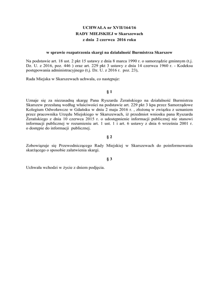 UCHWAŁA nr XVII/164/16 RADY MIEJSKIEJ w Skarszewach z dnia 2 czerwca 2016 roku w sprawie rozpatrzenia skargi na działalność Burmistrza Skarszew Na podstawie art. 18 ust. 2 pkt 15 ustawy z dnia 8 marca 1990 r. o samorządzie gminnym (t.j. Dz. U. z 2016, poz. 446 ) oraz art. 229 pkt 3 ustawy z dnia 14 czerwca 1960 r. - Kodeksu postępowania administracyjnego (t.j. Dz. U. z 2016 r. poz. 23), Rada Miejska w Skarszewach uchwala, co następuje: §1 Uznaje się za niezasadną skargę Pana Ryszarda Żerańskiego na działalność Burmistrza Skarszew przesłaną według właściwości na podstawie art. 229 pkt 3 kpa przez Samorządowe Kolegium Odwoławcze w Gdańsku w dniu 2 maja 2016 r. , złożoną w związku z uznaniem przez pracownika Urzędu Miejskiego w Skarszewach, iż przedmiot wniosku pana Ryszarda Żerańskiego z dnia 10 czerwca 2015 r. o udostępnienie informacji publicznej nie stanowi informacji publicznej w rozumieniu art. 1 ust. 1 i art. 6 ustawy z dnia 6 września 2001 r. o dostępie do informacji publicznej. §2 Zobowiązuje się Przewodniczącego Rady Miejskiej w Skarszewach do poinformowania skarżącego o sposobie załatwienia skargi. §3 Uchwała wchodzi w życie z dniem podjęcia. Uzasadnienie W dniu 11 czerwca 2015 r. pan Ryszard Żerański podający także jako wnioskodawcę obok swojego nazwiska tytuł „Kurier Skarszew” ; złożył w Urzędzie Miejskim w Skarszewach wniosek z 10 czerwca 2015r. o udostępnienie informacji publicznej w następującym zakresie „ na jakiej podstawie prawnej naczelnik WGIiOŚ Ryszard Muchowski odmówił panu Bielińskiemu włączenia deszczówki z nieruchomości położonej w Bączku do istniejącej instalacji deszczowej na drodze gminnej, jednocześnie nasyłając kontrolę Powiatowego Inspektora Nadzoru Budowlanego”. W dniu 16 czerwca 2015r.pan Żerański otrzymał odpowiedź iż żądana informacja nie stanowi informacji publicznej oraz że wniosek nie znajduje podstaw w przepisach prawa. W dniu 4 marca 2016r. do SKO w Gdańsku pan Żerański złożył podanie z dnia 19 lutego w którym żądał wszczęcia postępowania administracyjnego w stosunku do pracownika Urzędu Miejskiego w związku z nie udzieleniem informacji publicznej dotyczącej odmowy włączenia instalacji deszczowej w Bączku. Na żądanie SKO pan Żerański sprecyzował, że wniesione przez niego podanie należy potraktować jako skargę na działanie Urzędu Miejskiego w Skarszewach. Po zapoznaniu się z treścią otrzymanych materiałów, SKO uznało się za niewłaściwe do załatwienia sprawy i zgodnie z art.229, pkt 3 Kpa przesłało ją do rozpatrzenia przez Radę Miejską jako skargę na działalność Burmistrza. Odnosząc się do działań Urzędu w powyższej sprawie należy zaznaczyć że merytorycznie dotyczy ona pana Jarosława Bielińskiego, który decyzją nr WGIiOŚ/7332/27/06 z dnia 7 lipca 2006 r. uzyskał ustalenie warunków zabudowy zamierzenia inwestycyjnego dotyczącego budowy domu jednorodzinnego z garażem wolnostojącym na działce nr 53 w miejscowości Bączek, gmina Skarszewy. Decyzja w pkt 3 „b” dotyczącym uzbrojenia terenu zawiera dyspozycję „odprowadzenie wód opadowych powierzchniowo do gruntu na terenie własnej działki”. Należy zaznaczyć, że na terenie Bączka brak kanalizacji deszczowej. Decyzja jest prawomocna, nie wniesiono od niej odwołania . Pan Ryszard Żerański, żądając informacji dotyczącej podstawy prawnej działań Urzędu wobec pana Jarosława Bielińskiego, nie wystąpił o udzielenie informacji publicznej, gdyż żądana informacja nie jest informacją publiczną. Wyrok NSA W Warszawie, ( 1 OSK 1500/12/Lex nr 1233161) określa, iż „żądanie informacji o zastosowanych przepisach prawa w indywidualnej sprawie nie mieści się w kategorii informacji publicznej”. W związku z powyższym, odpowiedź udzielona niezwłocznie, w dniu 16 czerwca, stanowi prawidłowe, zgodne z prawem działanie urzędnika w przypadku wniosku formalnego o udzielenie informacji publicznej, która taką informację publiczną w myśl przepisów ustawy nie jest. Biorąc pod uwagę powyższe, skargę na działalność Burmistrza należy uznać za niezasadną.