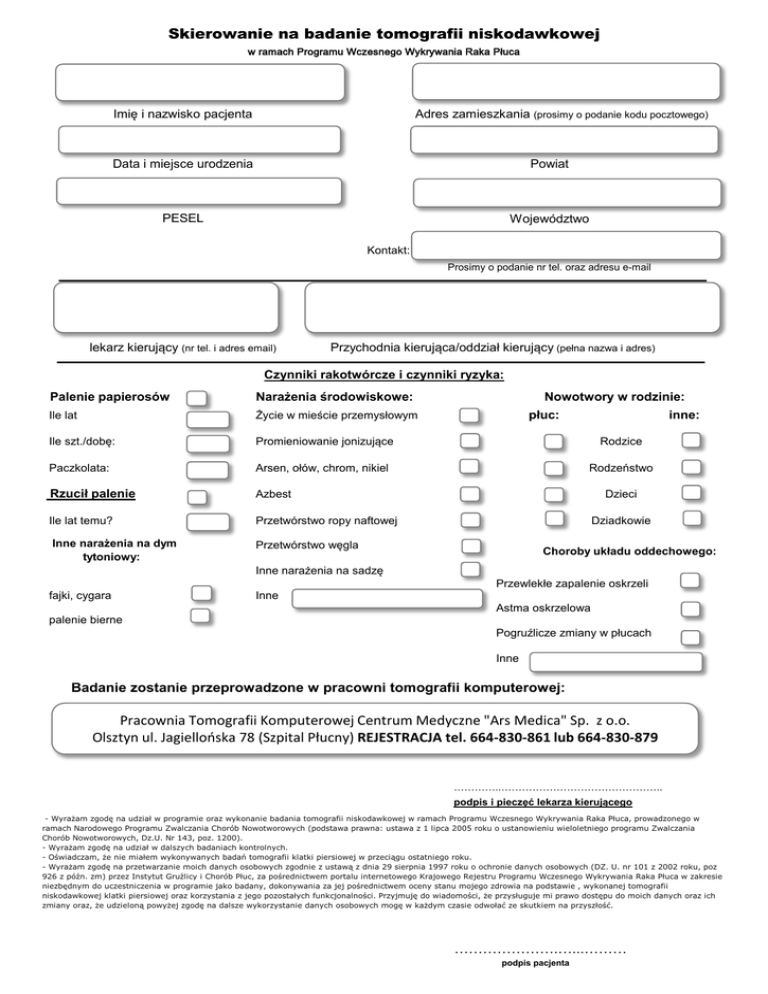 Skierowanie na badanie tomografii niskodawkowej w ramach Programu Wczesnego Wykrywania Raka Płuca Imię i nazwisko pacjenta Adres zamieszkania (prosimy o podanie kodu pocztowego) Data i miejsce urodzenia Powiat PESEL Województwo Kontakt: Prosimy o podanie nr tel. oraz adresu e-mail lekarz kierujący (nr tel. i adres email) Przychodnia kierująca/oddział kierujący (pełna nazwa i adres) Czynniki rakotwórcze i czynniki ryzyka: Palenie papierosów Narażenia środowiskowe: Ile lat Życie w mieście przemysłowym Ile szt./dobę: Promieniowanie jonizujące Rodzice Paczkolata: Arsen, ołów, chrom, nikiel Rodzeństwo Rzucił palenie Azbest Ile lat temu? Przetwórstwo ropy naftowej Inne narażenia na dym tytoniowy: Przetwórstwo węgla Nowotwory w rodzinie: płuc: inne: Dzieci Dziadkowie Choroby układu oddechowego: Inne narażenia na sadzę Przewlekłe zapalenie oskrzeli fajki, cygara Inne Astma oskrzelowa palenie bierne Pogruźlicze zmiany w płucach Inne Badanie zostanie przeprowadzone w pracowni tomografii komputerowej: Pracownia Tomografii Komputerowej Centrum Medyczne "Ars Medica" Sp. z o.o. Olsztyn ul. Jagiellońska 78 (Szpital Płucny) REJESTRACJA tel. 664-830-861 lub 664-830-879 …………..……………………………………….. podpis i pieczęć lekarza kierującego - Wyrażam zgodę na udział w programie oraz wykonanie badania tomografii niskodawkowej w ramach Programu Wczesnego Wykrywania Raka Płuca, prowadzonego w ramach Narodowego Programu Zwalczania Chorób Nowotworowych (podstawa prawna: ustawa z 1 lipca 2005 roku o ustanowieniu wieloletniego programu Zwalczania Chorób Nowotworowych, Dz.U. Nr 143, poz. 1200). - Wyrażam zgodę na udział w dalszych badaniach kontrolnych. - Oświadczam, że nie miałem wykonywanych badań tomografii klatki piersiowej w przeciągu ostatniego roku. - Wyrażam zgodę na przetwarzanie moich danych osobowych zgodnie z ustawą z dnia 29 sierpnia 1997 roku o ochronie danych osobowych (DZ. U. nr 101 z 2002 roku, poz 926 z późn. zm) przez Instytut Gruźlicy i Chorób Płuc, za pośrednictwem portalu internetowego Krajowego Rejestru Programu Wczesnego Wykrywania Raka Płuca w zakresie niezbędnym do uczestniczenia w programie jako badany, dokonywania za jej pośrednictwem oceny stanu mojego zdrowia na podstawie , wykonanej tomografii niskodawkowej klatki piersiowej oraz korzystania z jego pozostałych funkcjonalności. Przyjmuję do wiadomości, że przysługuje mi prawo dostępu do moich danych oraz ich zmiany oraz, że udzieloną powyżej zgodę na dalsze wykorzystanie danych osobowych mogę w każdym czasie odwołać ze skutkiem na przyszłość. ………………….…...……… podpis pacjenta