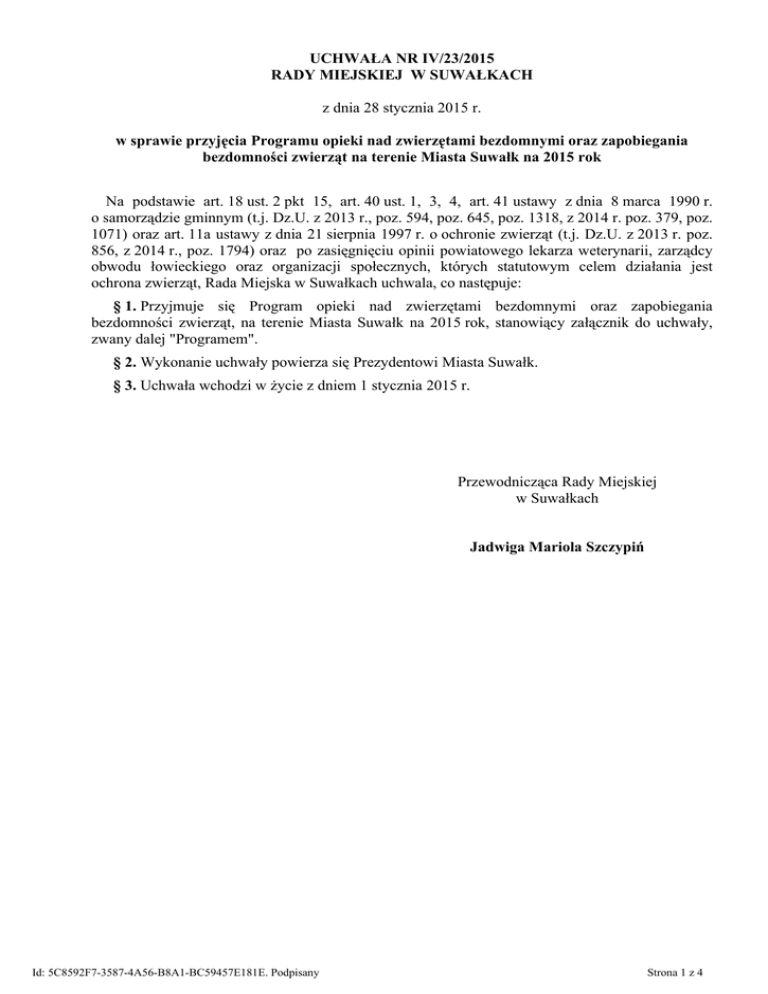 UCHWAŁA NR IV/23/2015 RADY MIEJSKIEJ W SUWAŁKACH z dnia 28 stycznia 2015 r. w sprawie przyjęcia Programu opieki nad zwierzętami bezdomnymi oraz zapobiegania bezdomności zwierząt na terenie Miasta Suwałk na 2015 rok Na podstawie art. 18 ust. 2 pkt 15, art. 40 ust. 1, 3, 4, art. 41 ustawy z dnia 8 marca 1990 r. o samorządzie gminnym (t.j. Dz.U. z 2013 r., poz. 594, poz. 645, poz. 1318, z 2014 r. poz. 379, poz. 1071) oraz art. 11a ustawy z dnia 21 sierpnia 1997 r. o ochronie zwierząt (t.j. Dz.U. z 2013 r. poz. 856, z 2014 r., poz. 1794) oraz po zasięgnięciu opinii powiatowego lekarza weterynarii, zarządcy obwodu łowieckiego oraz organizacji społecznych, których statutowym celem działania jest ochrona zwierząt, Rada Miejska w Suwałkach uchwala, co następuje: § 1. Przyjmuje się Program opieki nad zwierzętami bezdomnymi oraz zapobiegania bezdomności zwierząt, na terenie Miasta Suwałk na 2015 rok, stanowiący załącznik do uchwały, zwany dalej "Programem". § 2. Wykonanie uchwały powierza się Prezydentowi Miasta Suwałk. § 3. Uchwała wchodzi w życie z dniem 1 stycznia 2015 r. Przewodnicząca Rady Miejskiej w Suwałkach Jadwiga Mariola Szczypiń Id: 5C8592F7-3587-4A56-B8A1-BC59457E181E. Podpisany Strona 1 z 4 Załącznik do Uchwały Nr IV/23/2015 Rady Miejskiej w Suwałkach z dnia 28 stycznia 2015 r. Program opieki nad zwierzętami bezdomnymi oraz zapobiegania bezdomności zwierząt na terenie Miasta Suwałk na 2015 r. Rozdział 1. Cele oraz wykonawcy Programu § 1. Celem Programu jest zapewnienie opieki nad zwierzętami bezdomnymi oraz zapobieganie bezdomności zwierząt na terenie Miasta Suwałk. § 2. Wykonawcami Programu są: 1) Urząd Miejski w Suwałkach; 2) organizacje społeczne, których statutowym celem działania jest ochrona zwierząt; 3) Straż Miejska w Suwałkach oraz Policja; 4) Hodowla PsówRasowych- Schronisko „Sianożęć” Bogdan Lauryn, zwana dalej Schroniskiem. Rozdział 2. Zapobieganie bezdomności zwierząt § 3. 1. W celu zapobiegania bezdomności psów prowadzone będą następujące działania: 1) wyłapywanie bezdomnych psów; 2) zmniejszanie populacji bezdomnych psów poprzez: a) wsparcie sterylizacji i kastracji psów przez ich posiadaczy, b) sterylizację i kastrację psów przebywających w Schronisku, c) usypianie ślepych miotów, 3) edukacja mieszkańców w zakresie odpowiedzialnego i humanitarnego traktowania psów; 4) propagowanie trwałego znakowania. 2. 1) Działania określone w ust. 1 pkt 1 oraz pkt 2 lit. b i lit.c realizowane są w oparciu o środki budżetu Miasta Suwałk. 2) Działania określone w ust. 1 pkt 2 lit.a realizowane są w oparciu o środki budżetu Miasta Suwałk oraz właścicieli psów. 3) Edukacja mieszkańców w zakresie humanitarnego traktowania psów realizowana jest ze środków budżetu miasta przy udziale podmiotów, których statutowym celem działania jest ochrona zwierząt oraz Schroniska. 3. Realizację działań określonych w ust. 1 pkt 2 lit. b i lit.c powierza się Schronisku. 4. Wyłapywanie bezdomnych psów prowadzi na zgłoszenie Straży Miejskiej, Policji lub Wydziału Ochrony Środowiska i Gospodarki Komunalnej Urzędu Miejskiego w Suwałkach Schronisko. 5. Mieszkańcy mogą dostarczyć ślepy miot do Schroniska w celu nieodpłatnego uśpienia. Id: 5C8592F7-3587-4A56-B8A1-BC59457E181E. Podpisany Strona 2 z 4 6. Wsparcie sterylizacji i kastracji, o której mowa w ust. 1 pkt 2 lit. a, przybiera formę dofinansowania z budżetu Miasta, w wysokości 50% kosztu sterylizacji lub kastracji psa przez weterynarza wyłonionego przez Miasto Suwałki w drodze przetargu, pod warunkiem że pies jest trwale oznakowany lub zostanie oznakowany poprzez wszczepienie mikroczipa w połączeniu z wykonaną sterylizacją lub kastracją (na koszt właściciela psa). 7. Propagowanie trwałego znakowania psów, o którym mowa w ust. 1 pkt. 4, polega na uzależnieniu dofinansowania sterylizacji lub kastracji psów od faktu ich trwałego oznakowania. Znakowane są również psy poddane adopcji ze schroniska. § 4. 1. W celu ograniczania populacji kotów bezdomnych i wolno żyjących prowadzone będą następujące działania: 1) sterylizacja i kastracja kotów bezdomnych i wolno żyjących (po zabiegu i rekonwalescencji oraz trwałym znakowaniu koty wolno żyjące wrócą do miejsc, z których zostały odłowione); 2) usypianie ślepych miotów; 3) edukacja mieszkańców w zakresie odpowiedzialnego i humanitarnego traktowania kotów. 2. 1) Działania określone w ust. 1 pkt 1 i 2 realizowane są w oparciu o środki budżetu Miasta Suwałk, przez podmiot wyłoniony przez Miasto Suwałki. 2) Edukacja mieszkańców w zakresie humanitarnego traktowania kotów realizowana jest ze środków budżetu miasta przy udziale podmiotów, których statutowym celem działania jest ochrona zwierząt. 3. Mieszkańcy mogą dostarczyć ślepy miot kotów do podmiotu wyłonionego przez Miasto Suwałki celem jego nieodpłatnego uśpienia. § 5. W celu zapobiegania bezdomności zwierząt innych niż psy i koty prowadzone będzie ich wyłapywanie i zapewnianie im opieki. § 6. Wyłapywanie bezdomnych zwierząt na obszarze Miasta Suwałk ma charakter stały. § 7. 1. Zwierzę bezdomne, umieszczone w schronisku w wyniku jego odłowienia, powinno być odebrane przez właściciela w terminie do 14 dni od dnia jego przyjęcia przez Schronisko, po udokumentowaniu przez właściciela prawa do tego zwierzęcia i posiadania wymaganych szczepień. 2. W przypadku niemożności ustalenia właściciela, zwierzę może zostać skierowane do adopcji po upływie 14 dni od dnia jego przyjęcia przez Schronisko. Rozdział 3. Zapewnienie opieki bezdomnym zwierzętom § 8. 1. Zapewnienie opieki bezdomnym psom i kotom polega na: 1) umieszczaniu wyłapanych zwierząt w Schronisku , 2) szukaniu dla nich właścicieli. 2. Wsparcie przez Miasto Suwałki adopcji bezdomnych zwierząt ze schroniska odbywa się poprzez działania edukacyjne. § 9. Zapewnianie o
