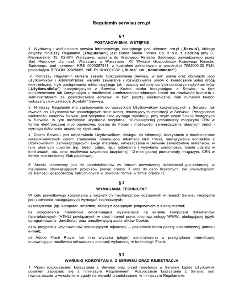 Regulamin serwisu crn.pl §1 POSTANOWIENIA WSTĘPNE 1. Wydawcą i właścicielem serwisu internetowego, dostępnego pod adresem crn.pl („Serwis”), którego dotyczy niniejszy Regulamin („Regulamin”) jest Burda Media Polska Sp. z o.o. z siedzibą przy ul. Marynarskiej 15, 02-674 Warszawa, wpisana do Krajowego Rejestru Sądowego prowadzonego przez Sąd Rejonowy dla m.st. Warszawy w Warszawie, XIII Wydział Gospodarczy Krajowego Rejestru Sądowego, pod numerem KRS 0000257211, z kapitałem zakładowym w wysokości 7062000,00 PLN, posiadająca REGON 02029065, NIP PL1010001332 („Burda” lub „Administrator”). 2. Poniższy Regulamin określa zasady funkcjonowania Serwisu, w tym prawa oraz obowiązki jego użytkowników i Administratora, warunki zawierania i rozwiązywania umów o świadc zenie usług drogą elektroniczną, tryb postępowania reklamacyjnego jak i zasady ochrony danych osobowych użytkowników („Użytkowników”) korzystających z Serwisu. Każda osoba korzystająca z Serwisu, w tym zainteresowana lub korzystająca z możliwości zamieszczania własnych treści ma możliwość kontaktu z Administratorem za pośrednictwem adresów, w tym poczty elektronicznej i/lub numerów telefon wskazanych w zakładce „Kontakt” Serwisu. 3. Niniejszy Regulamin ma zastosowanie do wszystkich Użytkowników korzystający ch z Serwisu, jak również do Użytkowników posiadających stałe konto, dokonujących rejestracji w Serwis ie. Przeglądanie większości zasobów Serwisu jest bezpłatne i nie wymaga rejestracji, przy czym część funkcji dostępnych w Serwisie, w tym możliwość uzyskania bezpłatnej, 12-miesięcznej prenumeraty magazynu CRN w formie elektronicznej i/lub papierowej, dostęp do Forum i możliwości zamieszczania własnych treści wymaga dokonania uprzedniej rejestracji. 4. Celem Serwisu jest umożliwienie Użytkownikom dostępu do informacji, korzystania z mechanizmów wyszukiwawczych celem znalezienia interesującej informacji i/lub treści, nawiązywania kontaktów z Użytkownikami zamieszczającymi swoje materiały, umieszczania w Serwisie samodzielnie materiałów, w tym własnych utworów (np. treści, zdjęć, itp.), odbierania i wysyłania wiadomości, branie udziału w konkursach, etc. oraz możliwość uzyskania bezpłatnej, 12-miesięcznej prenumeraty magazynu CRN w formie elektronicznej i/lub papierowej. 5. Serwis skierowany jest do przedsiębiorców (w ramach prowadzonej działalności gospodarczej, w rozumieniu obowiązujących przepisów prawa) branży IT oraz do osób fizycznych, nie prowadzących działalności gospodarczej zatrudnionych w dowolnej formie w firmie branży IT. §2 WYMAGANIA TECHNICZNE W celu prawidłowego korzystania z wszystkich mechanizmów dostępnych w ramach Serwisu niezbędne jest spełnienie następujących wymagań technicznych: a) urządzenie (np. komputer, smartfon, tablet) z dostępnym połączeniem z siecią Internet; b) przeglądarka internetowa umożliwiająca wyświetlanie na ekranie komputera dokumentów hipertekstowych (HTML) powiązanych w sieci Internet przez sieciową usługę WWW, obsługującej język oprogramowania JavaScript oraz umożliwiającą zapis plików Cookie; c) w przypadku Użytkowników dokonujących rejestracji – posiadanie konta poczty elektronicznej (adresu e-mail); d) Adobe Flash Player lub inna wtyczka (plugin) zainstalowana w przeglądarce internetowej zapewniająca możliwość odtwarzania animacji wykonanej w technologii Flash; §3 WARUNKI KORZYSTANI A Z SERWISU ORAZ REJESTRACJA 1. Przed rozpoczęciem korzystania z Serwisu oraz przed rejestracją w Serwisie każdy Użytkownik powinien zapoznać się z niniejszym Regulaminem. Rozpoczęcie korzystania z Serwisu jest równoznaczne z wyrażeniem zgody na warunki przedstawione w niniejszym Regulaminie. 2. Dostęp do Serwisu i możliwość zapoznawania się z większością jego zawartości (poza wyraźnie zastrzeżonymi dla zarejestrowanych Użytkowników, w tym możliwością zamieszczania własnych treści) posiadają wszyscy Użytkownicy sieci Internet bez konieczności spełnienia jakichkolwiek formalności, w szczególności dostęp ten nie jest uzależniony od dokonania przez Użytkownika rejestracji w ramach Serwisu. 3. Część wyodrębnionych zasobów Serwisu, w tym możliwość zamieszczania własnych ogłoszeń („Treści”) są dostępne wyłącznie dla tych Użytkowników Serwisu, którzy dokonają rejestracji w ramach Serwisu – stosownie do publikowanych w Serwisie zasad rejestracji oraz na warunkach okreś lonych w niniejszym Regulaminie. 4. Zarejestrowanymi Użytkownikami Serwisu mogą być wszystkie osoby fizyczne, posiadające pełną zdolność do czynności prawnych, które prowadzą działalność gospodarczą w branży IT lub są zatrudnione w branży IT oraz dokonały rejestracji i założyły własne konto w Serwisie. 5. Rejestracja w Serwisie jest bezpłatna. 6. Aby zarejestrować się w Serwisie należy wypełnić w sposób kompletny (co najmniej rubryki oznaczone jako obowiązkowe) i zgodny z prawdą oraz wysłać zgodnie z podanymi informacjami formularz rejestracyjny. Administrator nie kontroluje ani nie weryfikuje danych podanych przez Użytkowników zawartych w formularzu rejestracyjnym. Po wypełnieniu danych w formularzu rejestracyjnym na podany w nim adres e-mail zostanie wysłana wiadomość potwierdzająca dokonanie rejestracji oraz z loginem i hasłem Użytkownika. Wraz z dokonaniem rejestracji, Użytkownik akceptuje wszystkie postanowienia niniejszego Regulaminu oraz składa oświadczenie woli i wiedzy dotyczące znajomości treści Regulaminu oraz spełniania wszystkich określonych w Regulaminie wobec Użytkowników wymagań i warunków. Użytkownik oświadcza, że dane podawane przez niego podczas procesu rejestracji są prawdziwe. W szczególnie uzasadnionych sytuacjach mogących wzbudzać podejrzenie o podaniu nieprawdziwych danych, Administrator może uzależnić rejestrację Użytkownika