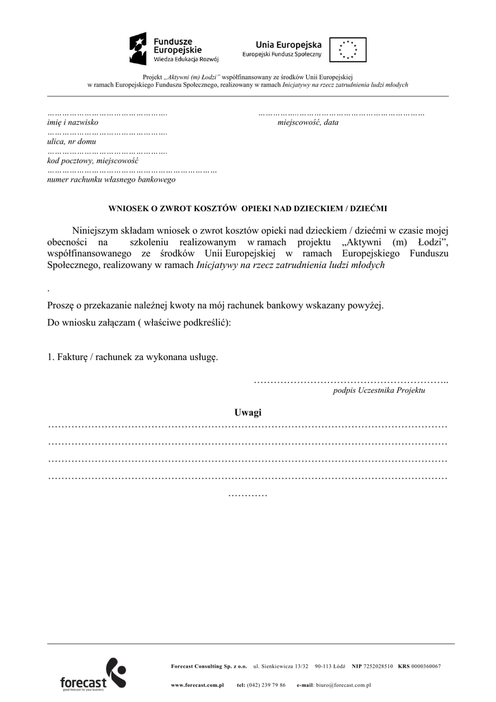 Projekt „Aktywni (m) Łodzi” współfinansowany ze środków Unii Europejskiej w ramach Europejskiego Funduszu Społecznego, realizowany w ramach Inicjatywy na rzecz zatrudnienia ludzi młodych …………………………………………. imię i nazwisko …………………………………………. ulica, nr domu …………………………………………. kod pocztowy, miejscowość …………………………………………………………… numer rachunku własnego bankowego ……………..…………………………………………… miejscowość, data WNIOSEK O ZWROT KOSZTÓW OPIEKI NAD DZIECKIEM / DZIEĆMI Niniejszym składam wniosek o zwrot kosztów opieki nad dzieckiem / dziećmi w czasie mojej obecności na szkoleniu realizowanym w ramach projektu „Aktywni (m) Łodzi”, współfinansowanego ze środków Unii Europejskiej w ramach Europejskiego Funduszu Społecznego, realizowany w ramach Inicjatywy na rzecz zatrudnienia ludzi młodych . Proszę o przekazanie należnej kwoty na mój rachunek bankowy wskazany powyżej. Do wniosku załączam ( właściwe podkreślić): 1. Fakturę / rachunek za wykonana usługę. ………………………………………………….. podpis Uczestnika Projektu Uwagi ………………………………………………………………………………………………………… ………………………………………………………………………………………………………… ………………………………………………………………………………………………………… ………………………………………………………………………………………………………… ………… Forecast Consulting Sp. z o.o. www.forecast.com.pl ul. Sienkiewicza 13/32 tel: (042) 239 79 86 90-113 Łódź NIP 7252028510 KRS 0000360067 e-mail: [email protected]