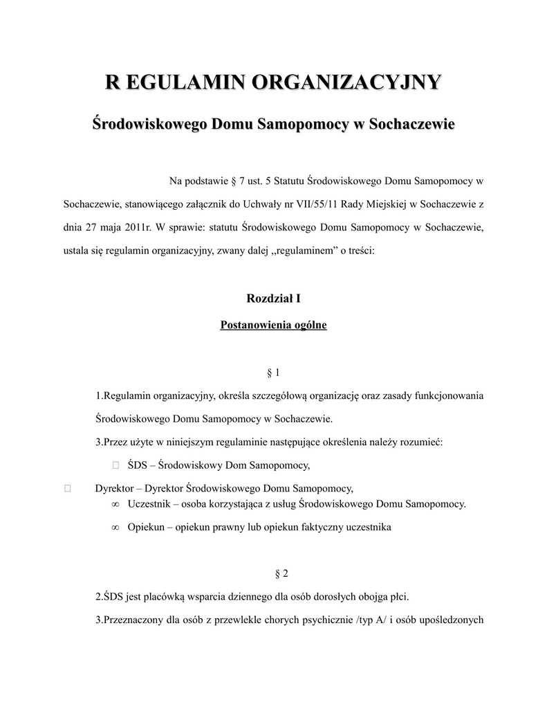 R EGULAMIN ORGANIZACYJNY Środowiskowego Domu Samopomocy w Sochaczewie Na podstawie § 7 ust. 5 Statutu Środowiskowego Domu Samopomocy w Sochaczewie, stanowiącego załącznik do Uchwały nr VII/55/11 Rady Miejskiej w Sochaczewie z dnia 27 maja 2011r. W sprawie: statutu Środowiskowego Domu Samopomocy w Sochaczewie, ustala się regulamin organizacyjny, zwany dalej ,,regulaminem” o treści: Rozdział I Postanowienia ogólne §1 1.Regulamin organizacyjny, określa szczegółową organizację oraz zasady funkcjonowania Środowiskowego Domu Samopomocy w Sochaczewie. 3.Przez użyte w niniejszym regulaminie następujące określenia należy rozumieć: ŚDS – Środowiskowy Dom Samopomocy, Dyrektor – Dyrektor Środowiskowego Domu Samopomocy, • Uczestnik – osoba korzystająca z usług Środowiskowego Domu Samopomocy. • Opiekun – opiekun prawny lub opiekun faktyczny uczestnika §2 2.ŚDS jest placówką wsparcia dziennego dla osób dorosłych obojga płci. 3.Przeznaczony dla osób z przewlekle chorych psychicznie /typ A/ i osób upośledzonych umysłowo /typ B/ 4.Siedzibą ŚDS jest nieruchomość będąca własnością Gminy Miasta Sochaczew mieszcząca się w Sochaczewie przy ul. Zamkowej 4A. 5.ŚDS kieruje i reprezentuje go na zewnątrz Dyrektor zatrudniony przez Burmistrza Miasta. 6.Dochodami ŚDS są wpływy uzyskane z: • dotacji celowych otrzymanych z budżetu państwa na realizację zadań bieżących z zakresu administracji rządowej realizowanych przez gminę, • dotacji organów samorządu terytorialnego, • darowizn osób prawnych i fizycznych, • innych dotacji celowych przekazywanych na realizację zadań wynikających z zawartych porozumień i umów 7.ŚDS swoje zadania realizuje w dni robocze w godz.: 8 00 – 16 00 8.Zajęcia z uczestnikami prowadzone są w godz: 8 00 - 1500 Rozdział II Cel i przedmiot działania §3 Celem Środowiskowego Domu Samopomocy jest: 1.Wsparcie i psychicznego. kompensowanie skutków niepełnosprawności w sferze zdrowia 2.Budowanie sieci oparcia społecznego dla osób upośledzonych umysłowo i osób przewlekle psychicznie chorych oraz członków ich rodzin. 3.Ochrona praw i interesów osób borykających się z problemami niepełnosprawności intelektualnej i sprawności psychicznej, zapobieganie ich dyskryminacji i marginalizacji. 4.Integracja osób korzystających ze wsparcia w ŚDS ze środowiskiem lokalnym. 5.Kształtowanie akceptującej postawy otoczenia rodzinnego i społecznego. §4 Do podstawowych zadań Środowiskowego Domu Samopomocy należy: 1. Świadczenie usług w ramach indywidualnych lub zespołowych treningów umiejętności społecznych polegających na: • Kształtowaniu motywacji do akceptowanych przez otoczenie zachowań. • Kształtowaniu nawyków celowej aktywności. • Kształtowaniu akceptowanych zachowań społecznych. • Nauce, rozwijaniu i podtrzymywaniu umiejętności niezbędnych do samodzielnego funkcjonowania w życiu codziennym. • Prowadzeniu terapii zajęciowej odpowiedniej do typu schorzenia osób skierowanych. • Prowadzenie rehabilitacji i aktywizacji społecznej i zawodowej. • Zapewnienie spokoju, bezpieczeństwa i godnego traktowania na terenie ŚDS. • Wsparcie i pomoc w rozwiązywaniu problemów życiowych. • Odciążenie rodziny lub opiekunów od sprawowania całodobowej opieki nad osobą przewlekle chorą psychicznie lub upośledzoną umysłowo. 2. Umożliwienie uczestnikom spożywanie gorącego posiłku, przyznanego zgodnie z art.17 ust.1 pkt. 3 i 14 ustawy o pomocy społecznej, lub przygotowanego w ramach treningu kulinarnego. §5 Formy pracy terapeutycznej 1. Dyrektor i pracownicy merytoryczni stanowią zespół wspierająco- aktywizujacy. 2. Zespół opracowuje program działalności domu, plany pracy oraz indywidualne plany postępowania wspierająco-aktywizujące dla poszczególnych uczestników. 3. Zajęcia w domu organizowane są w grupach i indywidualnie. 4. Rodzaj i zakres zajęć uczestnika ustala się w indywidualnym planie postępowania wspierajaco-aktywizujacego w porozumieniu i za zgodą uczestnika, opiekuna faktycznego lub opiekuna prawnego / dot. osób ubezwłasnowolnionych / 5. Rodzaj i zakres zajęć w ramach indywidualnego planu postępowania wspierającoaktywizującego jest dostosowany do potrzeb i możliwości psychofizycznych uczestnika. 6. Plan postępowania wspierajaco-aktywizujący obejmuje: • treningi funkcjonowania w życiu codziennym, w tym: trening dbałości o wygląd zewnętrzny, trening nauki higieny, trening kulinarny, trening umiejętności praktycznych, trening gospodarowania własnymi środkami finansowymi; • treningi umiejętności interpersonalnych i rozwiazywania problemów, w tym: kształtowanie pozytywnych relacji uczestnika z osobami bliskimi, sąsiadami, z innymi osobami w czasie robienia zakupów, w środkach komunikacji publicznej, w urzędach, w instytucjach kultury; • treningi umiejętności spędzania czasu wolnego, w tym: rozwijania zainteresowań literaturą, audycjami radiowymi, telewizyjnymi, internetem, udział w spotkaniach towarzyskich i kulturalnych; • poradnictwo psychologiczne; • pomoc w załatwieniu spraw urzędowych; • pomoc w dostępie do niezbędnych świadczeń zdrowotnych, w tym uzgadnianie i pilnowanie terminów wizyt u lekarza, pomoc w zakupie leków, pomoc w dotarciu do jednostek ochrony zdrowia; • terapię ruchową w tym zajęcia sportowe, turystykę i rekreację; • niezbędną opiekę; • inne formy postępowania przygotowujace osobę do samodzielnego życia, uczestnictwa w warsztatach terapii zajęciowej lub podjęcia zatrudnienia, w tym w warunkach pracy chronionej; Rozdział III Organizacja wewnętrzna. §6 Dom zatrudnia odpowiednio do potrzeb, osoby posiadające wymagane kwalifikacje zawodowe tj. psychologa, pedagoga, pracownika socjalnego, instruktora terapii zajęciowej, asystenta osoby niepełnosprawnej i inne specjalistyczne odpowiadajace rodzajowi i zakresowi świadczonych usług. Praco