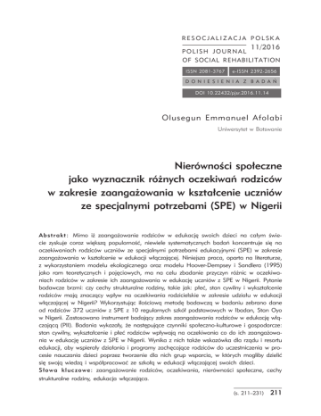 R E S O C J A L I Z A C J A P O L SK A POLISH JOURNAL 11/2016 OF SOCIAL REHABILITATION ISSN 2081-3767 e-ISSN 2392-2656 D O N I E S I E N I A Z B A D A Ń DOI 10.22432/pjsr.2016.11.14 Olusegun Emmanuel Afolabi Uniwersytet w Botswanie Nierówności społeczne jako wyznacznik różnych oczekiwań rodziców w zakresie zaangażowania w kształcenie uczniów ze specjalnymi potrzebami (SPE) w Nigerii Abstrakt: Mimo iż zaangażowanie rodziców w edukację swoich dzieci na całym świecie zyskuje coraz większą popularność, niewiele systematycznych badań koncentruje się na oczekiwaniach rodziców uczniów ze specjalnymi potrzebami edukacyjnymi (SPE) w zakresie zaangażowania w kształcenie w edukacji włączającej. Niniejsza praca, oparta na literaturze, z wykorzystaniem modelu ekologicznego oraz modelu Hoover-Dempsey i Sandlera (1995) jako ram teoretycznych i pojęciowych, ma na celu zbadanie przyczyn różnic w oczekiwaniach rodziców w zakresie ich zaangażowania w edukację uczniów z SPE w Nigerii. Pytanie badawcze brzmi: czy cechy strukturalne rodziny, takie jak: płeć, stan cywilny i wykształcenie rodziców mają znaczący wpływ na oczekiwania rodzicielskie w zakresie udziału w edukacji włączającej w Nigerii? Wykorzystując ilościową metodę badawczą w badaniu zebrano dane od rodziców 372 uczniów z SPE z 10 regularnych szkół podstawowych w Ibadan, Stan Oyo w Nigerii. Zastosowano instrument badający zakres zaangażowania rodziców w edukację włączającą (PII). Badania wykazały, że następujące czynniki społeczno-kulturowe i gospodarcze: stan cywilny, wykształcenie i płeć rodziców wpływają na oczekiwania co do ich zaangażowania w edukację uczniów z SPE w Nigerii. Wynika z nich także wskazówka dla rządu i resortu edukacji, aby wspierały działania i programy zachęcające rodziców do uczestniczenia w procesie nauczania dzieci poprzez tworzenie dla nich grup wsparcia, w których mogliby dzielić się swoją wiedzą i współpracować ze szkołą w edukacji włączającej swoich dzieci. Słowa kluczowe: zaangażowanie rodziców, oczekiwania, nierówności społeczne, cechy strukturalne rodziny, edukacja włączająca. (s. 211–231) 211 Olusegun Emmanuel Afolabi Wprowadzenie Badania w spójny i przekonujący sposób pokazują, że rodzice mają ogromny wpływ na naukę swoich dzieci. Jest tak również w przypadku rodziców uczniów ze specjalnymi potrzebami (SPE) (Afolabi i in. 2013; Gershoff i in. 2007). Ich opieka wpływa na osiąganie lepszych wyników w nauce przez dzieci (Afolabi 2014; Afolabi i in. 2015; Dahl, Lochner 2005; Hill, Taylor 2004). Pomimo powszechnego dostrzegania związku pomiędzy zaangażowaniem rodziców a szkolnymi wynikami dzieci, dotychczas brakowało spójnych ustaleń na temat różnic w oczekiwaniach rodziców w zakresie ich zaangażowania zarówno wśród wychowawców, badaczy, jak i samych rodziców (Gershoff i in. 2007), choć sama konieczność takich działań, zwłaszcza w procesie edukacji uczniów z SPE, nie jest przez nikogo kwestionowana (Levy, Kim, Olive 2006). Jak wynika z części literatury oraz z wyników badań dokonujących wielokontekstowej analizy zaangażowania rodziców (Bronfenbrenner 1979), poziom ich zainteresowania edukacją swoich dzieci zależy od środowiska społecznego, z którego pochodzą (Grothaus 2010). Potwierdziły to badaniach wskazujące na silny związek między czynnikami socjologicznymi a zaangażowaniem rodziców w nauczanie dzieci (Afolabi i in. 2015), wyjaśniające także to, dlaczego rodzice uczniów z SPE w niewielkim stopniu współuczestniczą w edukacji swoich dzieci (Armstrong i in. 2010; Leyser, Kirk 2011). Gdy rodzice są do tego zachęcani, mają większą wiedzę o procesach i programach nauczania (Hill, Taylor 2004), przekazują tę wiedzę dzieciom (Lareau 2000), bardziej doceniają osiągnięcia dzieci i organizują naukę wspierającą rozwój ich umiejętności (Grolnick, Slowiaczek 1994). Pozytywne efekty sprawiają, że rodzice chętniej pomagają budować podstawy przyszłego sukcesu dzieci (Grolnick, Slowiaczek 1994). Choć wiele międzynarodowych badań wskazuje, że zaangażowanie rodziców jest istotne w edukacji uczniów z SPE, zjawisko to jest ciągle nowością w krajach rozwijających się, takich jak Nigeria. Brak działań rządu i instytucji edukacyjnych w Nigerii, które zachęcałyby rodziców uczniów z SPE do pełnego uczestnictwa w edukacji swoich dzieci wpływa na niski poziom ich zaangażowania (Ajuwon 2008). Sukces edukacji włączającej w Nigerii zależy od poziomu zaangażowania i oczekiwań rodziców generowanych, ogólnie rzecz biorąc, przez interesariuszy sektora edukacyjnego (Ajuwon 2008). Uznawane jest to za inwestycje, które zwiększają udział rodziców w edukacji (Afolabi i in. 2013). W związku z tym konieczne jest systematyczne gromadzenie wiedzy w omawianym zakresie (Epstein 2009; Hoover-Dempsey, Walker, Sandler 2005; Davos-Kean, Sexton 2009). 212 (s. 211–231) Nierówności społeczne jako wyznacznik różnych oczekiwań rodziców... Charakterystyka badania i jego uzasadnienie Niniejsze badanie jest odpowiedzią na wiele powiązanych ze sobą zagadnień dotyczących oczekiwań rodziców w zakresie ich udziału w edukacji włączającej. Choć naukowcy od dawna już zwracali uwagę na znaczenie takiego zaangażowania (Afolabi i in. 2013; Afolabi 2014; Ferrara 2009; Gibson, Jefferson 2006), w krajach afrykańskich leżących na południe od Sahary praktyka taka nie jest częsta. Tylko nieliczne prace koncentrują się na oczekiwaniach rodziców w zakresie zaangażowania w kształcenie uczniów z SPE w edukacji włączającej w Nigerii, a w szczególności na mechanizmie i różnicach w zaangażowaniu rodziców. Dlatego też, obecne badania analizują relację między cechami strukturalnymi rodziny, tj. stanem cywilnym, wykształceniem oraz płcią a oczekiwaniami rodziców w zakresie zaangażowania w edukację włączającą.