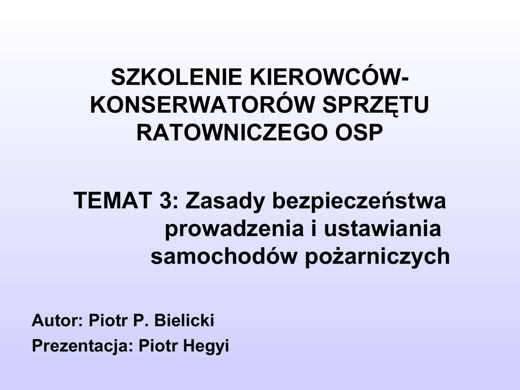 SZKOLENIE KIEROWCÓWKONSERWATORÓW SPRZĘTU RATOWNICZEGO OSP TEMAT 3: Zasady bezpieczeństwa prowadzenia i ustawiania samochodów pożarniczych Autor: Piotr P. Bielicki Prezentacja: Piotr Hegyi Co oznacza posiadanie uprzywilejowania w ruchu Kierujący pojazdem może, pod warunkiem zachowania szczególnej ostrożności nie stosować się do: przepisów o ruchu pojazdów, przepisów o zatrzymywaniu i postoju, znaków i sygnałów drogowych. Obowiązany jest jednak stosować się do poleceń i sygnałów dawanych przez osoby kierujące ruchem lub upoważnione do jego kontroli bądź do wskazówek osób wyznaczonych do pilotowania przybywających jednostek ratowniczych. Obowiązki zastępu zadysponowanego do akcji Jednostka skierowana do akcji ma obowiązek do niej dojechać. Odwołać może ją tylko właściwe dla niej stanowisko kierowania. Zastęp ma obowiązek wykazać pełną inicjatywę w pokonywaniu napotkanych trudności na trasie dojazdu jak np.: zaspy śnieżne, piaszczyste i błotniste drogi, wiatrołomy, zadymienia drogi itp. Każdy przymusowy postój podczas drogi, jak i czas podjęcia jazdy powinien być zgłoszony do właściwego stanowiska kierowania. Zasady ustawienia pojazdów na miejscu zdarzenia O wyborze miejsca ustawienia pojazdu decyduje dowódca zastępu, mając na uwadze taktyczne potrzeby akcji i techniczne możliwości wykonania zadań. Nie bez znaczenia może być sugestia kierowcy w przypadku możliwego błędu. Jeżeli dowódca wyraźnie nie określił miejsca zatrzymania, wówczas o jego wyborze decyduje samodzielnie kierowca. Pojazd należy ustawić w punkcie dogodnym do prowadzenia działań, umożliwiającym swobodną jego obsługę, a także swobodę manewrowania nim. Musi to być miejsce bezpieczne, w którym pojazd nie będzie narażony na uszkodzenia termiczne i mechaniczne. Zasady ustawienia pojazdów na miejscu zdarzenia Pojazd nie może tarasować dróg dojazdowych i dostępu do obiektu. Samochody specjalne ustawia przewidzianego ich użycia. się w miejscach Sygnały świetlne pozostają przez czas akcji włączone. Powinniśmy ustawić pojazd w miejscu i w warunkach, w których jest on z dostatecznej odległości widoczny dla innych kierujących i nie powoduje zagrożenia bezpieczeństwa ruchu drogowego lub jego utrudnienia. Zabrania się postoju: w miejscu utrudniającym wjazd lub wyjazd, w szczególności do i z bramy, garażu, parkingu lub wnęki postojowej. Zasady ustawienia pojazdów na miejscu zdarzenia Zwrócić musimy też uwagę na ruch spalin, by nie powodowały one dodatkowego niebezpieczeństwa dla poszkodowanych, a i dla ratowników. Nie wolno pozostawiać na drodze przedmiotów, które mogłyby zagrozić bezpieczeństwu ruchu; a jeżeli jednak jest to konieczne, to należy je oznaczyć w sposób widoczny w dzień i w nocy. Pojazdy ustawiamy w sposób zapewniający ochronę ich i ratowników, swobodne poruszanie się ratowników i opuszczenie terenu przez poszkodowanych (uczestników zdarzenia). Zasady ustawienia pojazdów na miejscu zdarzenia W przypadkach gdy nie ma możliwości zablokowania ruchu innych pojazdów, samochody pożarnicze ustawia się skośnie do osi jezdni osłaniając miejsce akcji i pracujących ratowników. Przy zdarzeniach z materiałami niebezpiecznymi podjeżdżamy lub podchodzimy z zachowaniem szczególnej ostrożności od strony zawietrznej (z wiatrem i to nie tylko dlatego by uniknąć kontaktu z owymi substancjami, często na tym etapie działań jeszcze nierozpoznanymi, ale też nie spowodować ewentualnego zapłonu). Być może, że jazdę trzeba będzie kontynuować w sprzęcie ochrony dróg oddechowych. Przykładowe ustawienia pojazdów na miejscu zdarzenia – pożar budynku leżącego wzdłuż ulicy Przykładowe ustawienia pojazdów na miejscu zdarzenia – pożar budynku położonego przy skrzyżowaniu ulic Przykładowe ustawienia pojazdów na miejscu zdarzenia – pożar w ciasnej zabudowie miejskiej Przykładowe ustawienia pojazdów na miejscu zdarzenia – zablokowanie pasa ruchu Przykładowe ustawienia pojazdów na miejscu zdarzenia – zabezpieczenie całej szerokości ulicy podczas ewakuacji budynku Przykładowe ustawienia pojazdów na miejscu zdarzenia – wypadek środków komunikacji Przykładowe ustawienia pojazdów na miejscu zdarzenia – zdarzenie z materiałami niebezpiecznymi kierunek wiatru ewakuacja min. 50 m zakaz ruchu zakaz ruchu ewakuacja Przykładowe ustawienia pojazdów przy torowiskach Ustawienie pojazdów przy torach tramwajowych (z lewej) z wykorzystaniem rozdzielacza i zbieracza, oraz kolejowych (z prawej) – linia wężowa prowadzona pod torami, pojazdy ustawione nie na torowiskach lecz obok nich. Przykładowe ustawienie pojazdów i zabezpieczenie miejsca akcji w tunelach, pasażach itp. ewakuacja ratownictwo ratownictwo oświetlenie ewakuacja oświetlenie Przykładowe ustawienie pojazdów podczas pożaru na wsi przy normalnej (z lewej) i wąskiej (z prawej) szerokości drogi Zabezpieczenia terenu akcji Teren akcji musi być odpowiednio zabezpieczony. Najprościej jest posłużyć się taśmami foliowymi. Jeżeli nie mamy stojaków, to folię można poprowadzić korzystając ze stojących tam słupków, płotów, drzew itp. Ustawić można trójkąty ostrzegawcze, ostrzegawcze z zasilaniem bateryjnym. światła Wykorzystać można przenośne oznaczenia świetlne z diodami, których aktywacja następuje po ustawieniu w pozycji pionowej. Zabezpieczenia terenu akcji Samochody służb ratowniczych muszą mieć włączone światła alarmowe. Jeżeli zachodzi taka potrzeba również drogowe, nie tylko ostrzegające o trwającej akcji ale i oświetlające pole pracy. W celu oświetlenia pola pracy należy wysunąć maszty oświetleniowe. Nocą musimy zwrócić uwagę, że punkty świetlne, jakie zmuszeni będziemy ustawić na drodze lub w jej pobliżu nie mogą wysyłać światła w sposób powodujący oślepienie albo wprowadzający w błąd uczestników ruchu. Zabezpieczenia te
